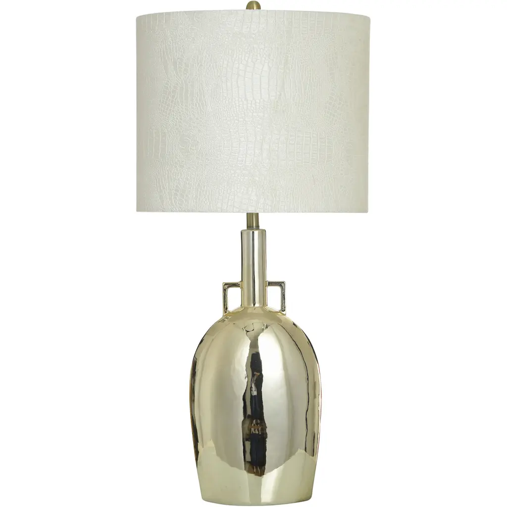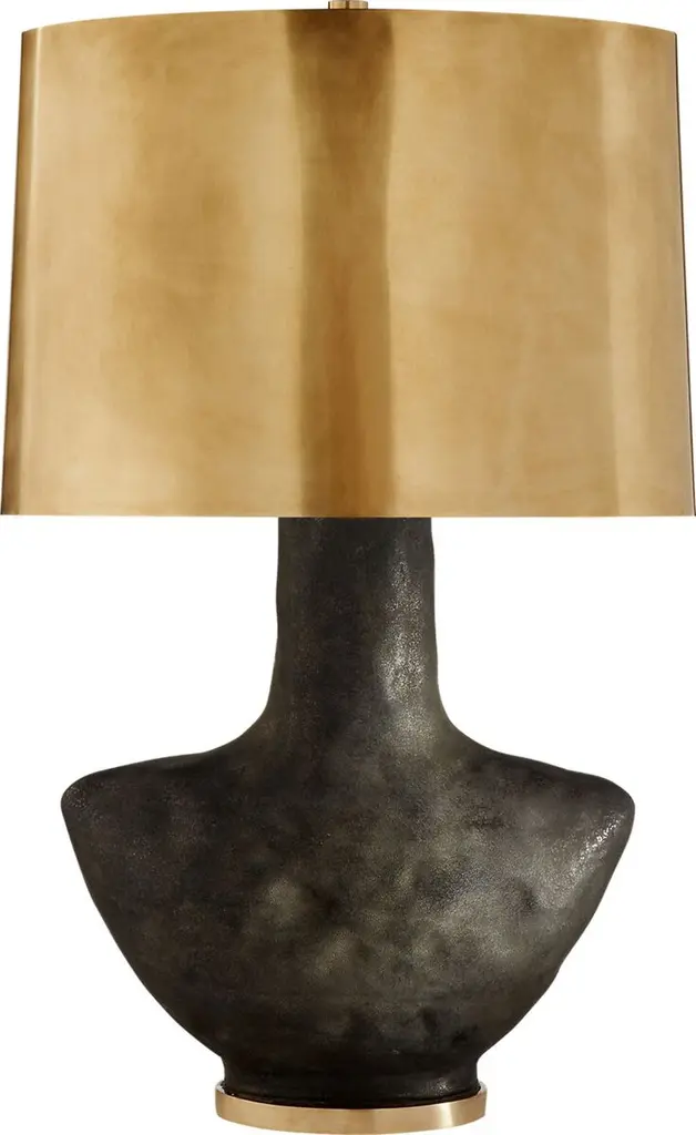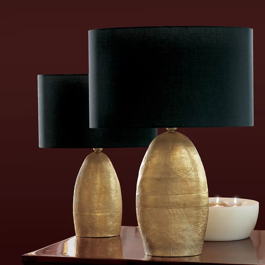 A stunning combination of contrasting materials, textures, and colors creates a timeless masterpiece to be showcased in a modern or traditional home not only as a functional table lamp but as superb sculpture. The black fabric drum-shaped shade tops a stunning base in metal with a brass finish that boasts an organic texture of mesmerizing visual allure. The timeless combination of gold and black is eye-catching and elegant.