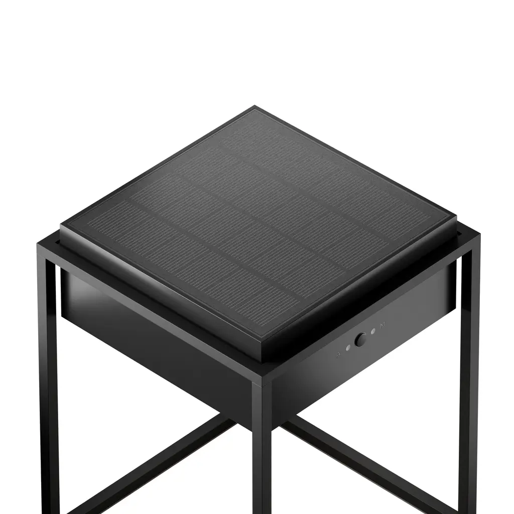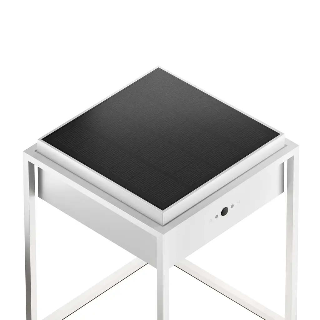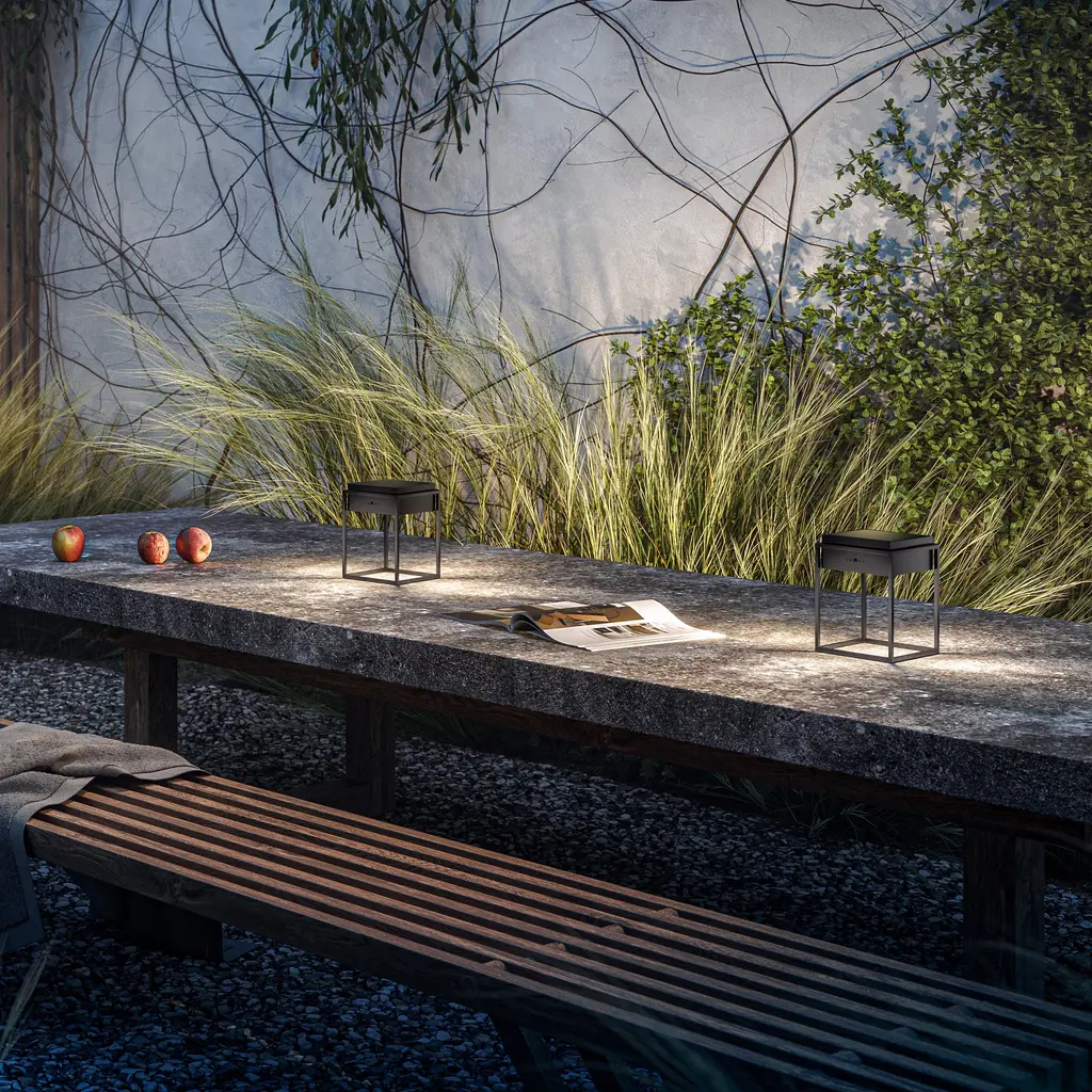 The Qua Table Lamp is a portable, solar-powered luminaire designed for outdoor use, with its compact size and IP65 rating offering resistance to dust and water. It features a 3-step dimming system and can be set to either manual or automatic mode, where it automatically turns on at dusk for up to 5 hours. The lamp is available in three colorsbright bronze, jet black, and pearl whiteand can be charged via USB-C or solar energy.