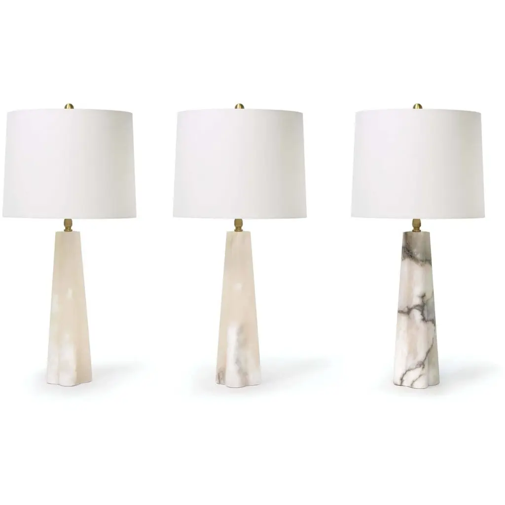 Unusually lightly colored, translucent, and soft stone, alabaster has been used throughout history primarily for carving decorative artifacts. A tapered alabaster base juxtaposed with a traditional drum shade makes this lamp a beautifully well-balanced source of light and style.