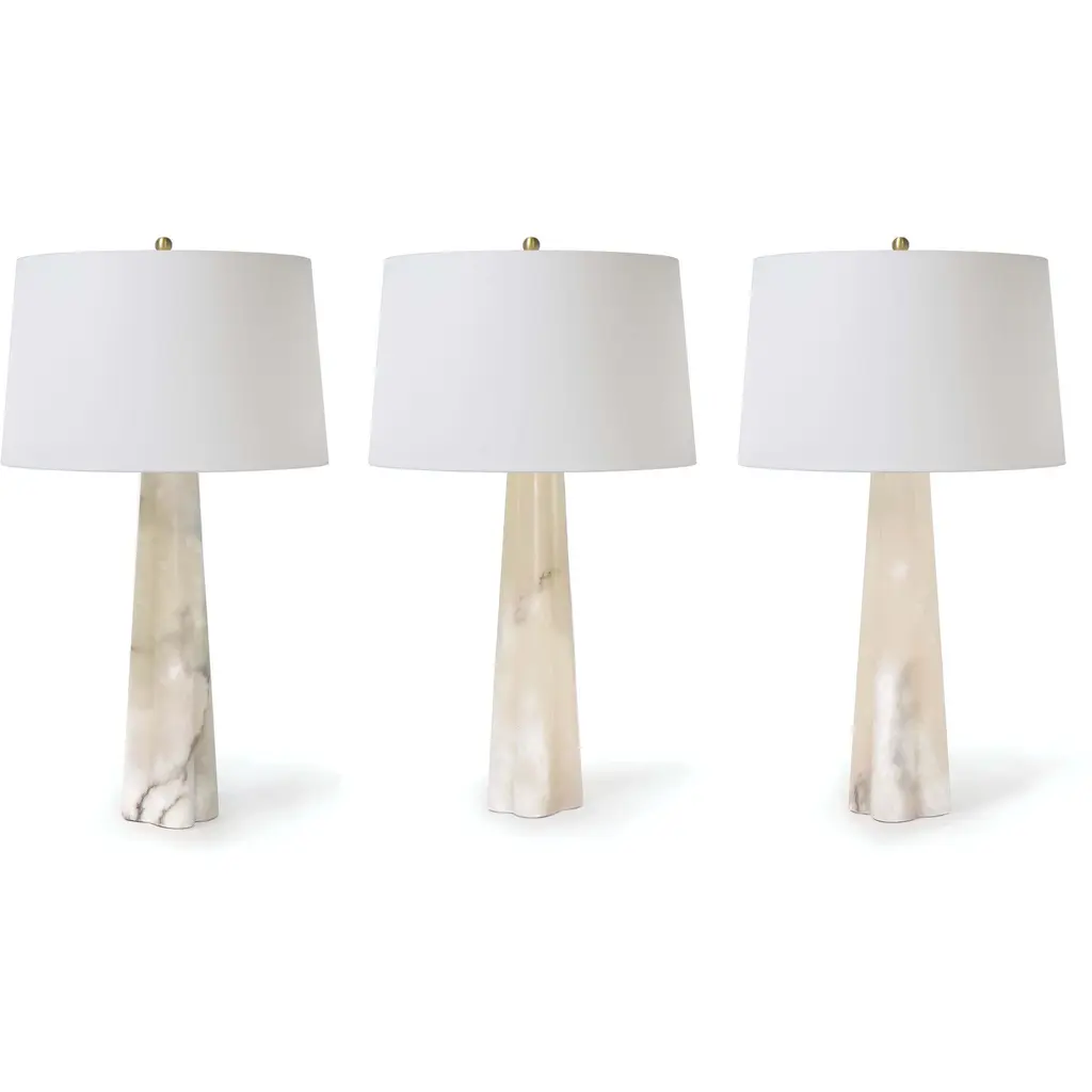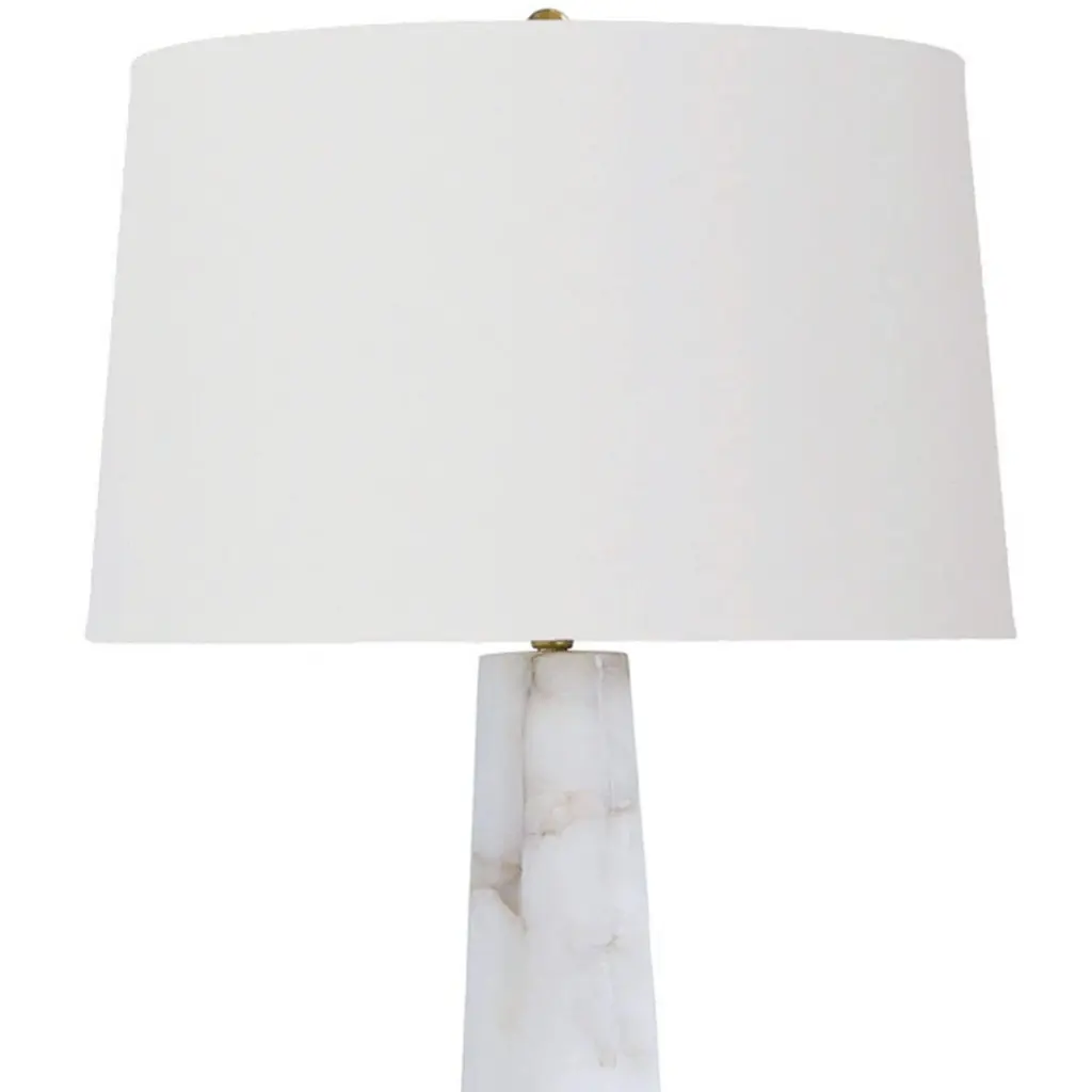 Unusually lightly colored, translucent, and soft stone, alabaster has been used throughout history primarily for carving decorative artifacts. A tapered alabaster base juxtaposed with a traditional drum shade makes this lamp a beautifully well-balanced source of light and style.