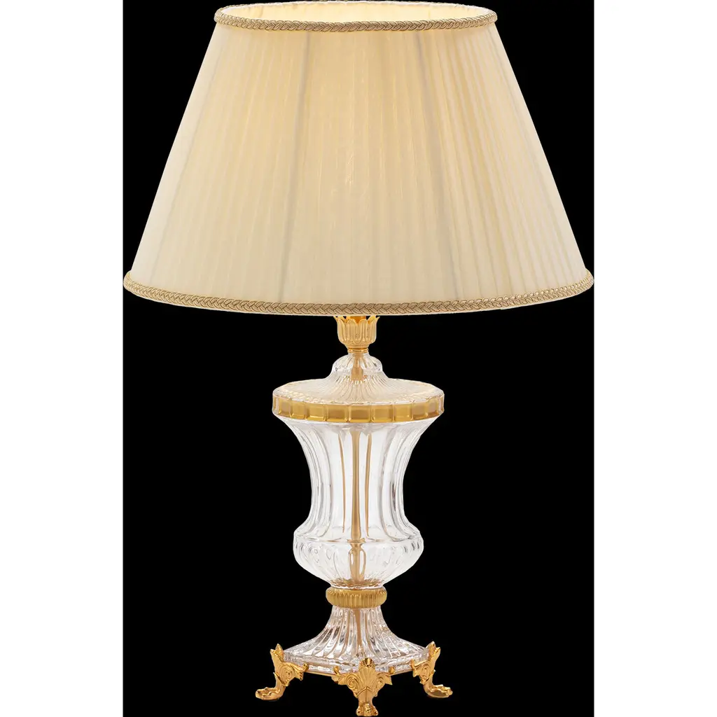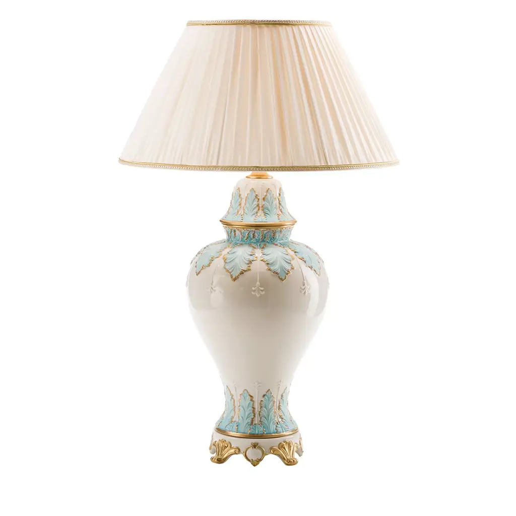 Exuding pure classic opulence with its fine porcelain silhouette rich in ornate details, this table lamp will be an impeccable addition on top of desks or sideboards in luxurious, classic homes. Bright accents of gold embellish the entire silhouette, from the footed base to the decorative garlands, passing through the acanthus-leaves-shaped handles. A fancy pleated fabric lampshade with flowery hems completes the design.