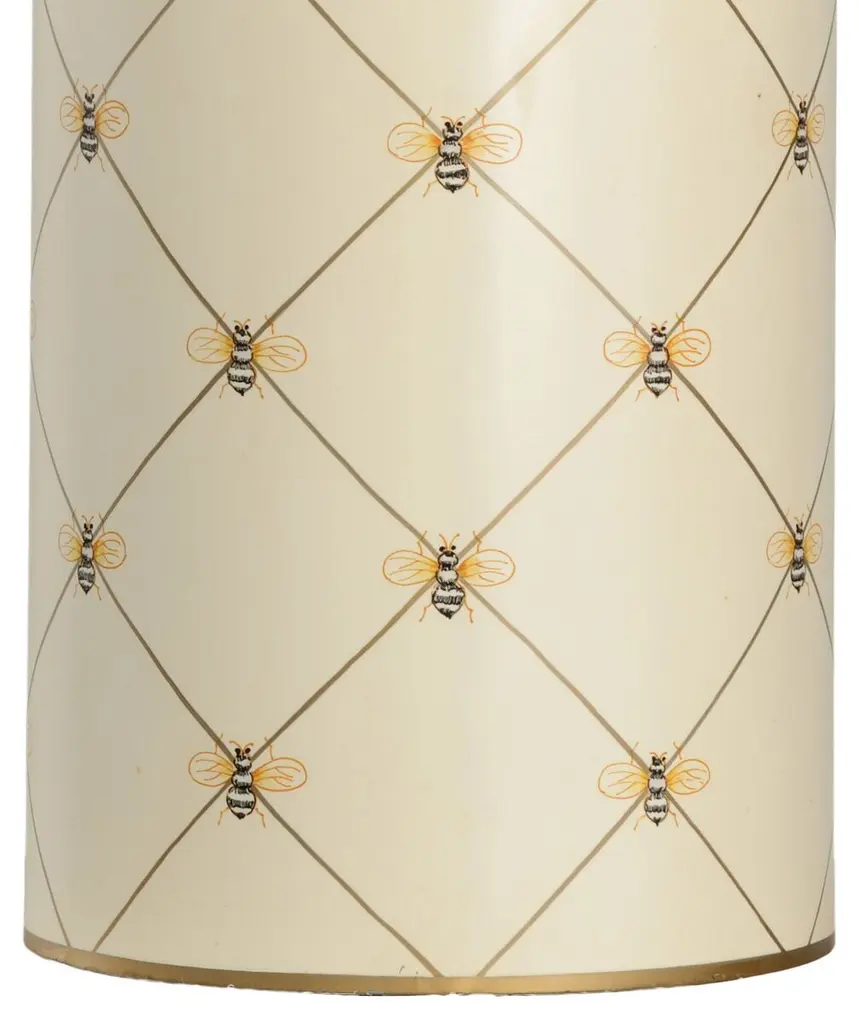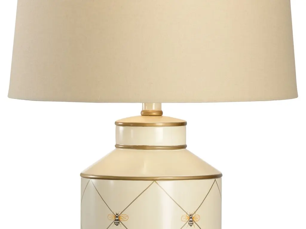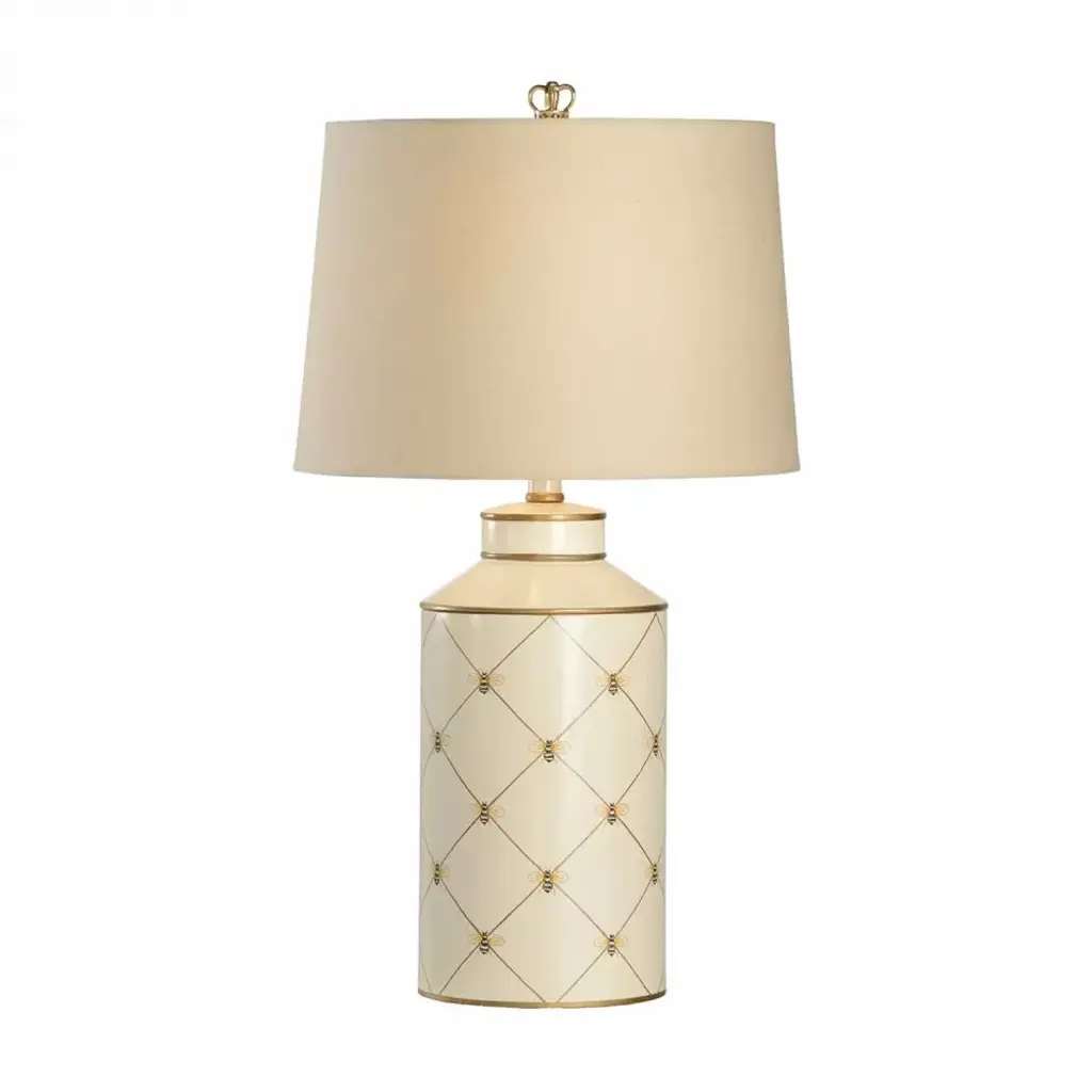 Hand-painted bee motifs lend this otherwise neutral-hued table lamp design a hint of quiet country charm. Crafted of ceramic and topped with a linen barrel shade and brass finial.