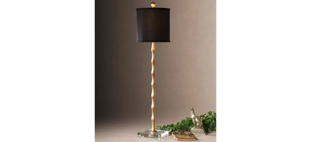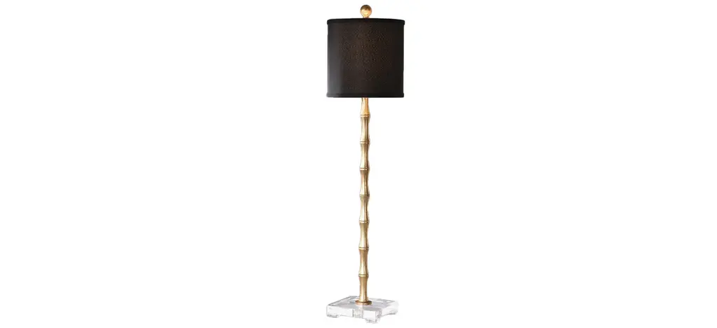 Metal bamboo finished in a lightly antiqued gold leaf accented with a crystal foot. The round hardback drum shade is a crisp black linen fabric.