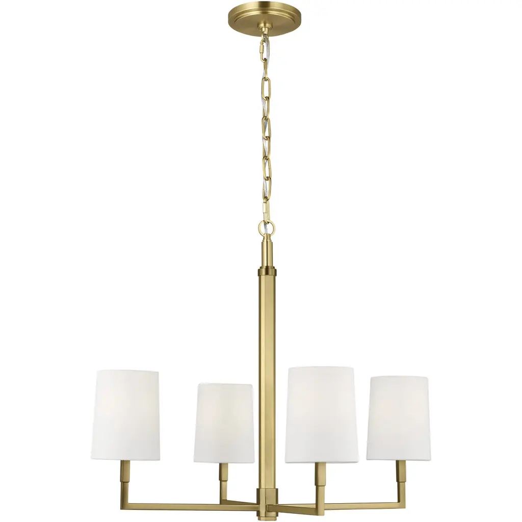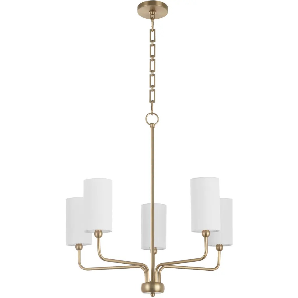 Collection: Charlotte, Material: Steel, Finish Color: Aged Brass, Width: 27", Height: 27.5", Hanging Method: Chain, Lamping Type: Incandescent, Number Of Bulbs: 5, Wattage: 300 Watts, Moisture Rating: Damp Rated, Desc: Tamara Day�s signature style, �laid back luxe,� comes to life in the Charlotte series of chandeliers, wall mounts, and vanity lights inspired by three homes on Charlotte Street. Tamara�s trademark approach to design manifests in timeless silhouettes of a classically shaped frame modernized with subtle curves echoed by spherical details. Instinctive movement is exhibited by arms that round corners to connect to an elongated main stem. The frame is suspended from a chain with rectangular links that alternate sizes of large and small. An effortlessly sleek circular canopy anchors the ensemble in transitional warmth. Candelabra sockets are concealed by white linen drum shades that parallel enduring finishes of matte black or aged brass. Customize the height by adjusting the