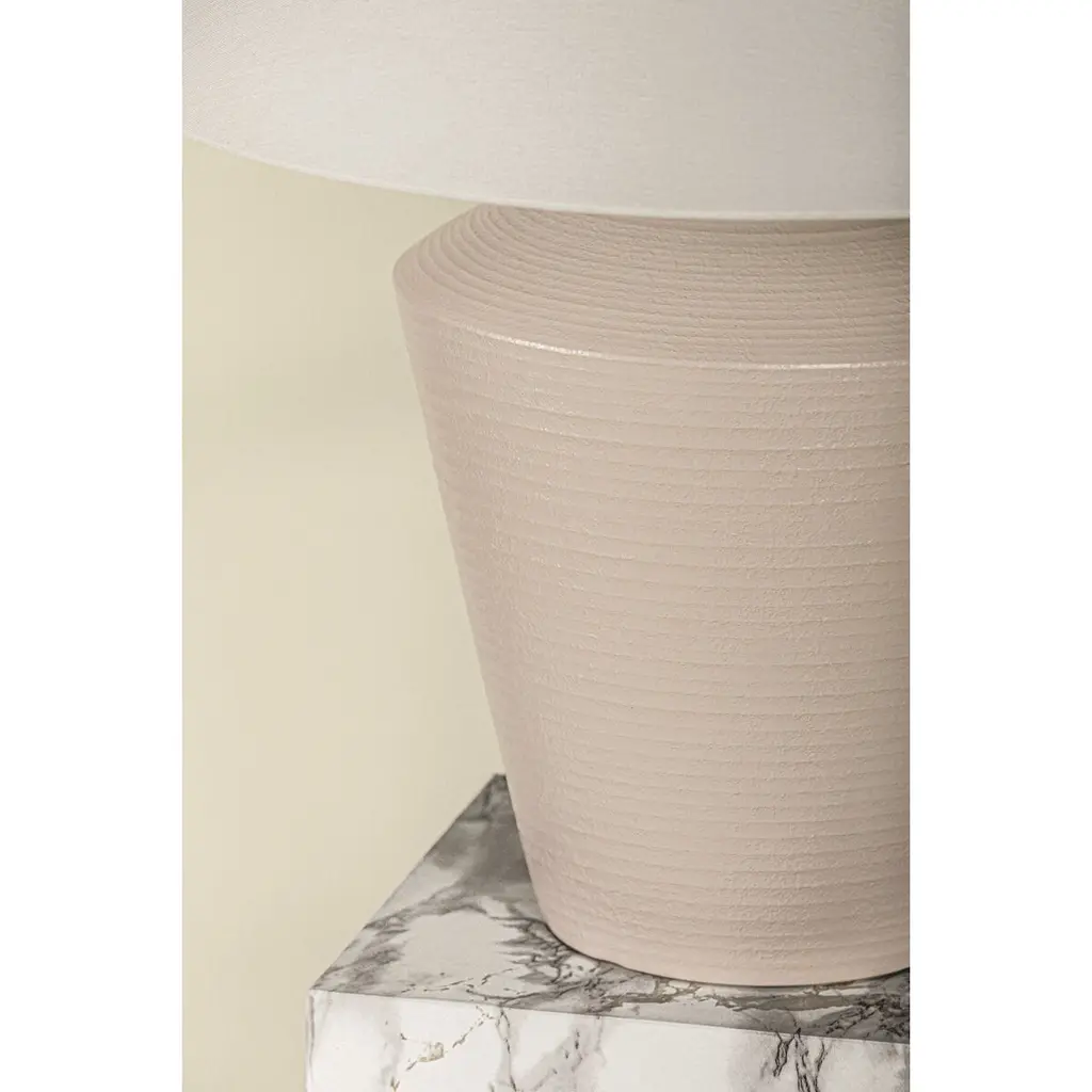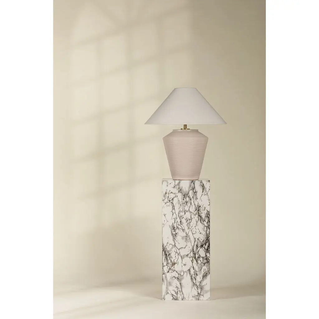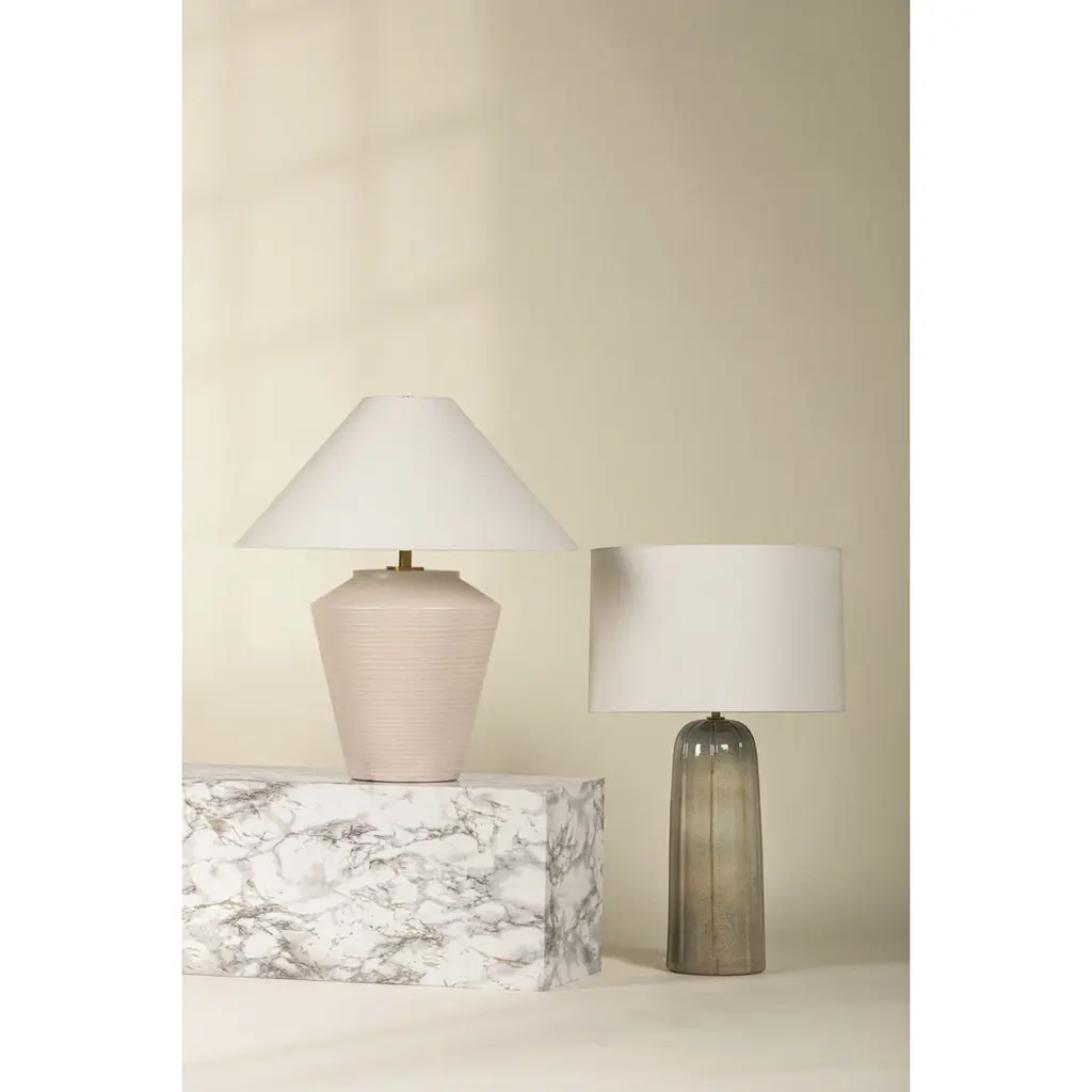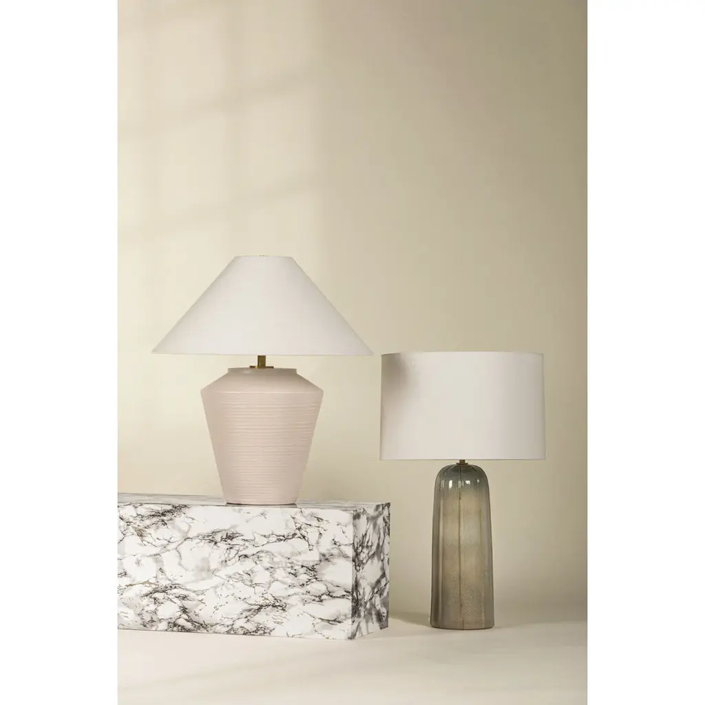 Inspired by raw beauty of the desert, this whitewashed terracotta table lamp is calm andrefreshing. The textural body contrasts beautifully with the angular tapered white linen shade.An Aged Brass frame provides a surprising metallic finish. Part of THELIFESTYLEDCO®collection.