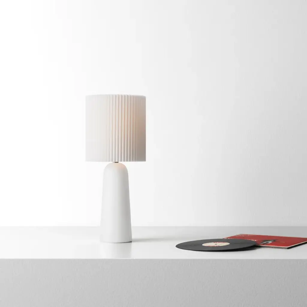 Less is more! With a casual and elegant design, the 26" tall Racine table lamp complements elegant, Scandinavian dcor. The 6" diameter dome base features clean lines and black ceramic construction while the white pleated fabric drum shade adds an elegant design touch. Operated by a rotary socket switch to easily turn the 100W bulb on or off, the table lamp is also powered by a 5' clear cord. For a variety of style options, the Racine table lamp is also available with a three-color ceramic base.
