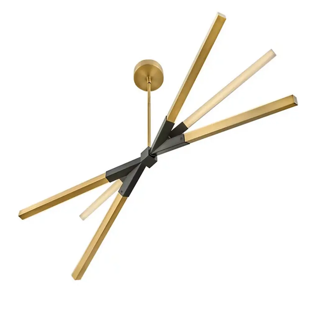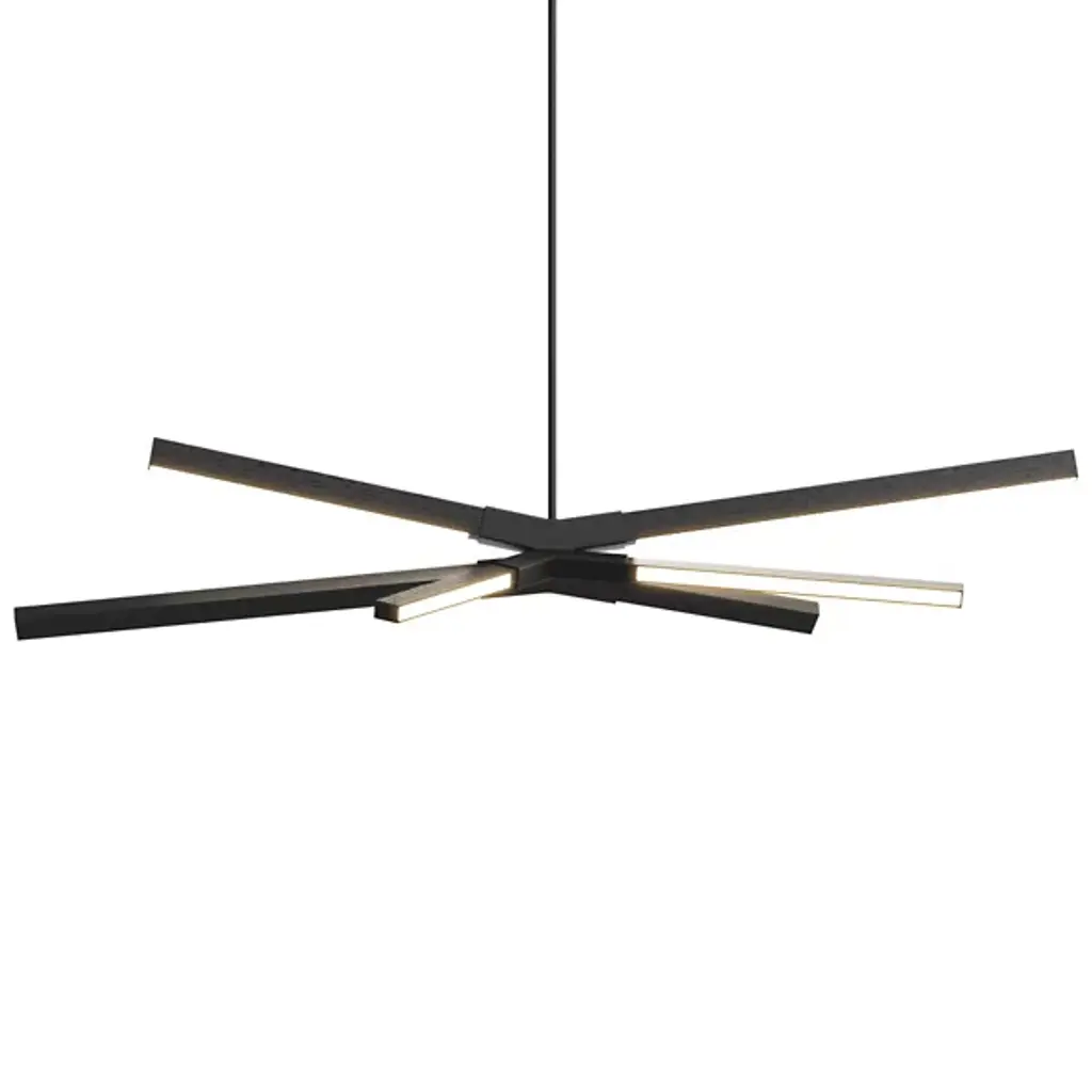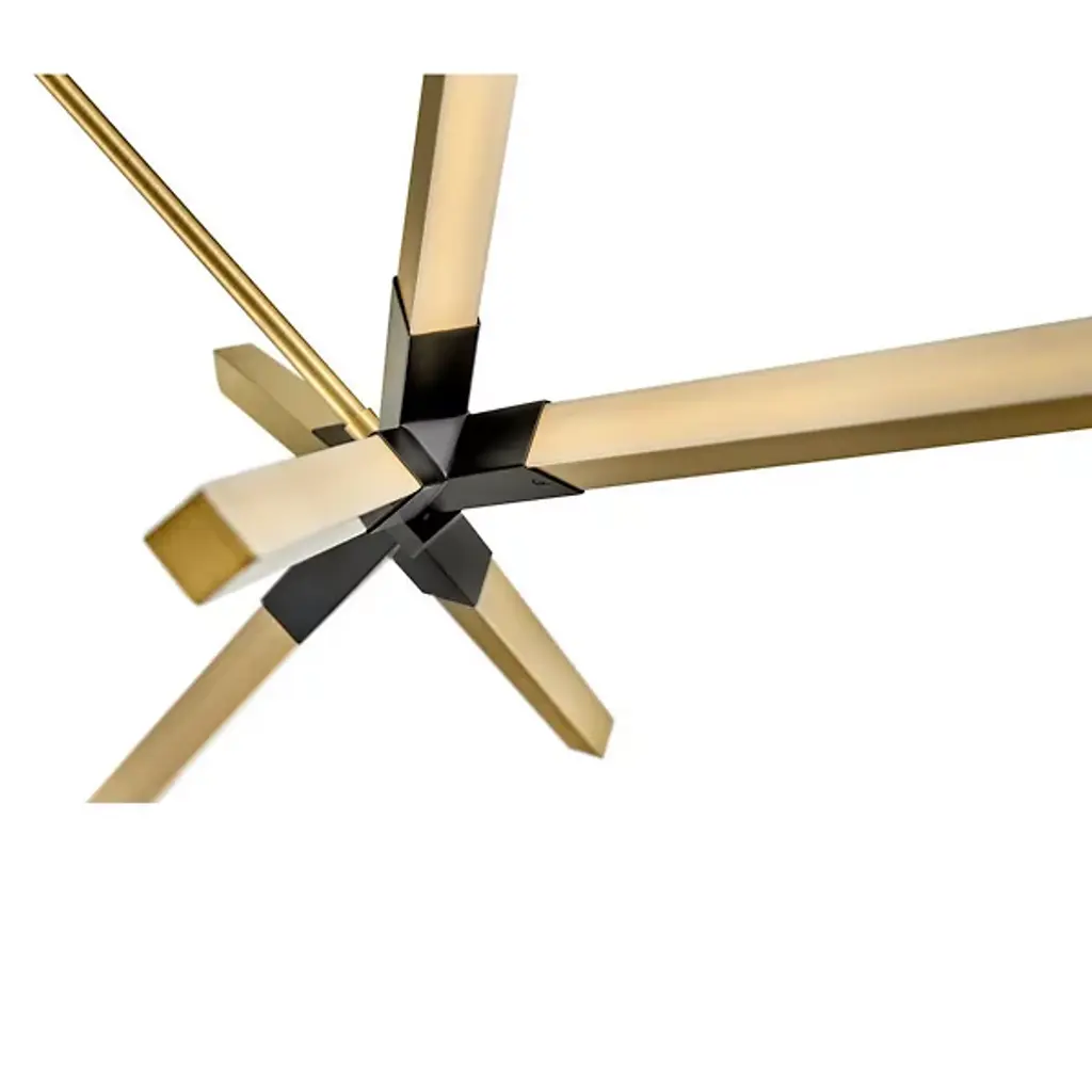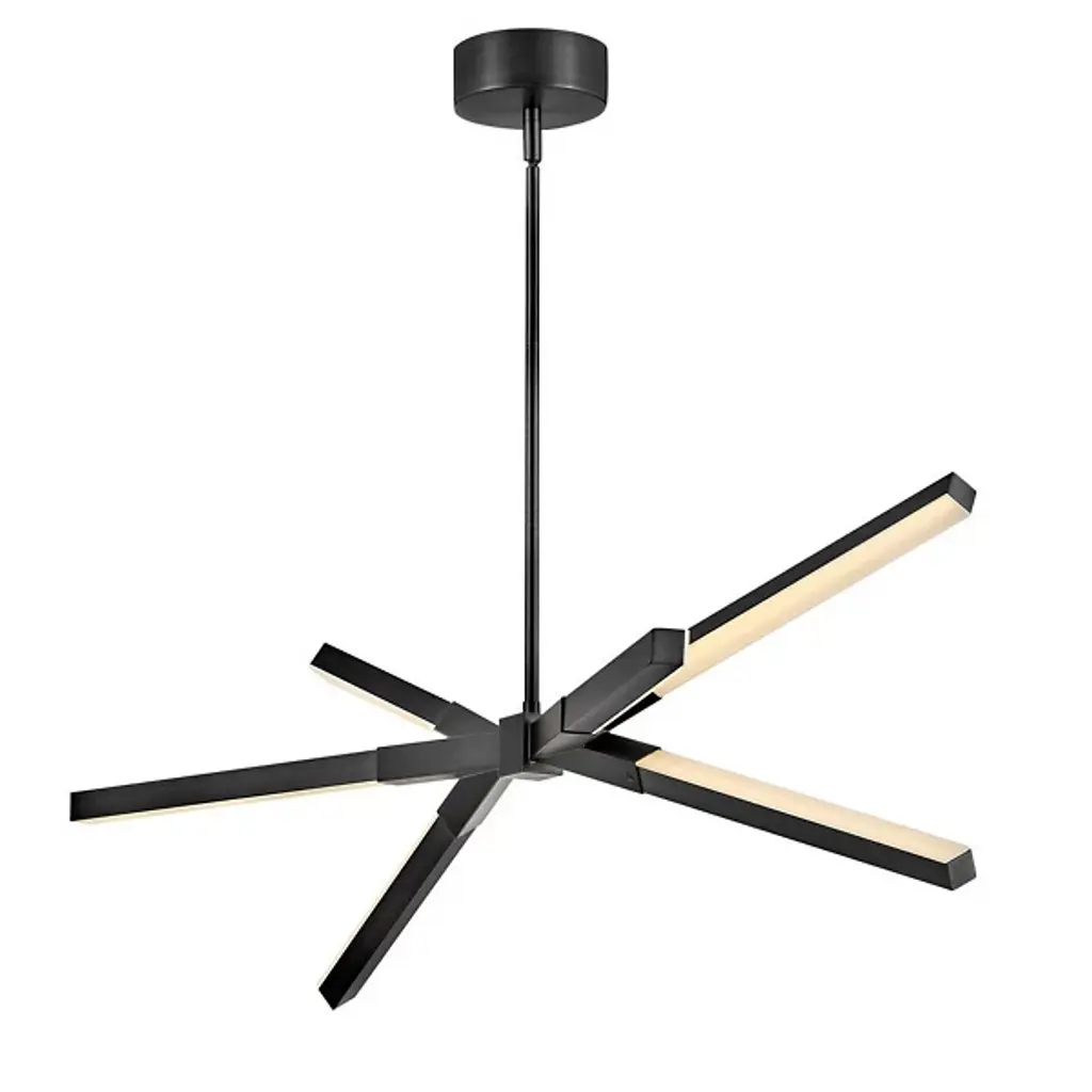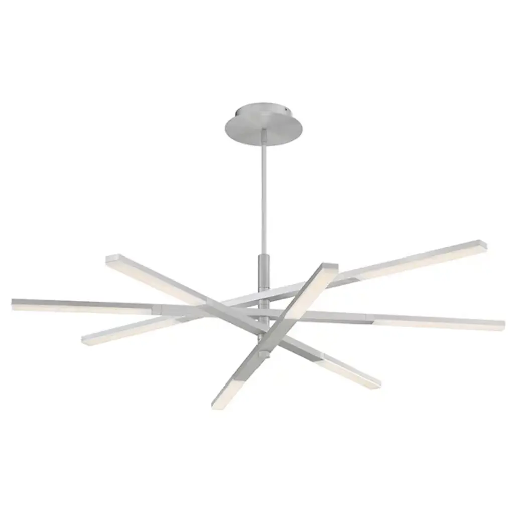 Bring a daring, abstract appeal to inside ceilings with the open, angular form of the Rae LED Chandelier from Fredrick Ramond. A thick disc canopy secures the fixture from above, transmitting a slim central stem down to a small, blocky hub. Steel rectangular sleeves extend angular housings out in a starburst array, each one securing strong and energy-friendly lamping beneath a diffuser strip of etched acrylic, sending a warm glow out in all directions.