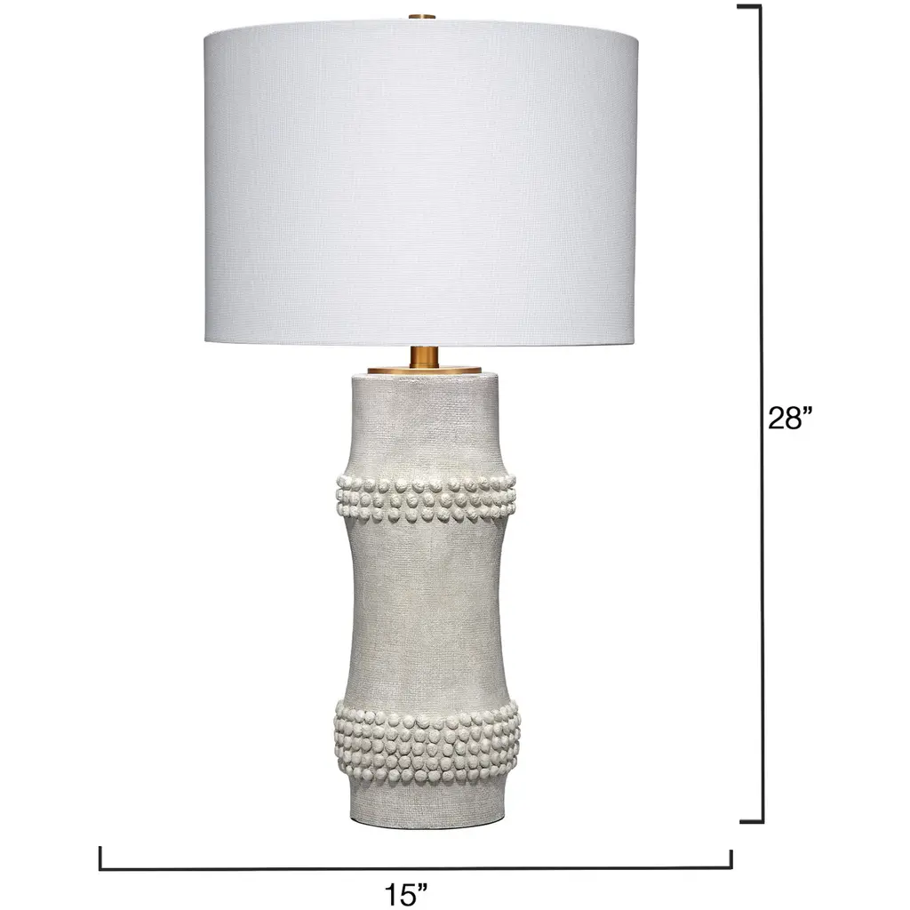 A clean, contemporary take on a classic, the body of this lamp is a minimalistic interpretation of bamboo cane. Ours is unadorned but for a few carefully placed beaded embellishments. The lamps are each handcrafted of resin, with small splashes of brass courtesy of the metal hardware and finial. A white linen drum shade is included.