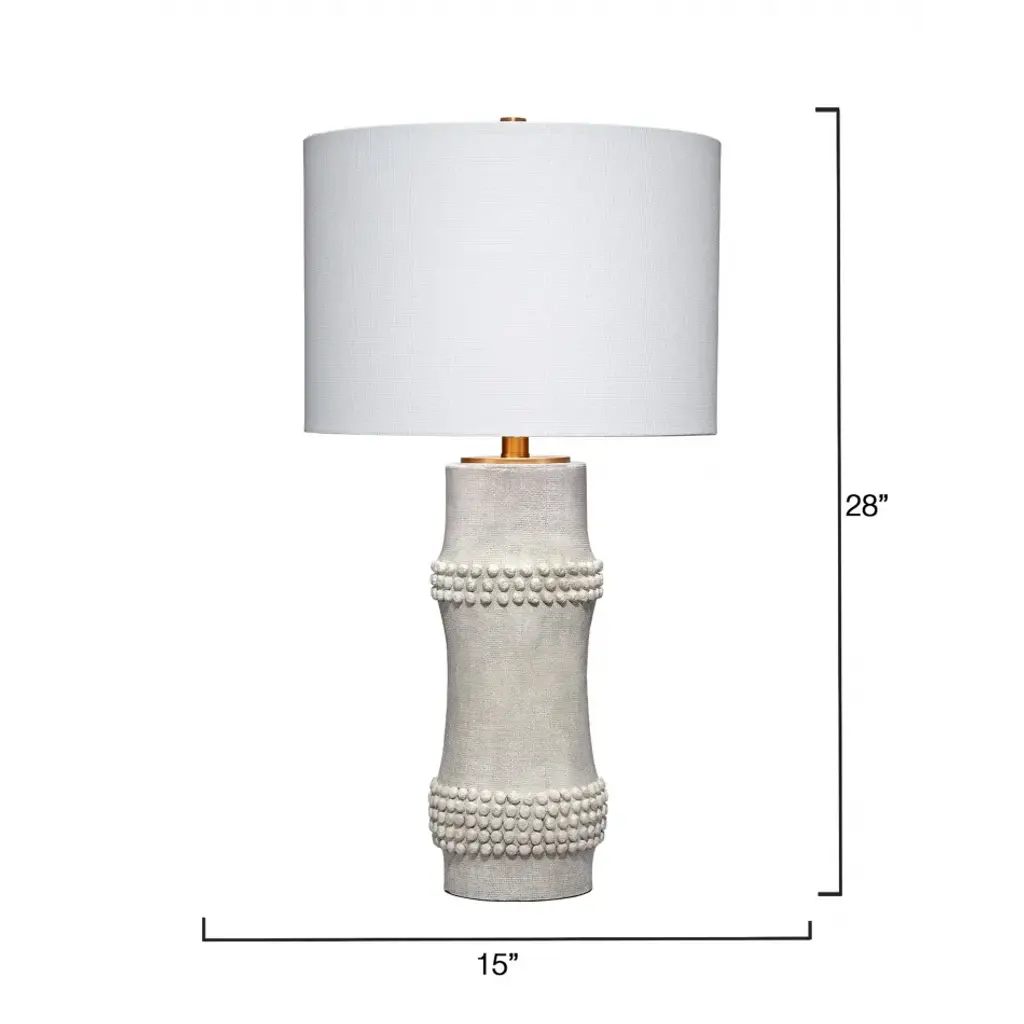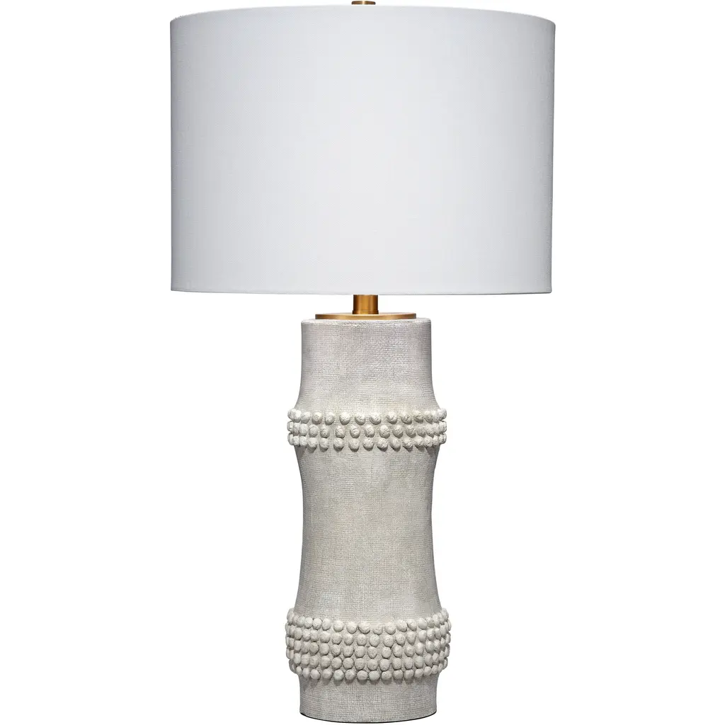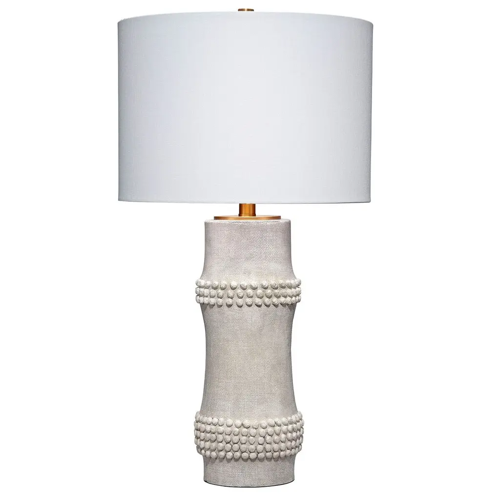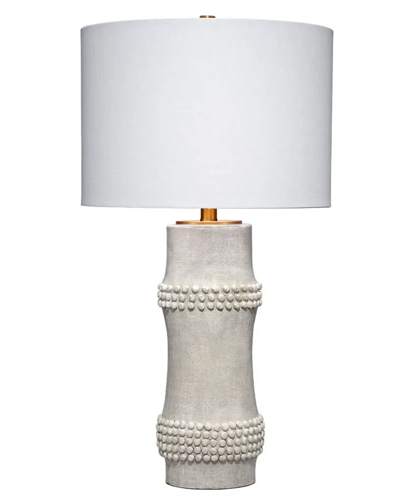 A clean, contemporary take on a classic, the body of this lamp is a minimalistic interpretation of bamboo cane. Ours is unadorned but for a few carefully placed beaded embellishments. The lamps are each handcrafted of resin, with small splashes of brass courtesy of the metal hardware and finial. A white linen drum shade is included.