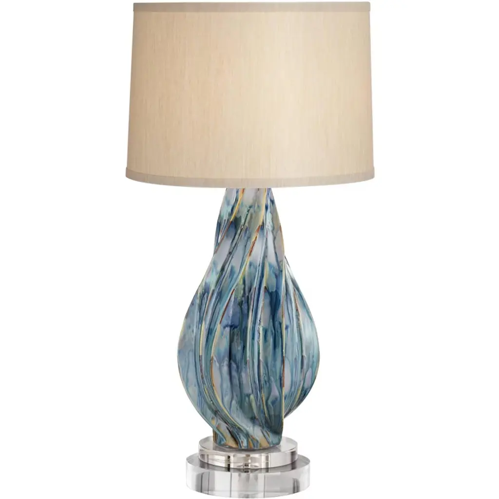 Swaths of blue, green, rust, and sand give the porcelain body of this table lamp a contemporary finesse.