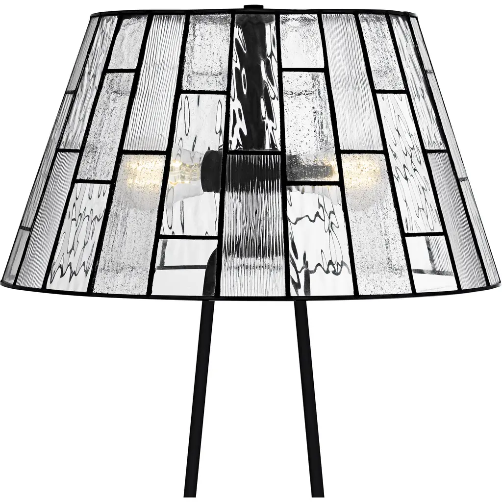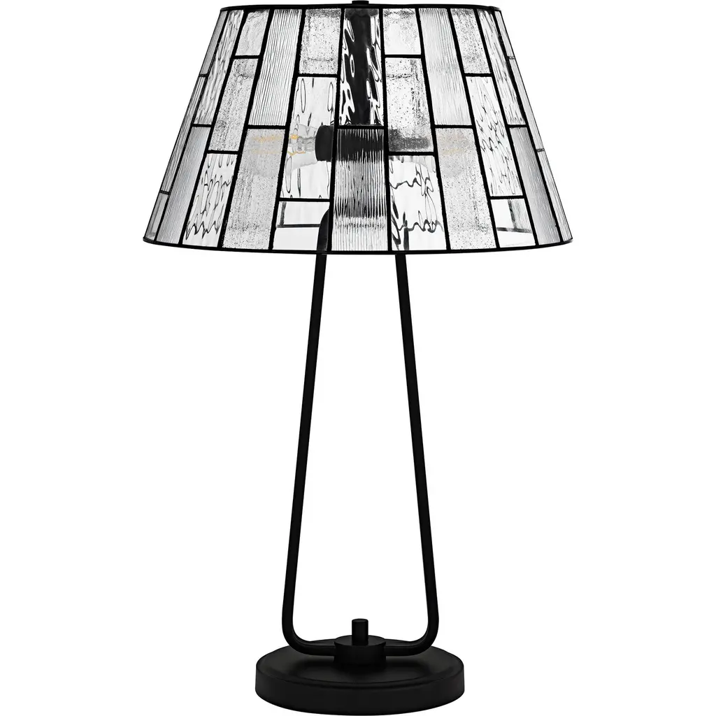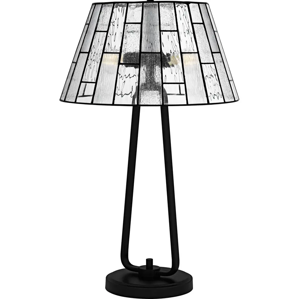 Rainier's traditional design adds simple sophistication to any space. Featuring a matte black finish that enhances its refined silhouette, this table lamp is complemented by Tiffany-inspired multitextured art glass panels, adding depth and visual interest to your décor. Enhance your living room, bedroom, kitchen, or home office with the Rainier table lamp, a perfect blend of classic style and elegance.