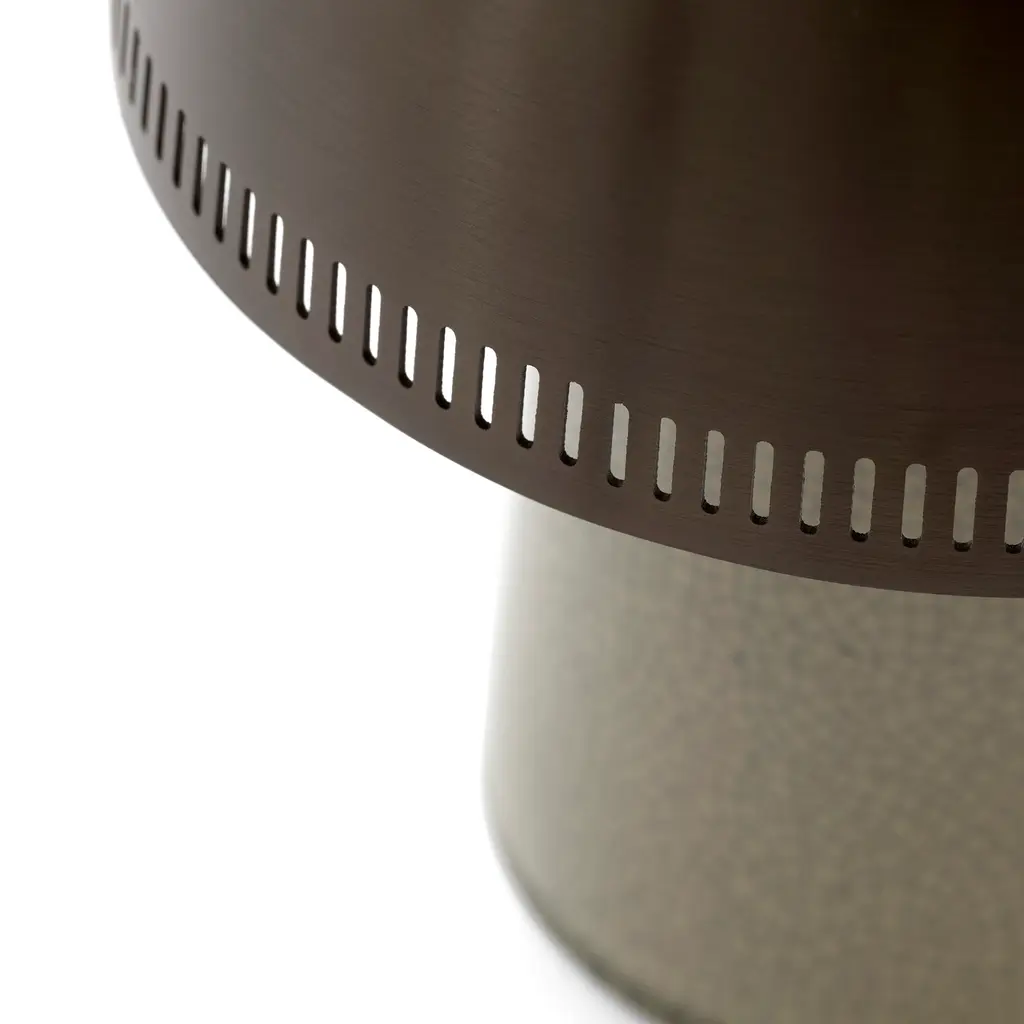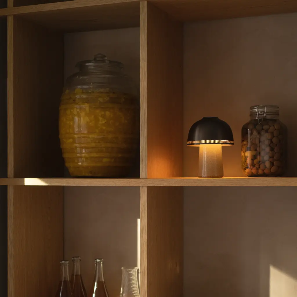 Along with being effortlessly moveable, Raku lends an artisan slant to the concept of a portable table lamp. Named after the traditional Japanese pottery technique, Raku features a hand-sculpted ceramic base with a crackle glaze, varying slightly in each piece. Sebastian Herkner complements the richness of craft with a sleek metal shade with subtle perforated detailing along the rim. “I wanted to design a small and portable lamp with precious materials and an inviting form,” says the designer.