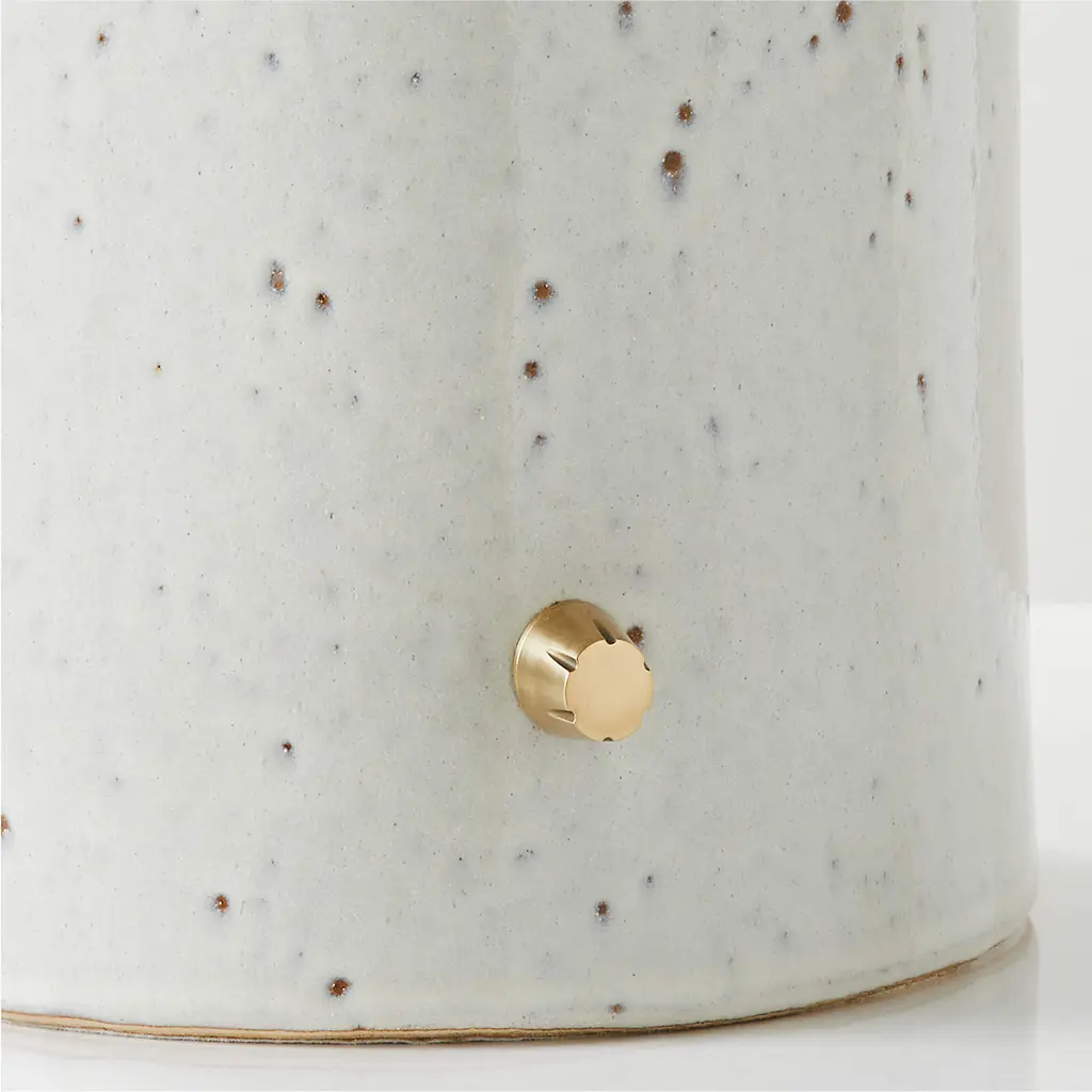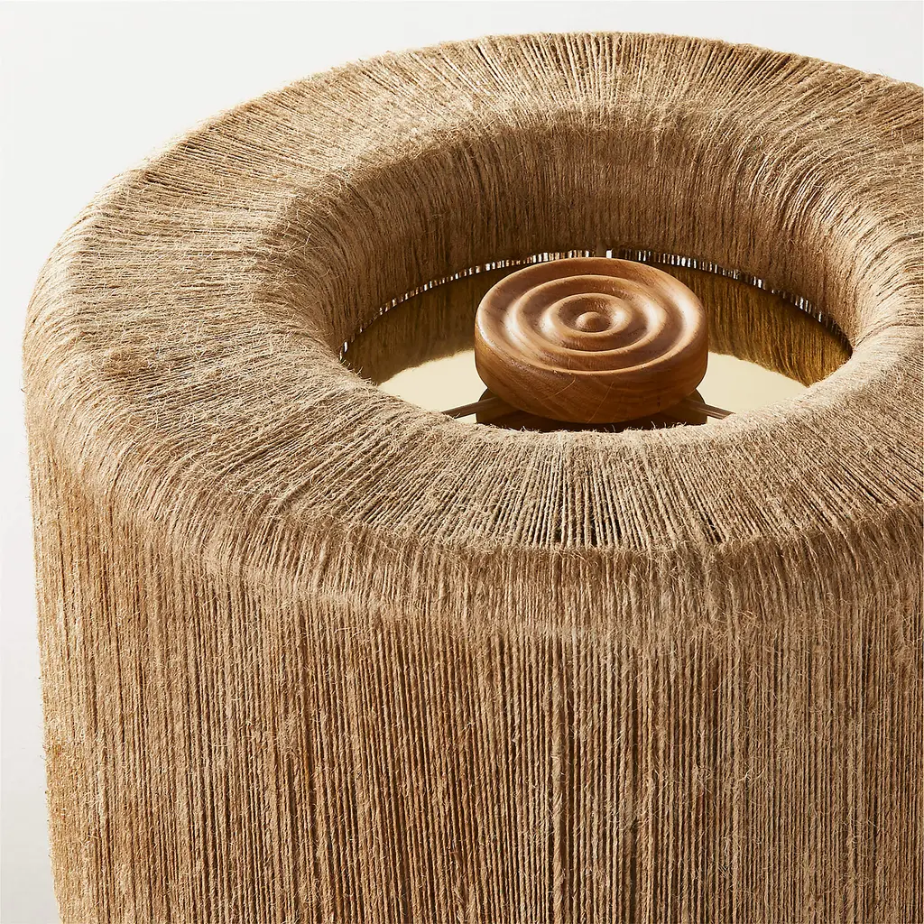Unique materiality and soft curves lend this boldly proportioned table lamp by Kravitz Design a sculptural sensibility. Oversized natural jute shade casts an organic glow atop a ceramic column base finished in a reactive white glaze. After firing, each lamp emerges with a distinctive metallic finish. White oak finial and solid polished brass diffuser round out the details. CB2 exclusive.