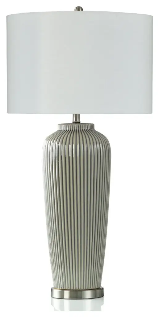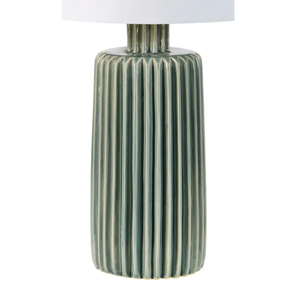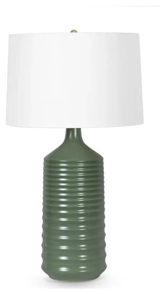 A warm olive tone captivates day or night in this table lamp design. At once current and timeless, clients will find this table lamp feels like the finishing touch in their bedroom, home office, or living space. The ceramic table lamp's ribbed details and off-white shade come together magnificently to offer function and fashion to contemporary and mid-century modern interiors.