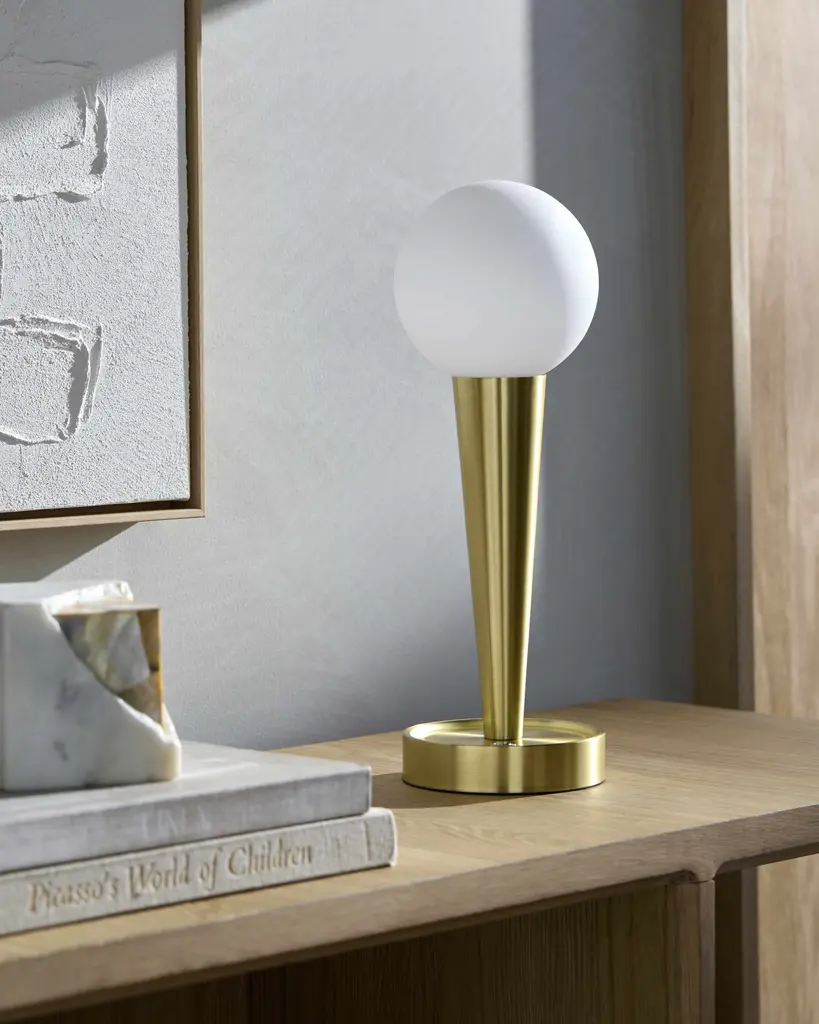 Collection: Ranzanico Colors: Metallic Gold, White, Black Material: Body: Iron,Base: Iron,Shade (Outside): Glass,Shade (Inside): Glass Styles: Contemporary Made In: China Lighting Type: Accent Table Lighting Base: Iron Base Color: Metallic - Gold Shade Material: GlassGlass Shade Color: WhiteWhite Cord Length: 6' Switch Type: On/Off Number of Bulbs: 1 Socket Type: LED Bulb Wattage: 7W