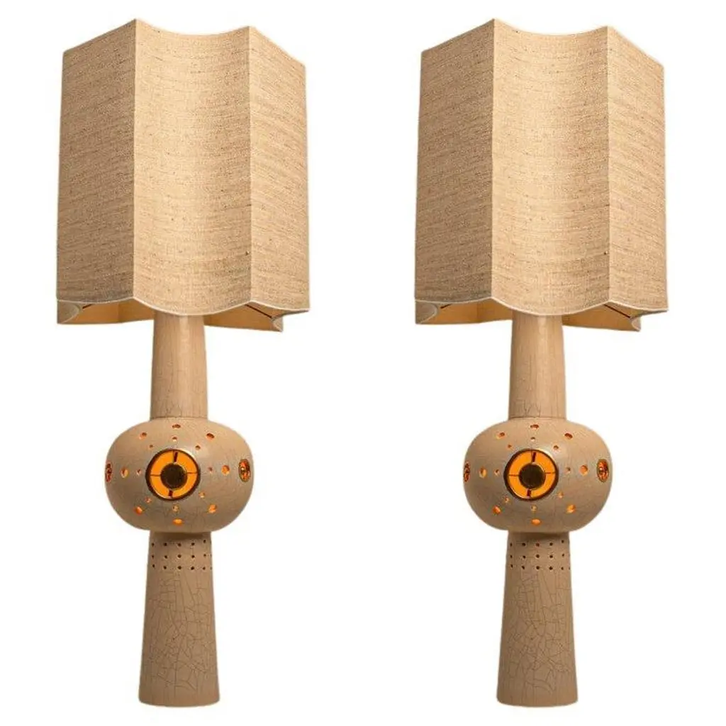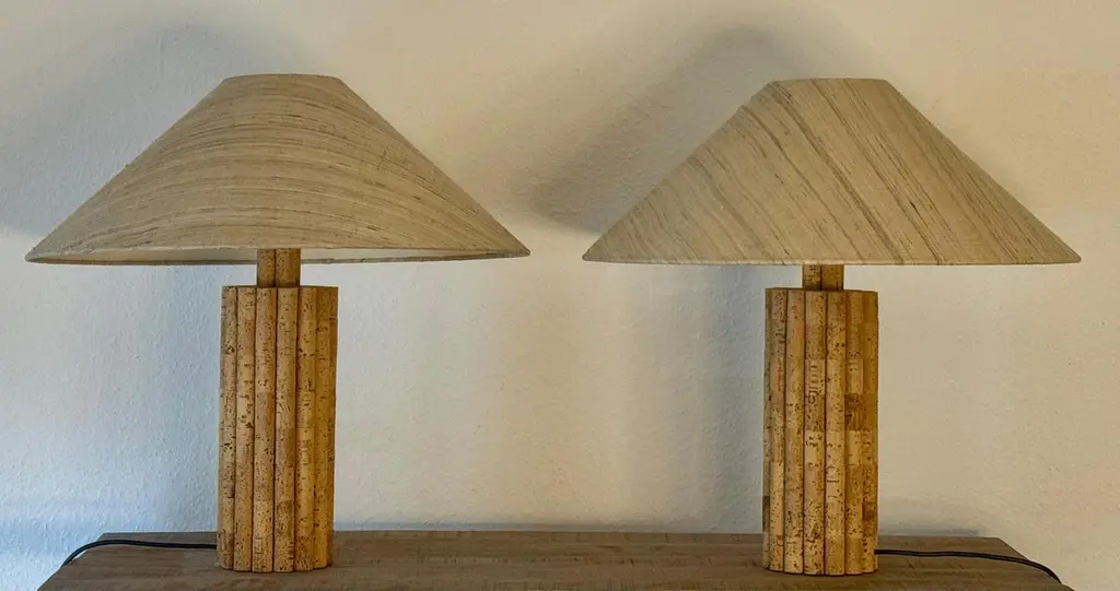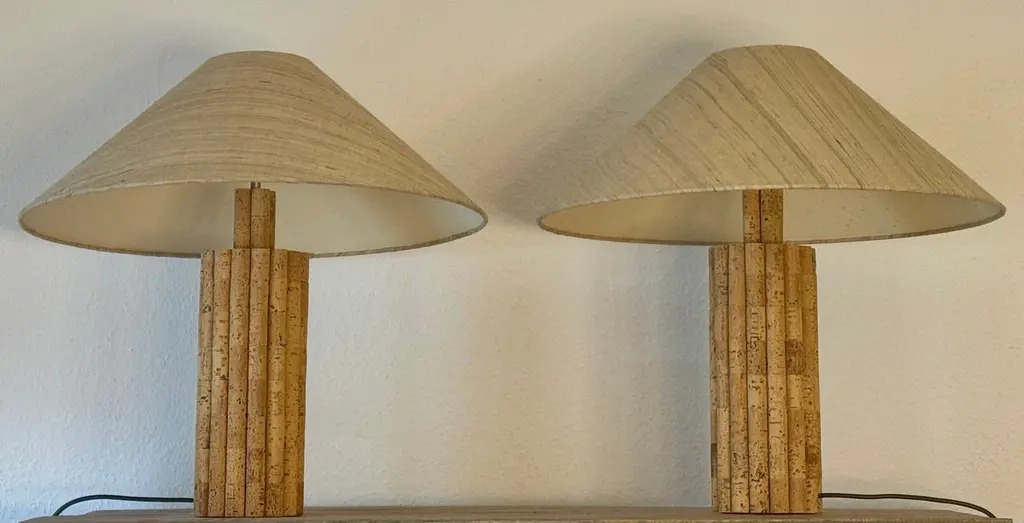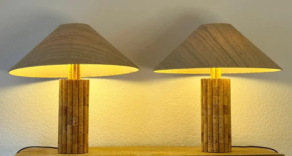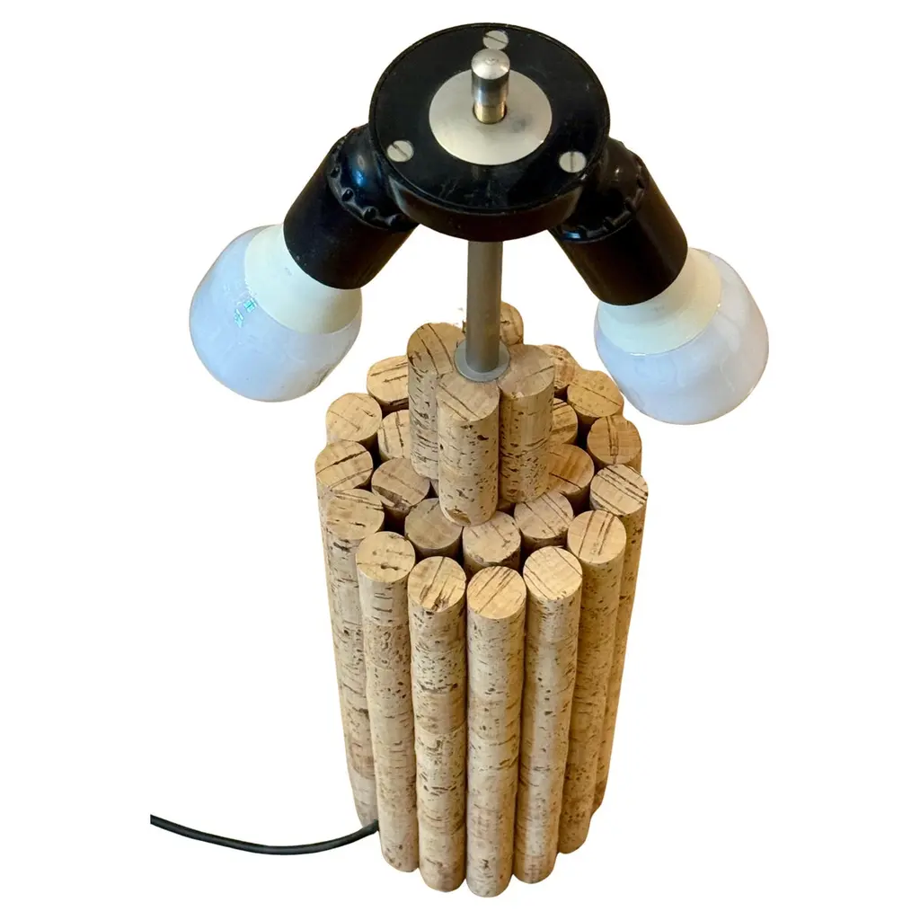 Rare early cork table lamp by Ingo Maurer for Design M, 1970s, Germany. Executed in cork and raw silk shades.Socket: 2 x E27 or E26 (US) for standard screw bulbs. Max. 75 Wattage per bulb.In an excellent vintage condition.(Pair available)