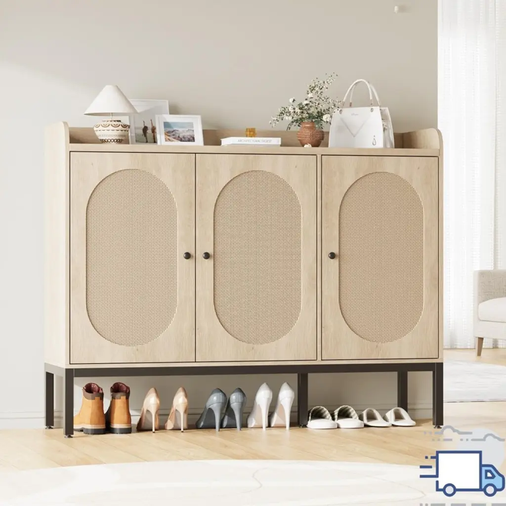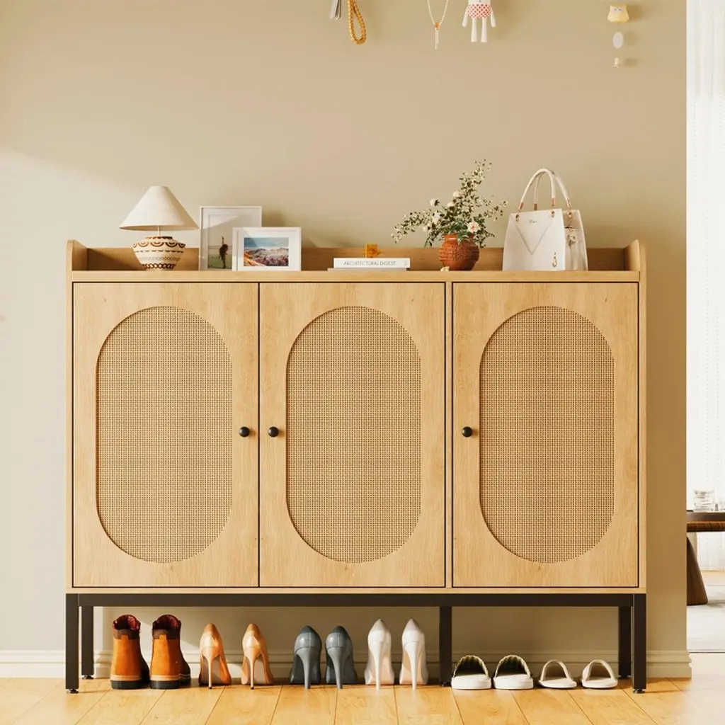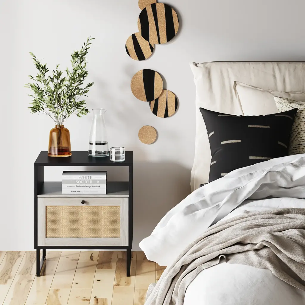 The open design of our set of 2 Mina nightstands make them a great small space solution. The rattan details on the front doors and black finish adds interest and appeal to any room. The Mina nightstands have an open cubby with enough room for some of your favorite reads. The solid metal base and contrasting door pulls create a boho chic feel. Place beside your bed styled with an accent lamp, decorative coasters and personal touches that speak to your aesthetic.