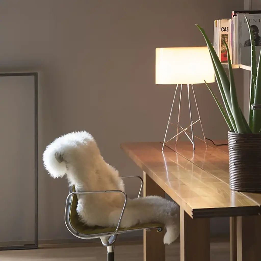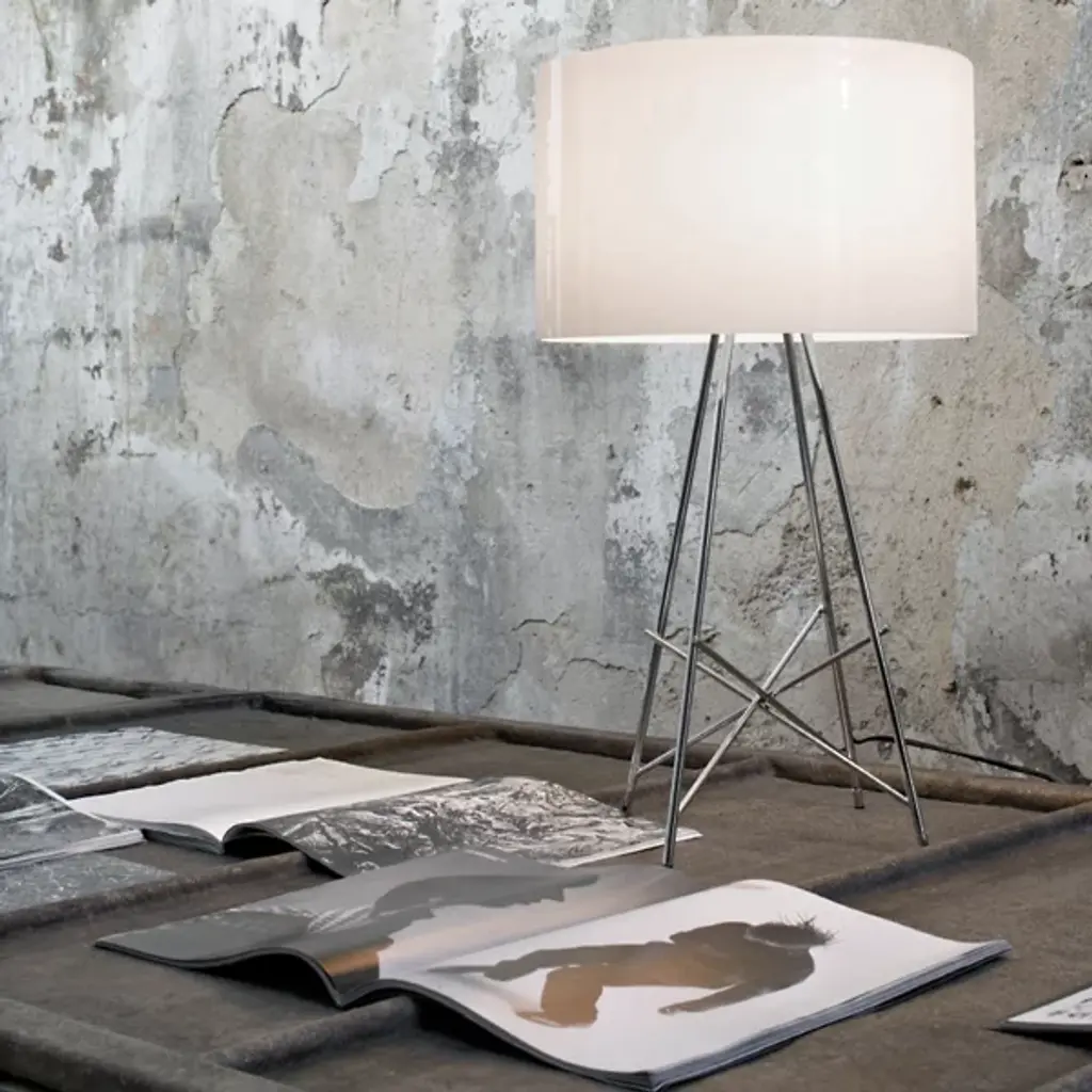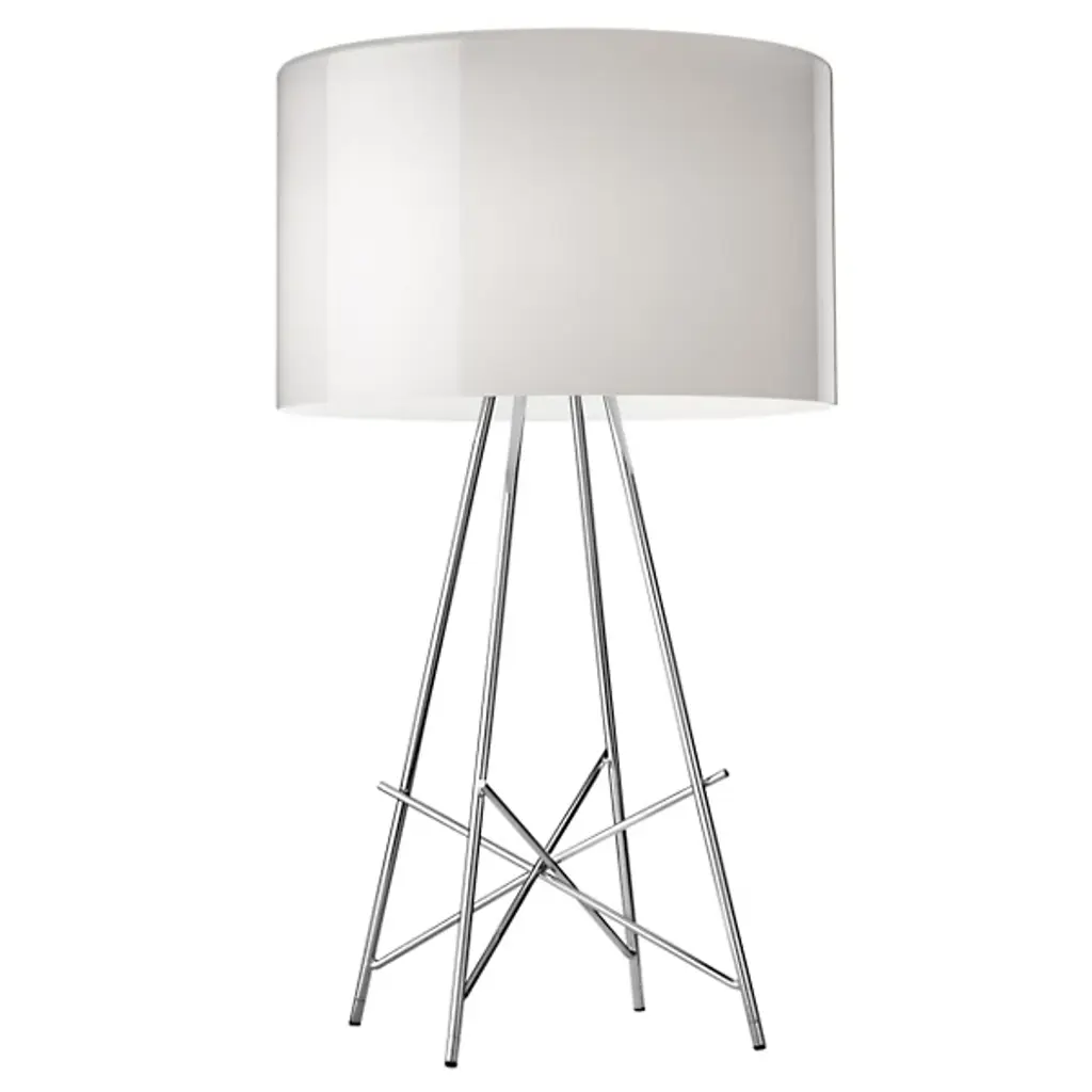 Designed by Rodolfo Dordoni, the Flos Ray T Table Lamp features the Ray collection's distinctive chrome-plated steel tube base, in a criss-crossing configuration resembling scaffolding. The drum-shaped aluminum shade features a White painted interior with either a Black or White painted or Gray Blown Glass overlaid exterior. Available in halogen or energy efficient fluorescent lamping.