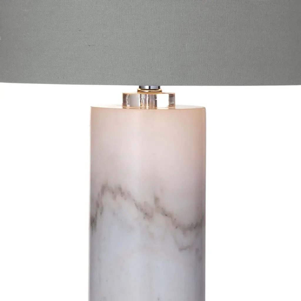 The Raywick Table Lamp brings a touch of luxury with its white marble cylindrical base, perfect for the glamor-seeking decorator. The cool sophistication of marble meets the soft texture of a gray linen drum shade, making this lamp a harmonious addition to any lavish or modern setting. Illuminate your space with this elegant piece that beautifully merges classic materials with contemporary design.Features:Lamp body is constructed with marbleFeatures an on-off light switchBulb type a required, but not includedEasy assembly - just attach harp, finial and shadeIncludes a 6 inch cord for easy placementEasy assembly - just attach harp, finial and shadeFor over a century, Bassett Mirror has been synonymous with style and quality, transforming homes with its sophisticated and timeless designs. With a wide-ranging collection of furniture, lighting, mirrors, and art, Bassett Mirror seamlessly blends modern style with classic appeal. From rustic modern to luxe glam, each piece is thoughtfully crafted to inspire and elevate any space. Committed to exceptional value and customer care, Bassett Mirror makes it easy for homeowners to create beautiful, personalized interiors with confidence.