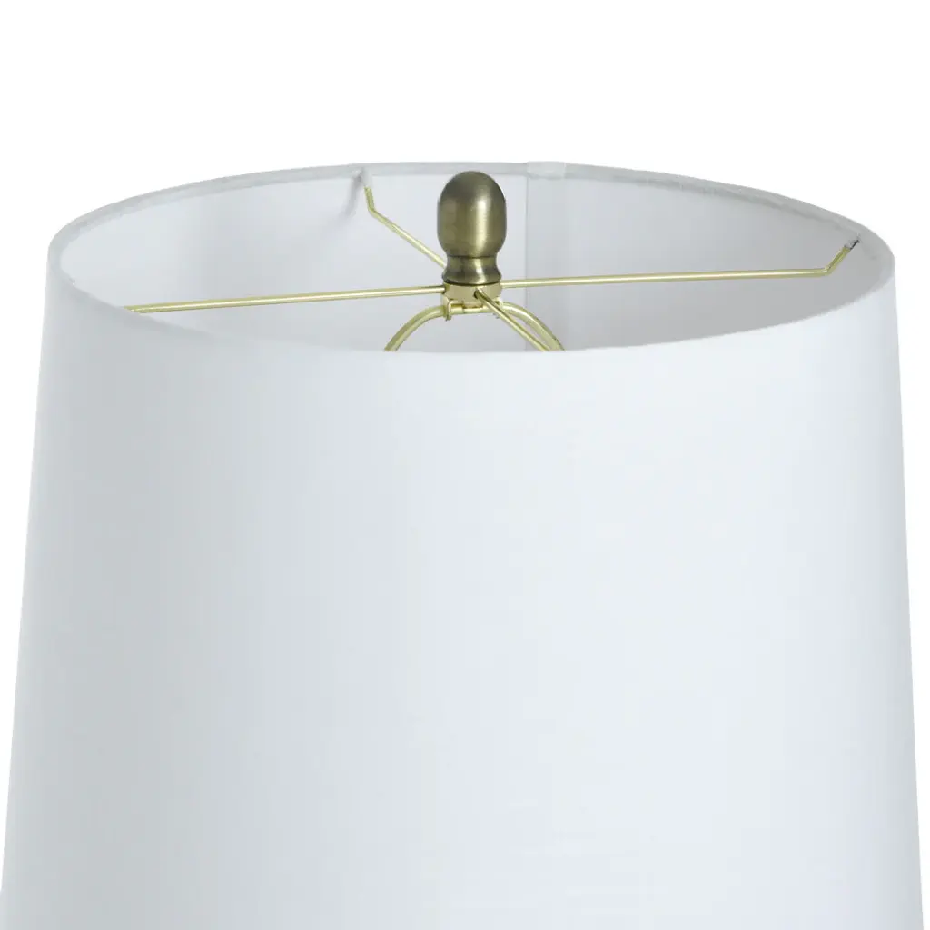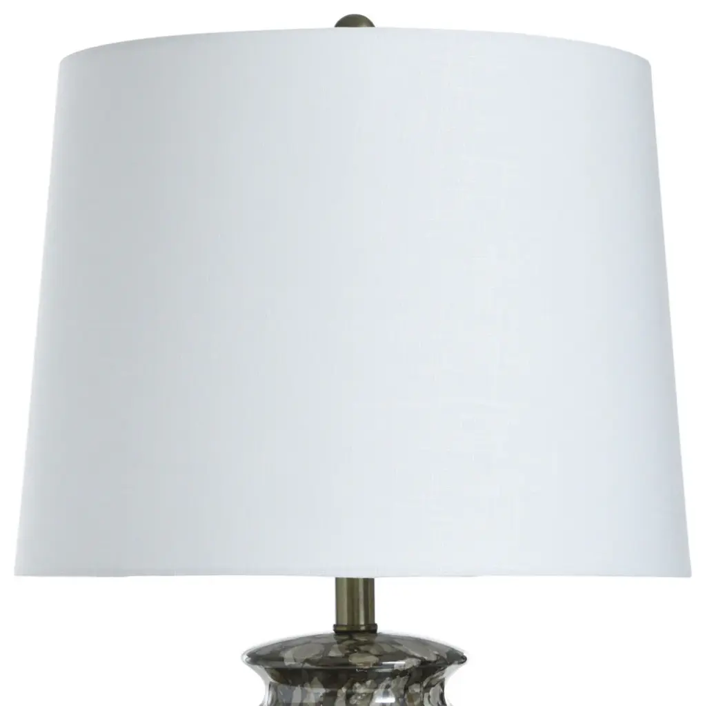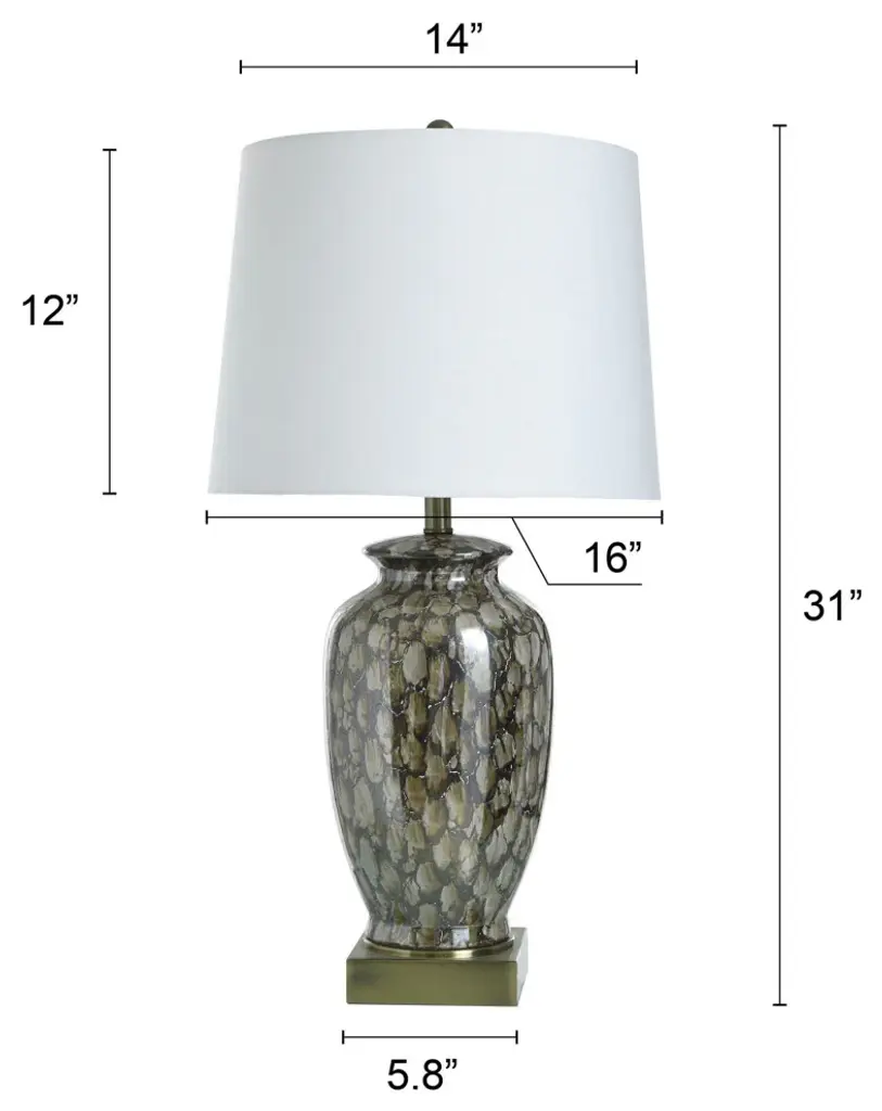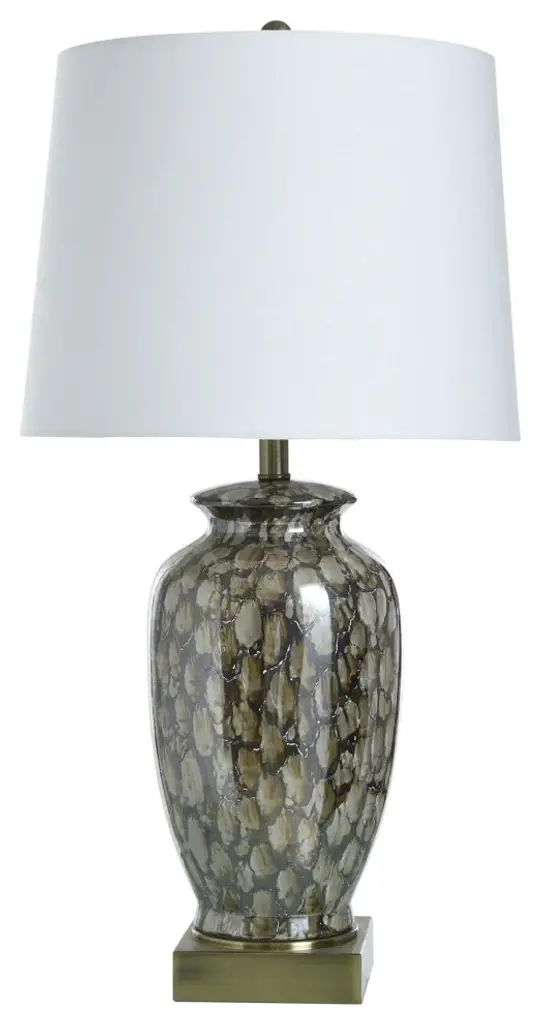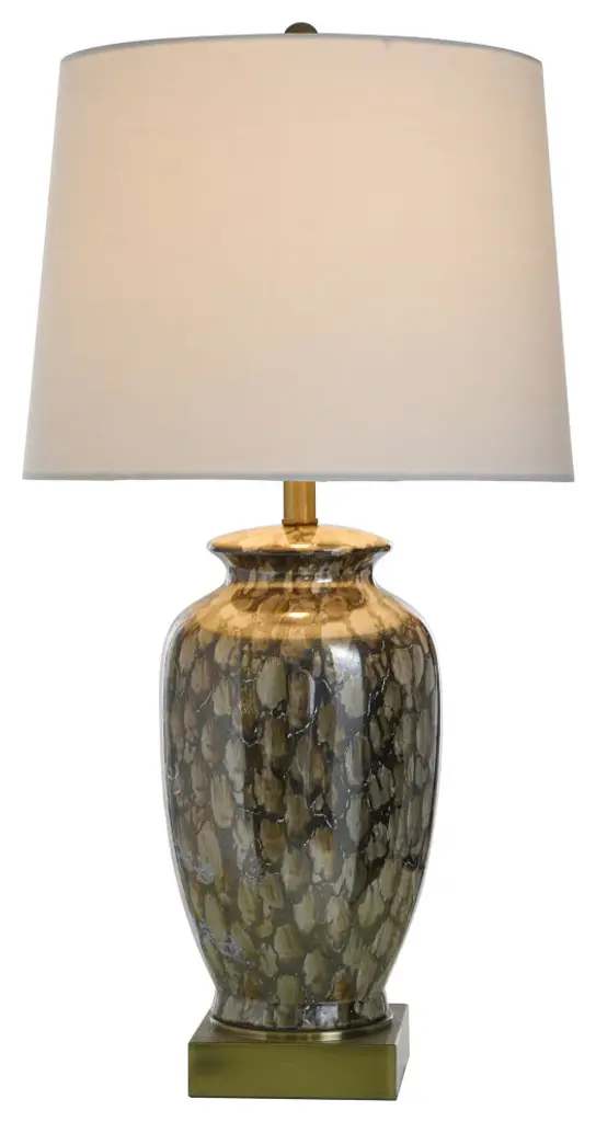 Add a sense of modern appeal to your interior space by placing this sophisticated piece on an end table or console to light up your home. This ceramic table lamp features a stunning glaze on glass creating an alluring pattern of cream and brown in the base. This captivating look is completed by brass steel finishes and an off-white tapered drum shade.Features - Due to the production process, each piece is unique and no two are exactly alike.This table lamps showcases a captivating look with a stunning speckled brown patterned glaze under glass.Gold steel details and an off-white tapered drum shade, this piece is elegant and modern, adding a sense of sophistication to your home.Number of Bulbs: 1Wattage: 150WBulb Type: Incandescent, Fluorescent, or Equivalent.Bulb(s) not includedDue to lighting and monitor differences, actual colors and finishes may vary slightly from what appears online.