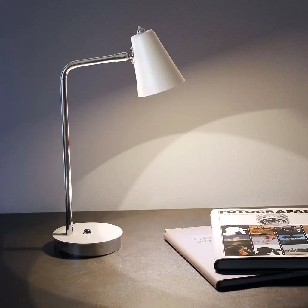 A rechargeable design conceived to maximize comfort during work or study sessions, this table lamp is marked by a sleek and minimalist design. Its structure couples brass and iron, featuring a round base and glaring, angular stem to which is fitted the white-finished, conical metal shade whose orientation can be adjusted as desired. It hosts three 1.2W LED sources and is also safe for outdoor use. An electronic power supply is included with purchase.