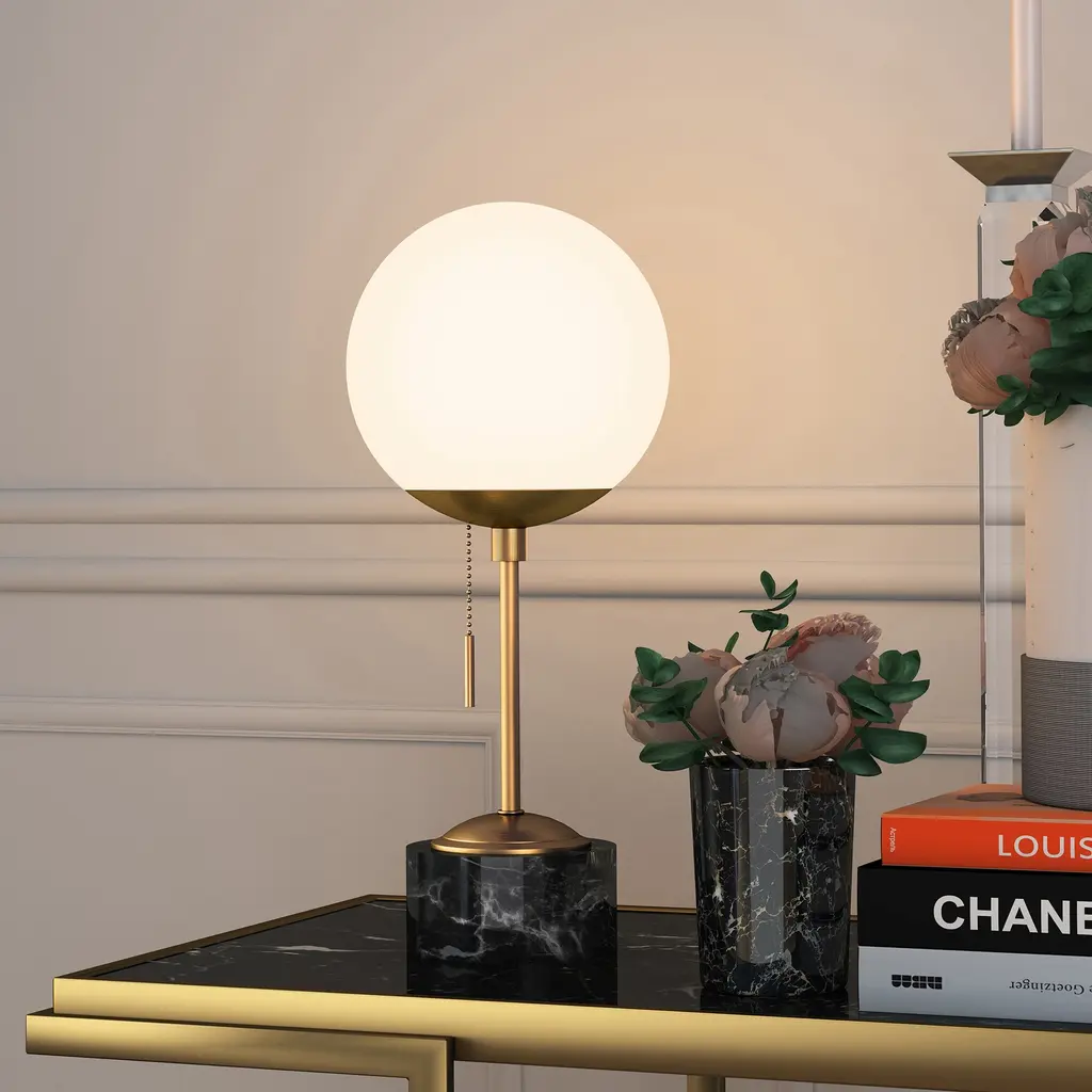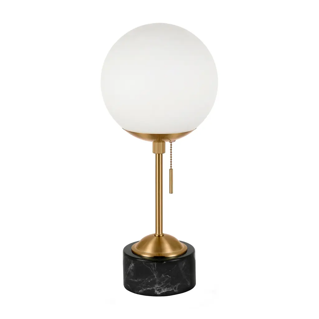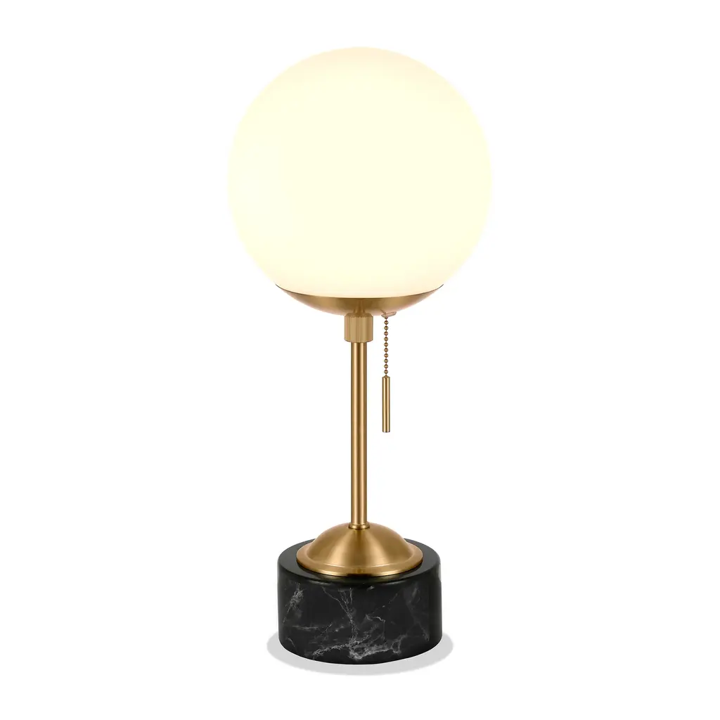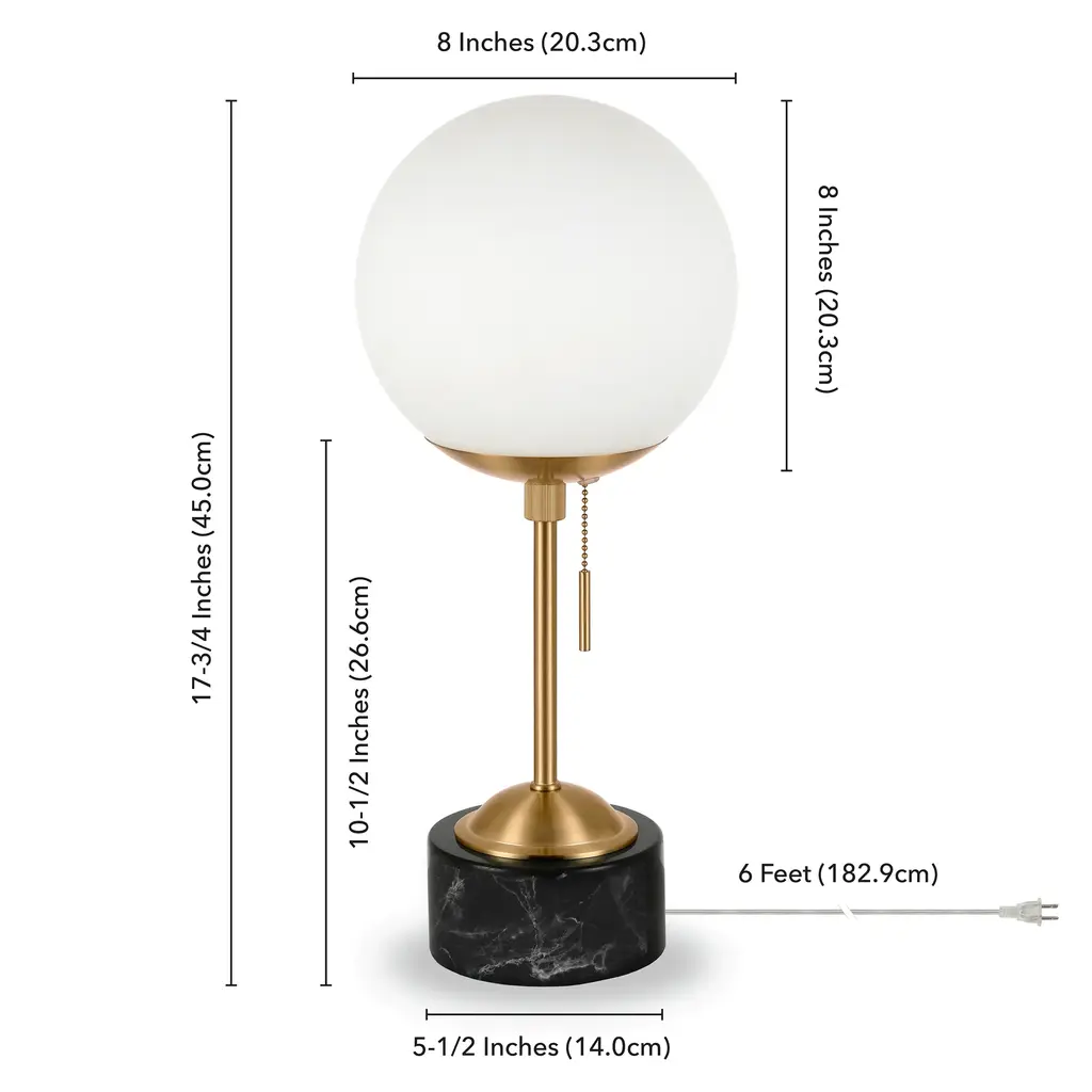 Features: • Premium materials have been used making this lamp: glass in the shade, marble in the frame and base, UL certified wiring components. And the finishes are hand done: the brass finish is a rich brushed brass finish. • The frame is brass and the base is a solid black marble piece. • The globe is translucent white glass. • The orb shade included is made from translucent white glass. • Rated for one 60W incandescent bulb; 9W LED bulb, 13W fluorescent (CFL) bulb, or 9W self-ballasted LED bulb. E26-base bulb. • Includes a 6 ft. cord. • Clean with a soft, dry cloth; no harsh chemicals or abrasive cleaning materials. Compatibility: • Compatible with smart light bulbs such as Philips Hue, LIFX, IOTTY, Texsens, Flux, Samsung SmartThings, WiZ, and C by GE. Bulb is not included.