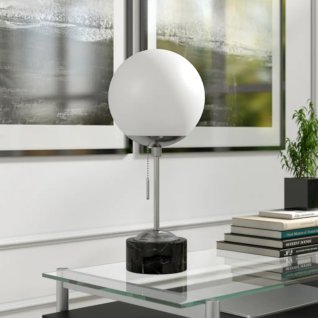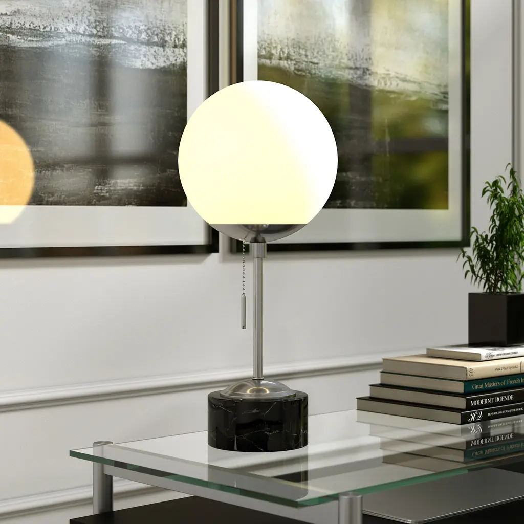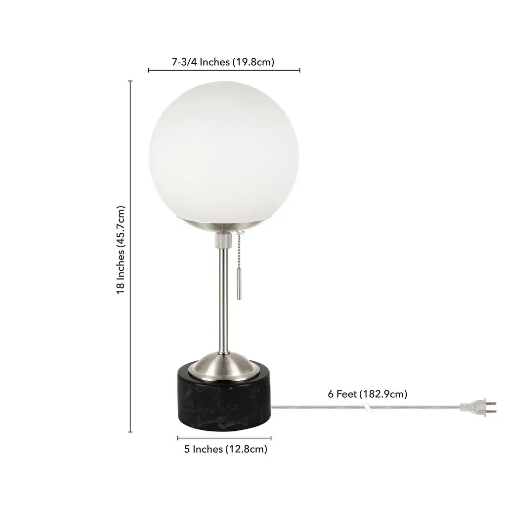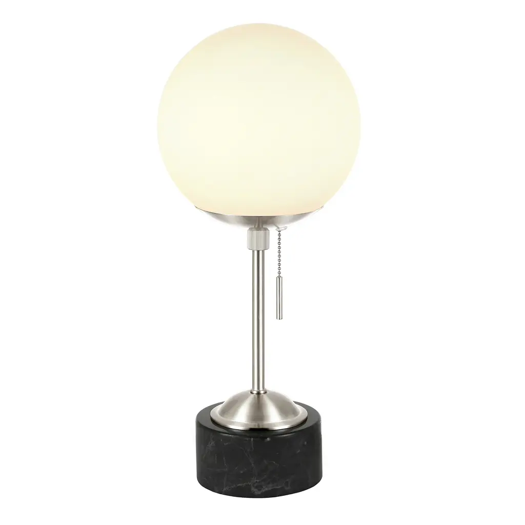 Features: • Premium materials have been used making this lamp: glass in the shade, marble in the frame and base, UL certified wiring components. And the finishes are hand done: the brass finish is a rich brushed brass finish. • The frame is brass and the base is a solid black marble piece. • The globe is translucent white glass. • The orb shade included is made from translucent white glass. • Rated for one 60W incandescent bulb; 9W LED bulb, 13W fluorescent (CFL) bulb, or 9W self-ballasted LED bulb. E26-base bulb. • Includes a 6 ft. cord. • Clean with a soft, dry cloth; no harsh chemicals or abrasive cleaning materials. Compatibility: • Compatible with smart light bulbs such as Philips Hue, LIFX, IOTTY, Texsens, Flux, Samsung SmartThings, WiZ, and C by GE. Bulb is not included.