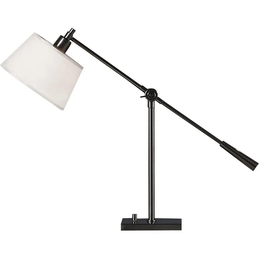 Real Simple Table LampFeaturesNumber of bulb: 1Bulb type: AMax wattage: 100WVoltage: 120VSocket: Medium E26Switch: Hi-Lo DimmingSwitch location: BaseFinish: Deep Bronze Powder CoatShade: Snowflake Fabric Shade with Top DiffuserCord color: SilverUL listed: DryDimensionsShade dimensions: 7 inches top x 9 inches bottom x 5.5 inches down sideBase dimensions: 0.88 inch height x 7.13 inches width x 7.13 inches depthAdjustable height: 15.75 - 23.5 inchesExtension: 31 inches
