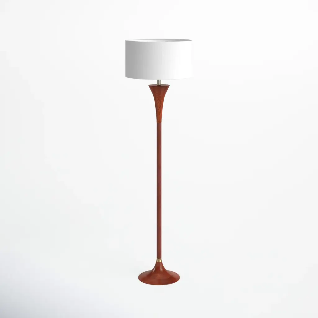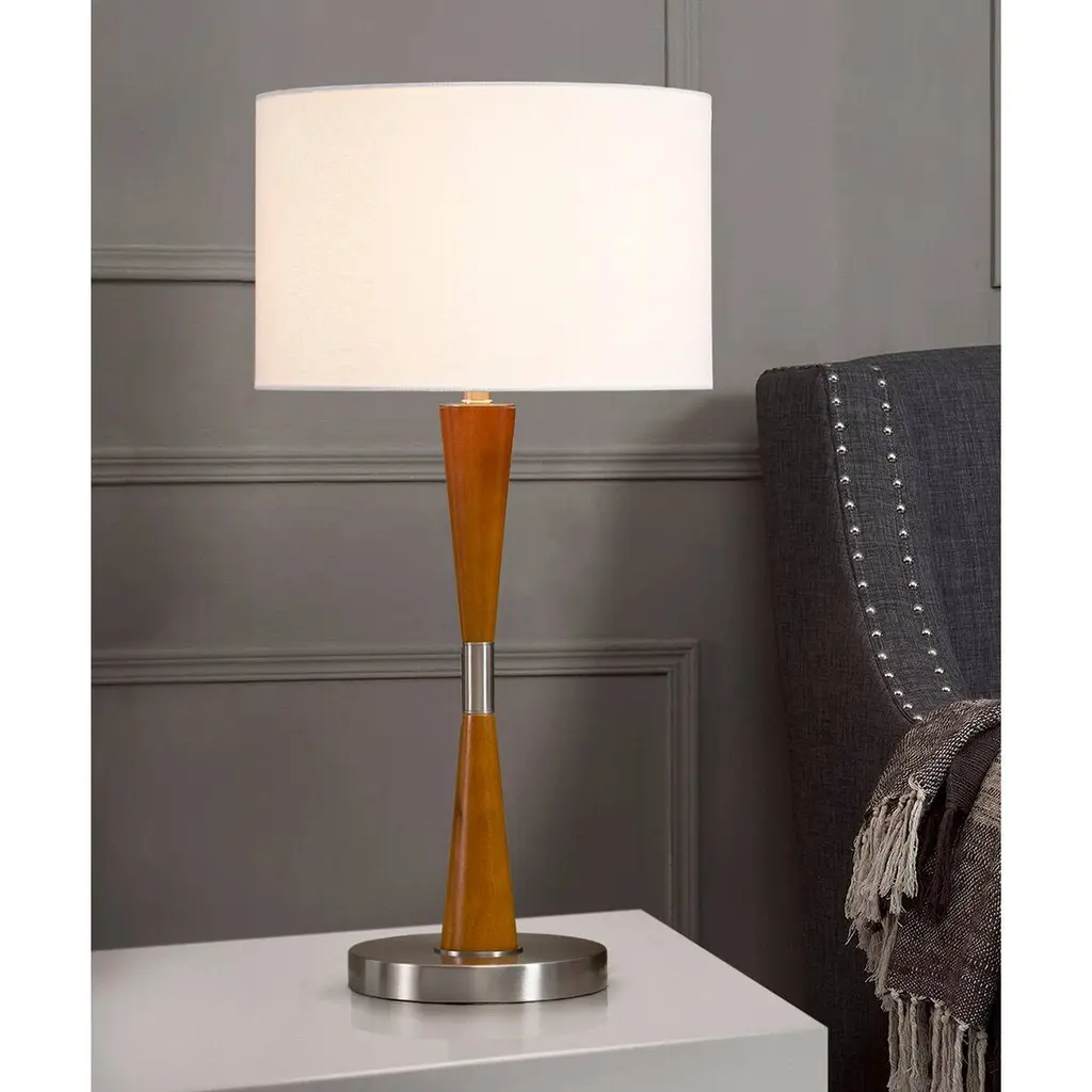 The Rebecca Lamp is inspired by mid-century design, with a stem that tapers in the center, an accent band of antique brass, and a short drum white-textured shade. The round base and stem are made of rubberwood with a natural finish that highlights the wood grain. Bulb not included.