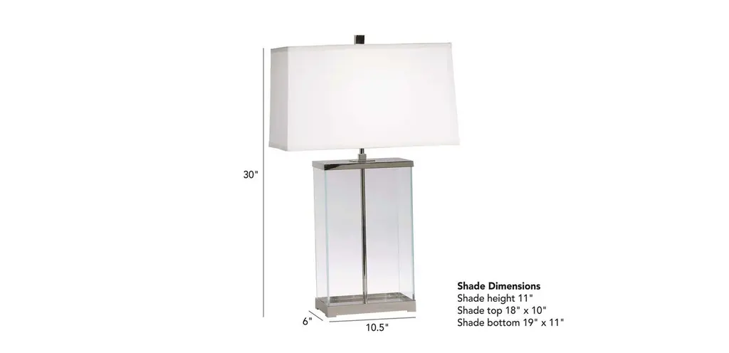 It's clear to us that glass makes an elegant statement as a lamp base. A polished nickel-finished stem runs up the center of this rectangular glass foundation for a sleek, eye-catching design.