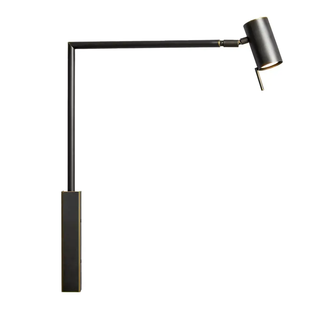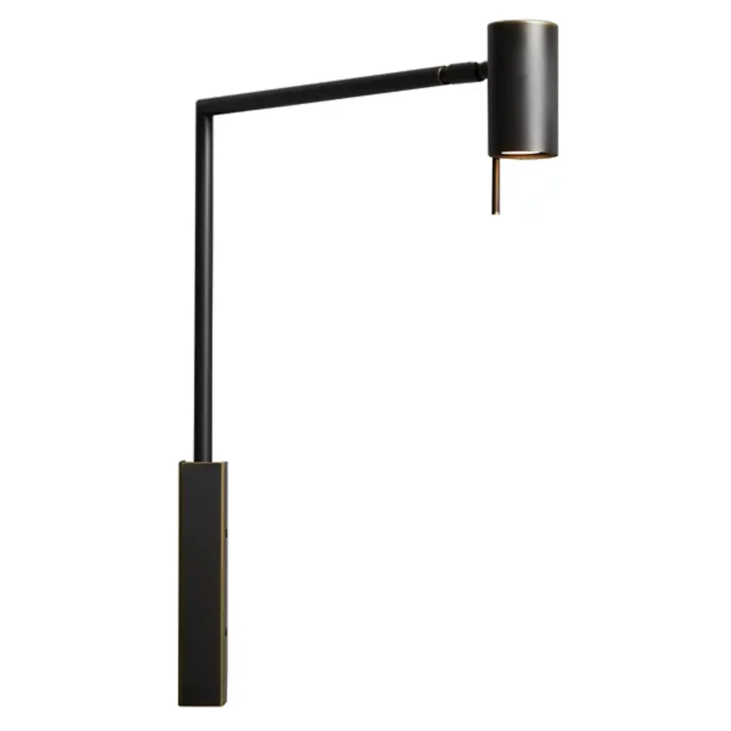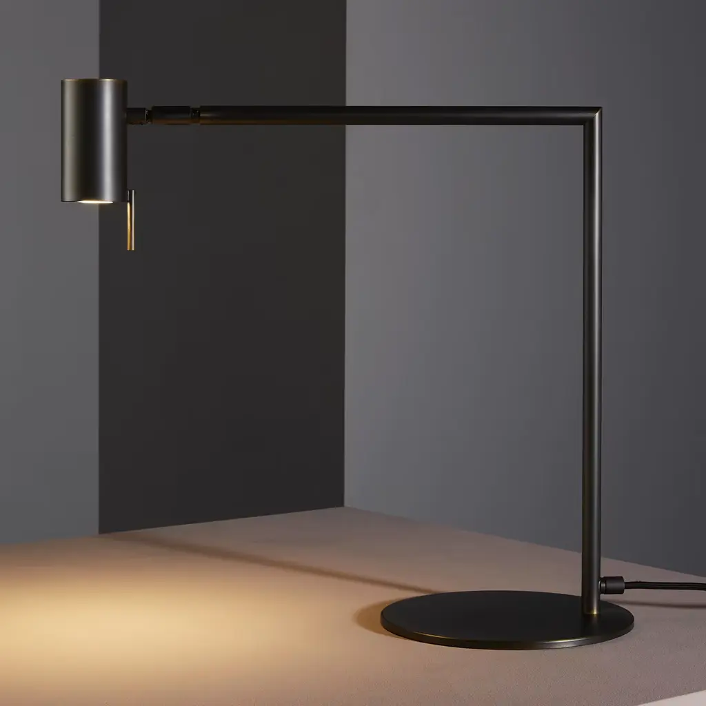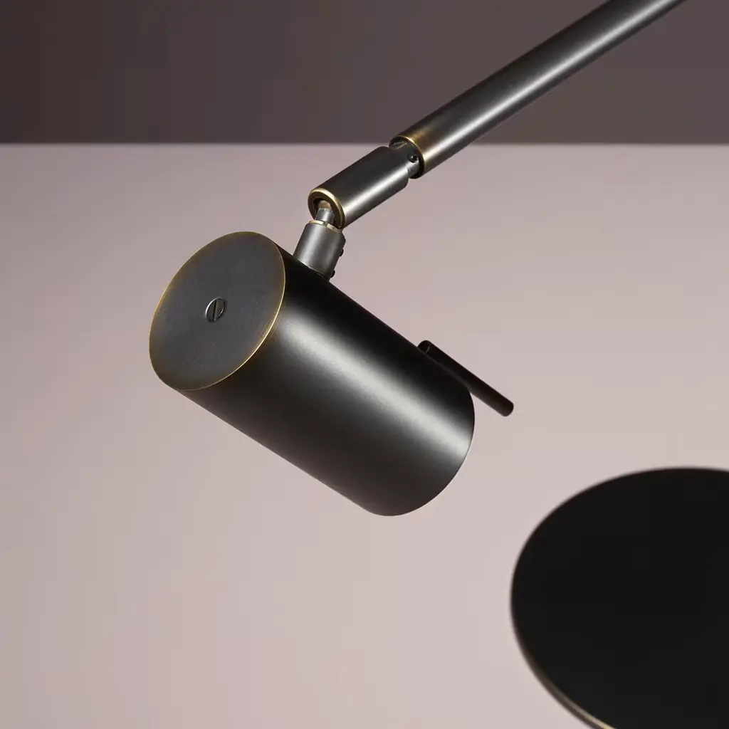 Minimalist and sophisticated, this table lamp is named after the perpendicular angle that it makes between the vertical bar and the horizontal adjustable joint. An impeccable piece of functional decor, the structure is made of dark burnished brass and will provide a directional light from the single GU10 PAR16 LED bulb max 6W with 560lm, 2700°K, and CRI80. Contract and commercial certifications available upon request.