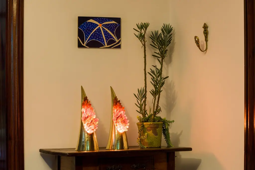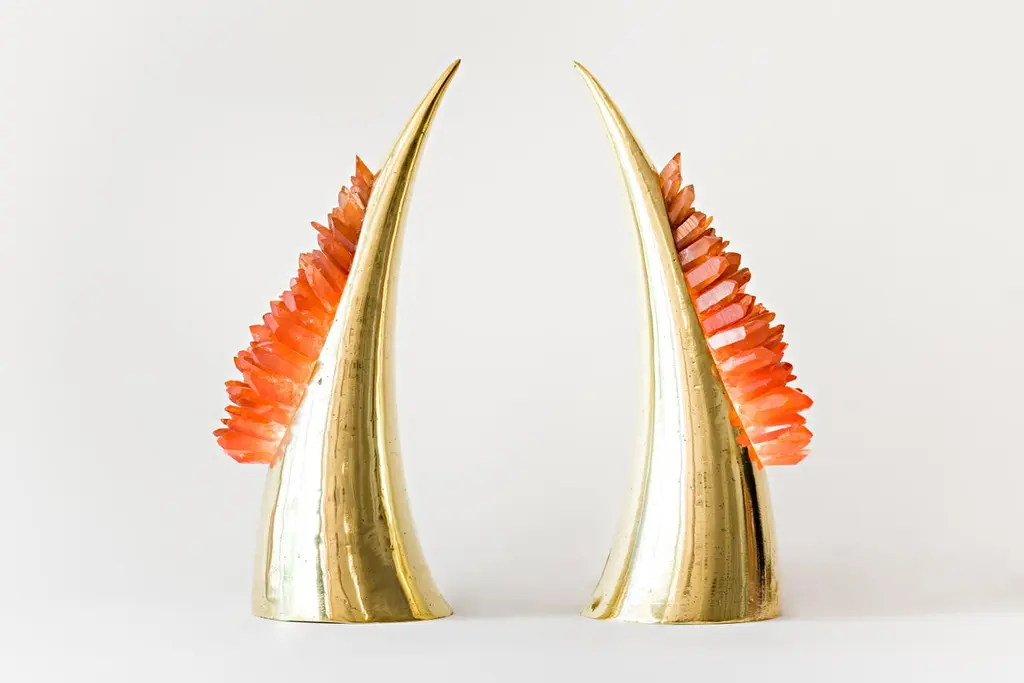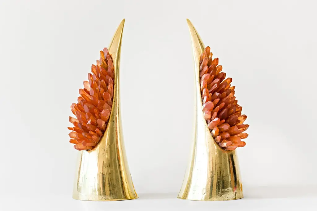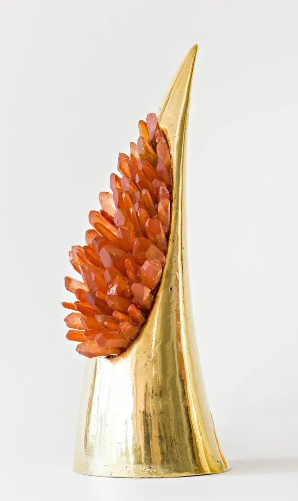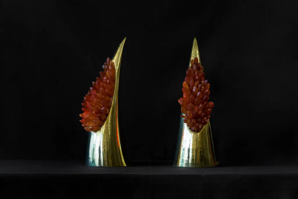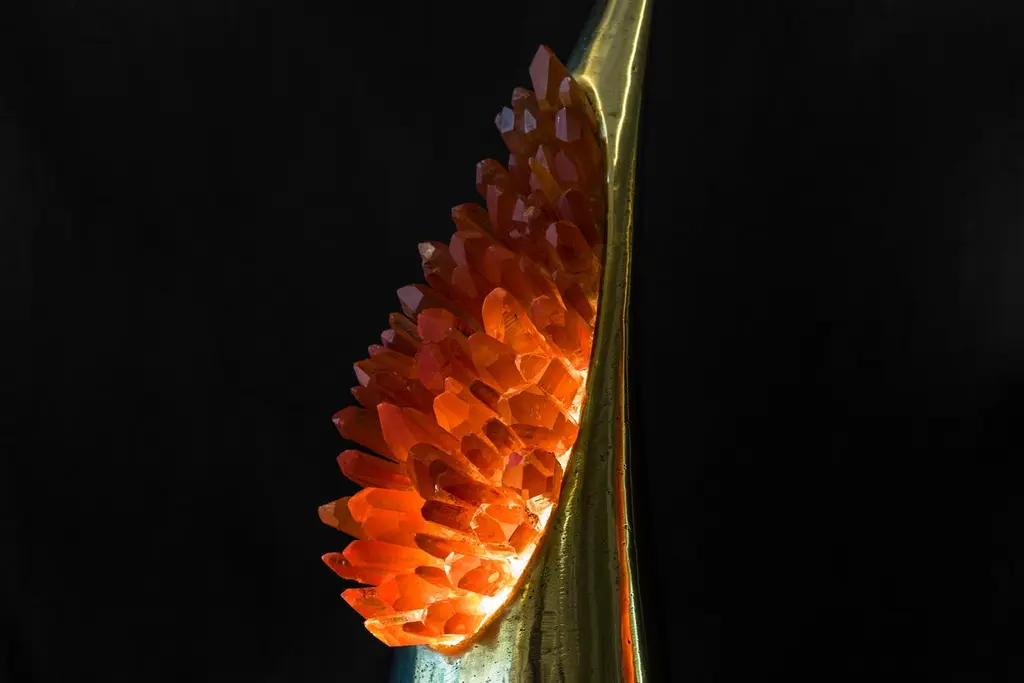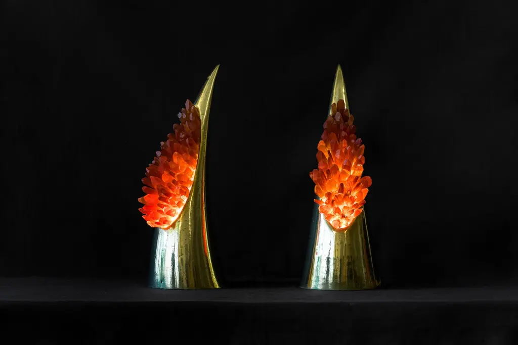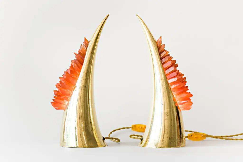 Red Aurea table lamp Demian QuinckeDimensions: 16 Ø x H 40 cmMaterials: Casted Brass, unique red natural quartz points.Like an eruption of red strength blooming from an organic form. The form has someremainder of a horn or a prehistoric Saber-toothed Tiger canine tooth.Demian Quincke develops unique handmade decorative objets d’art from precious stones that are carefully selected and perfectly fitted together, creating amazing forms of brilliance and beauty. The final appearance is like a bouquet of beautifully illuminated flowers, rendered in natural quartz, unfolding their petals.Demian’s artistry is a product of hard work, natural ability, and the unique artistic and cultural environment in which he was raised. Born in France to Uruguayan parents, Demian was exposed early to art by his artist mother and his father, who was a merchant in high decor and antique objects.When Demian was two years old, he relocated with his family to Uruguay, which began the process of broadening his world-view and developing his multi-cultural identity. After stops in California and Germany, he eventually arrived in Brazil at the age of fourteen, with an appreciation for the wide expanse of the World and his place in it.From the outset of his career, Demain worked to developed his unique style of artistic expression, all the while learning from other artists through observation. In 2010, upon returning from a study tour and research in New York City, he began to create, develop and produce his own pieces.In love with the natural beauty of semi-precious Brazilian stones, Demian uses them as the predominant material of his work. With them, he creates objects d’art that remind the viewer of the Earth’s natural beauty, even through the material has been transformed by his artistry. Internal or external lights enhance the brightness and beauty of the stones, and highlight their artistic metamorphosis.