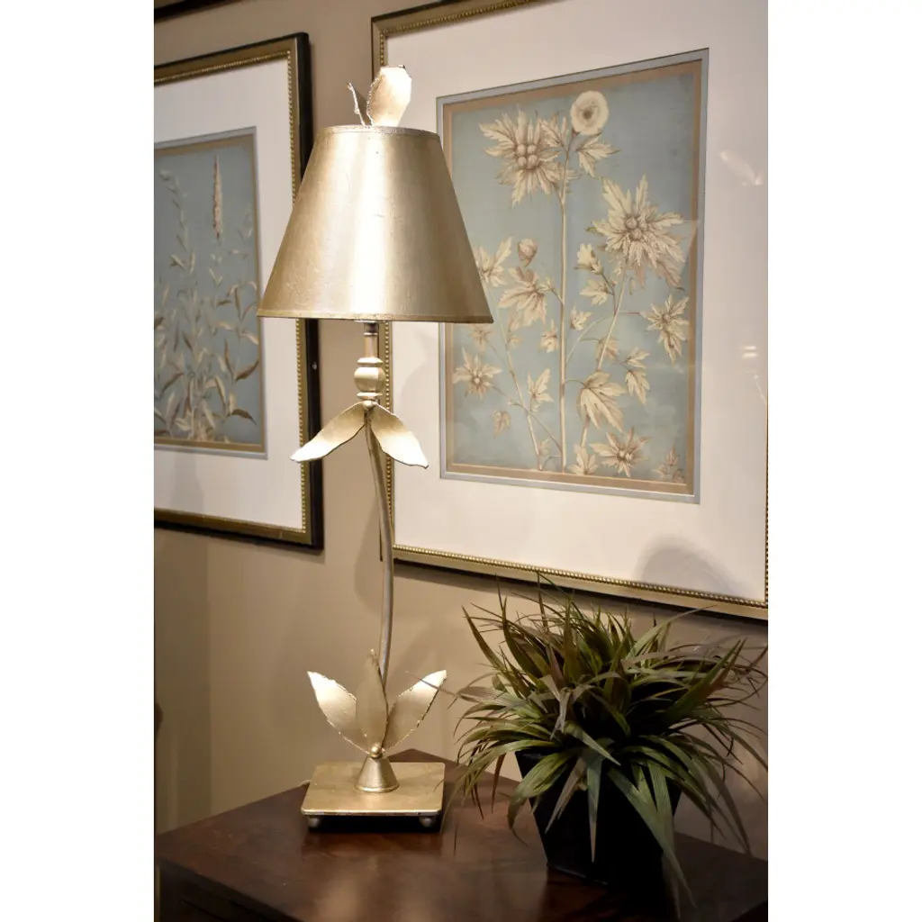 From traditional and transitional to contemporary and Luxurious chic, Lucas McKearn introduces our Red Bell Table Lamp in Distressed Silver. Having a hand sculpted leaf design and standing tall with a lustrous glow, this 30" Buffet Table lamp is best known for Casting its glory onto your Modern living room or Traditional bedroom. its Silver Leaf column will show vintage-like appeal and the leaf inspired finial adds charm and grace to your stunning space.