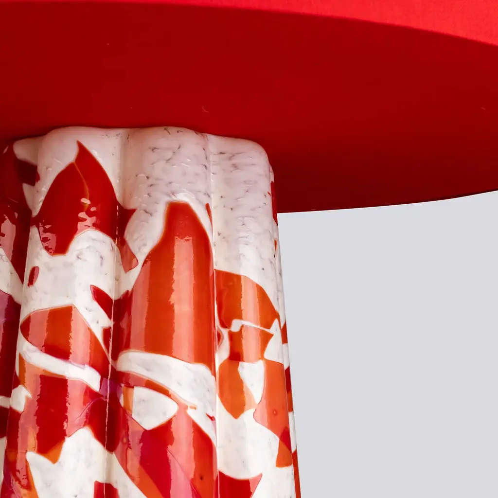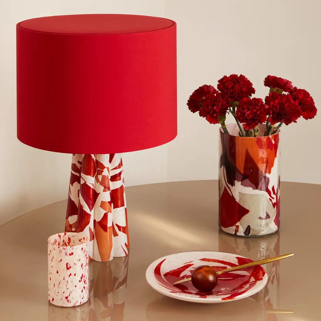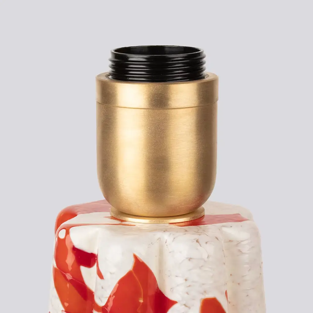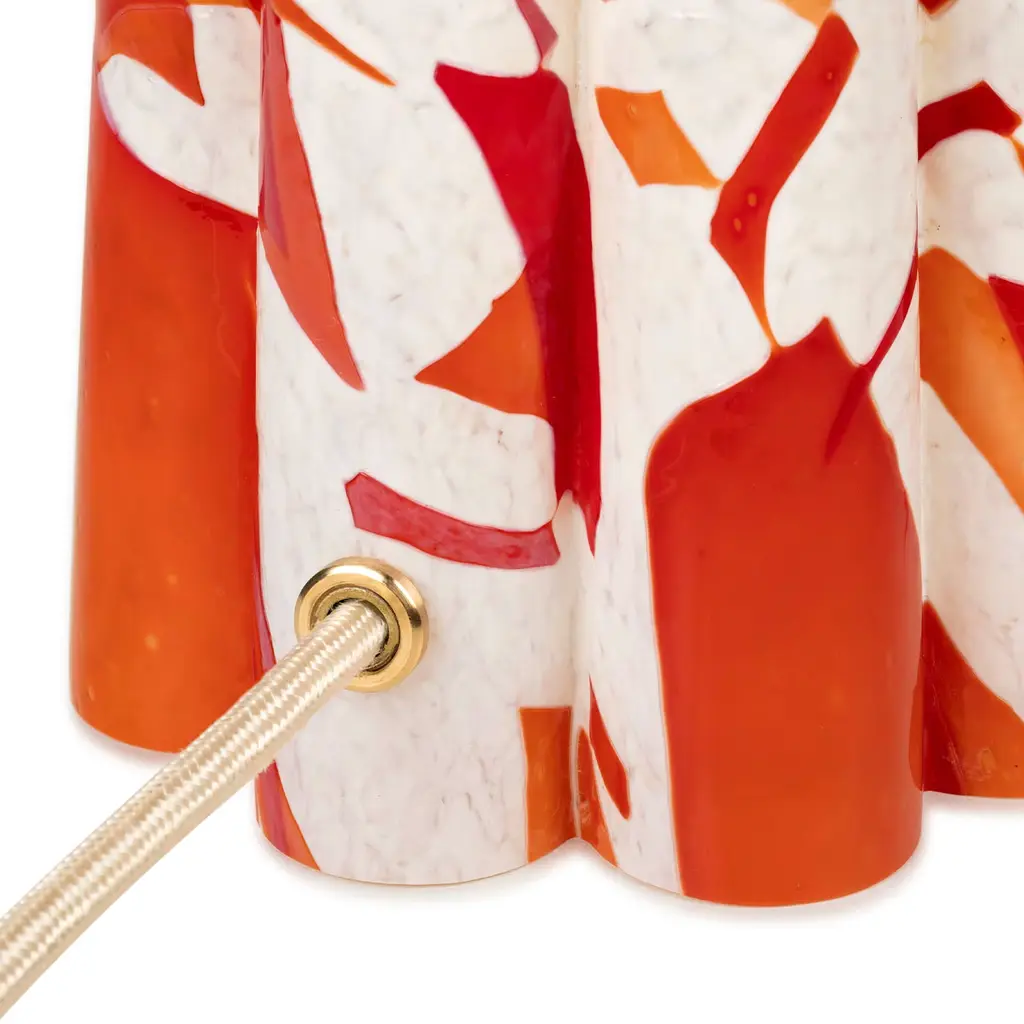 Introducing the Stories of Italy Bucket table lamp, a true testament to craftsmanship. Its Murano-blown glass base, using the Nougat technique, features a flower-shaped design with red glass shards on an ivory base, exuding elegance. Paired with a cotton lampshade, brass finishing, and a champagne-colored fabric cord, it blends style and practicality. This lamp illuminates any space with a warm glow and serves as a stunning art piece, enhancing your decor with timeless beauty and sophistication.
