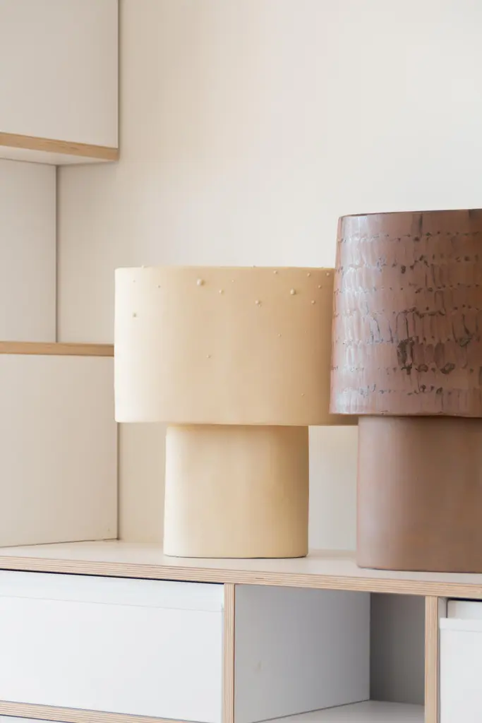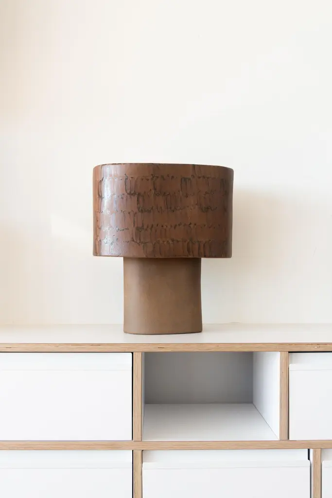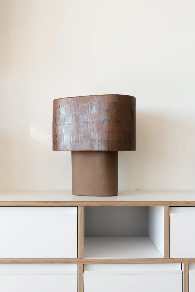 Red Stoneware Table Lamp by Lucas HuilletDimensions: D 38 x W 35 x H 38 cmMaterials: Red stoneware and hand painted glaze.Weight: 8 kg.Lucas Huillet is an artisan designer.He bases his practice around the cross-disciplinarity between artisanal ceramics and design. Mixing different influences, he associates Mediterranean culture with influences from his travels such as Japan. Lucas is attached to a global approach at different scales from the object to the space.Its work is rooted in a sustainable development approach. This approach involves, among other things, the sourcing of raw materials and their traceability. Moreover, he does not hesitate to push his work in experimental research in order to imagine new manufacturing processes.Between Paris and his studio in the village of Cerbère, Lucas Huillet created objects-sculptures. He sublimates the imperfections and deformations which makes each of his creations unique pieces.