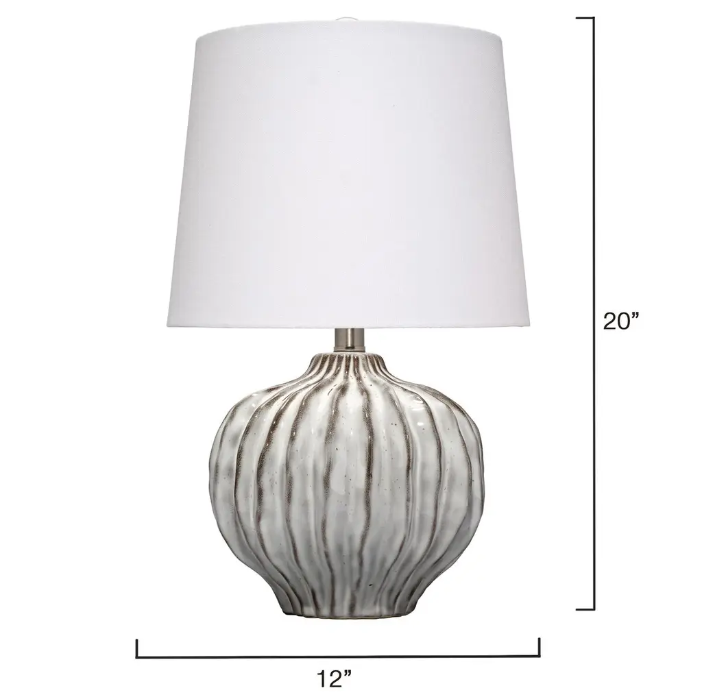 The softly rounded gourd-shaped base of this ceramic lamp is enhanced with layers of hand applied gray reactive glaze. Its cool palette is complemented by an off-white tapered shade in linen, silver-toned hardware, and a white ceramic ball finial. The overall effect is elegantly casual, making it an ideal choice for decor styles ranging from coastal to contemporary.