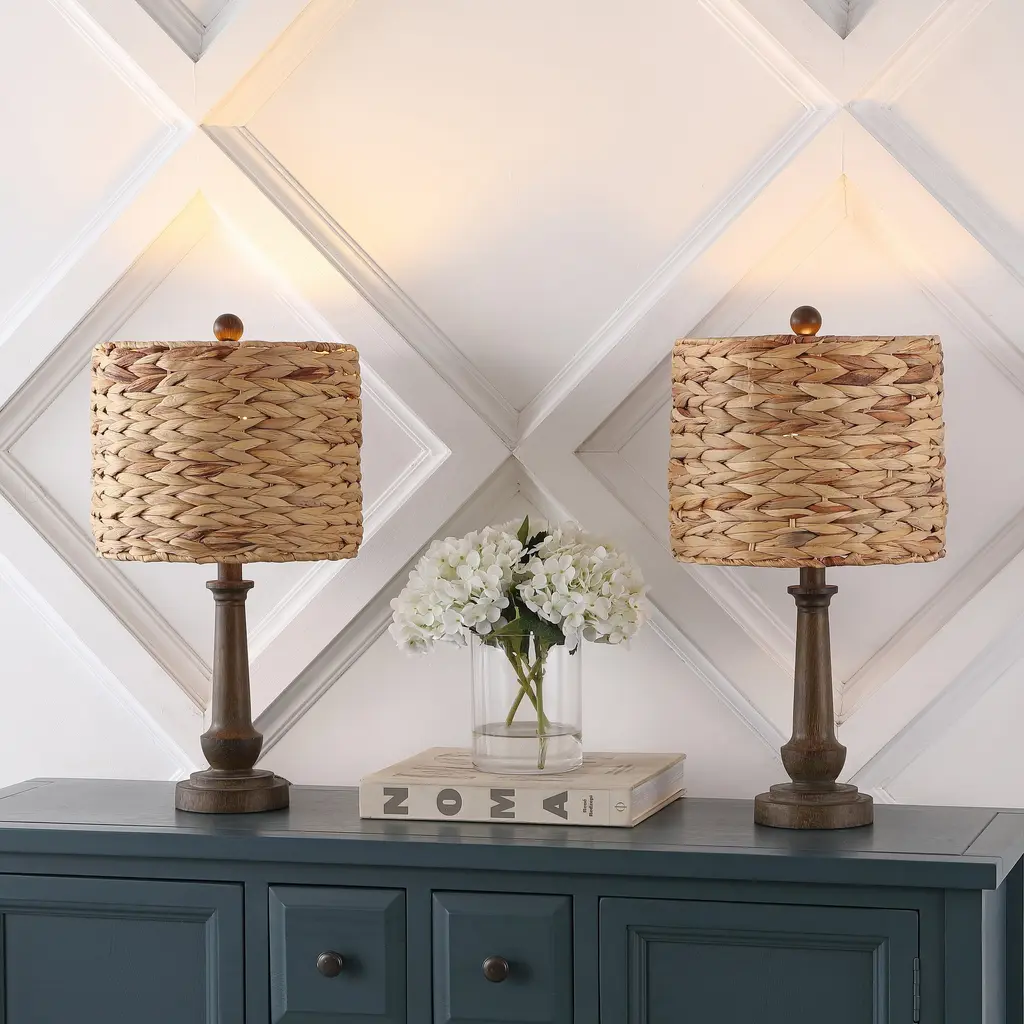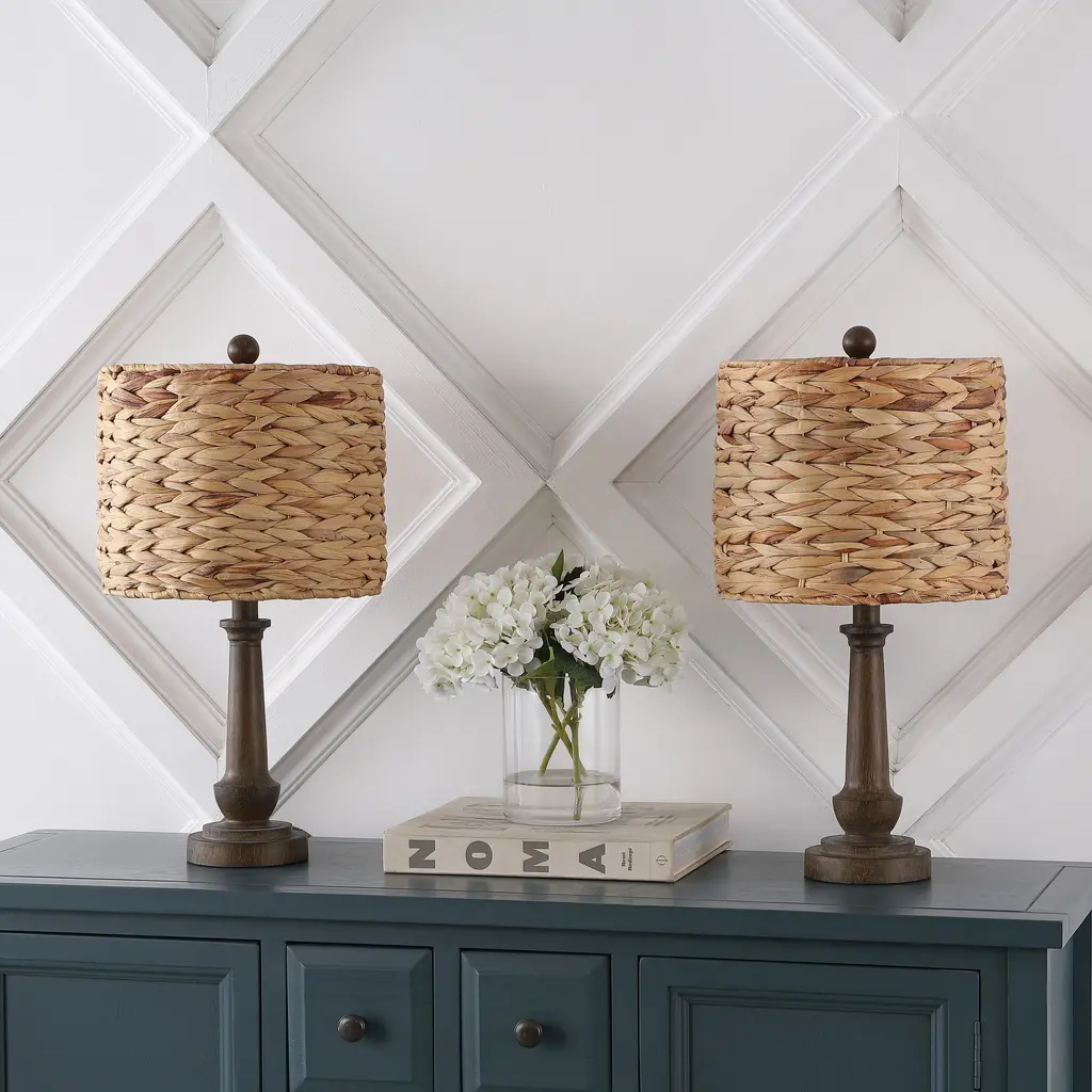 This bohemian table lamp has a farmhouse inspired tapered base. The rustic lamp consists of a resin base and rattan shade. The lamp, which comes in a set of two, will add a touch of traditional decor to any space.Features:Dimensions:About us:You see a lamp.We see a decorative work of art.A perfectly curved shade casts a dramatic shadow on a floor. A silk cord you never want to hide. Compatible with LED lightbulbs: as easy on the environment as they are on the eyes. The JONATHAN Y Lighting collection considers every detail from impeccably sourced materials to designer styling. And our prices are so attractive, we've transformed a functional necessity into a fashion accessory.JONATHAN Y Lighting - a fashion revolution in home decor.