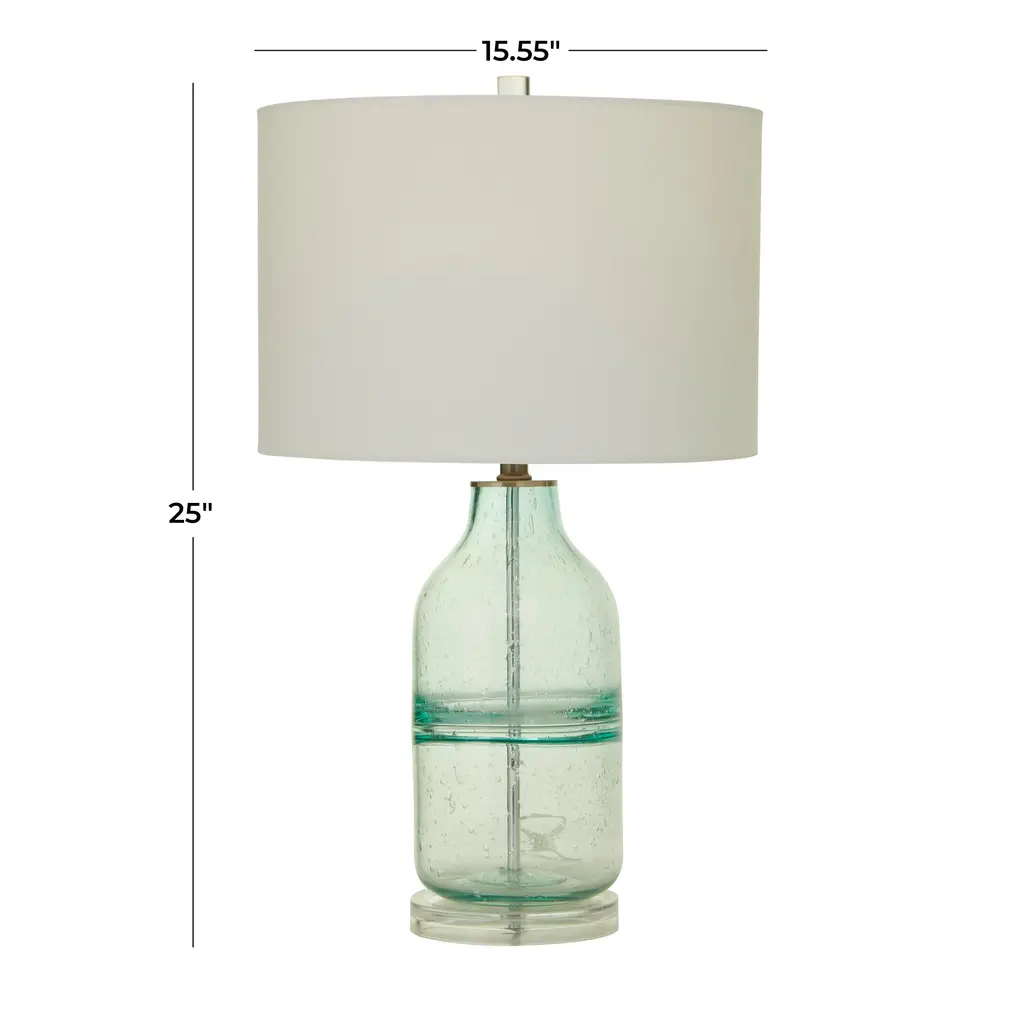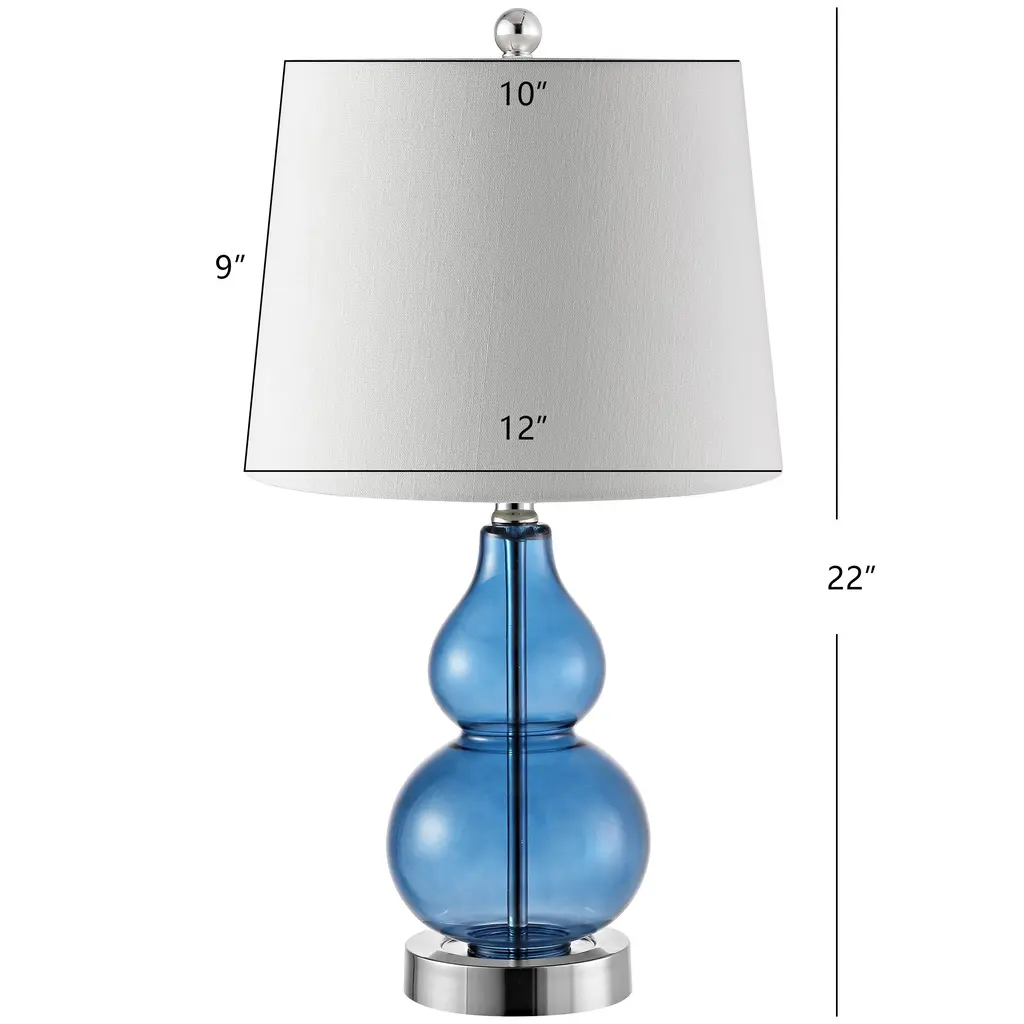 The Reeve Table Lamp is crafted of art glass with a white tapered shade. Finished in a mottled blue glass.Features:This blue table lamp features a modern style.The tapered drum shaped lamp shade features a white finish.Features a 3 way switch.Bulb type a required, not includedEasy assembly - just attach harp, finial and shade.For over a century, Bassett Mirror has been synonymous with style and quality, transforming homes with its sophisticated and timeless designs. With a wide-ranging collection of furniture, lighting, mirrors, and art, Bassett Mirror seamlessly blends modern style with classic appeal. From rustic modern to luxe glam, each piece is thoughtfully crafted to inspire and elevate any space. Committed to exceptional value and customer care, Bassett Mirror makes it easy for homeowners to create beautiful, personalized interiors with confidence.