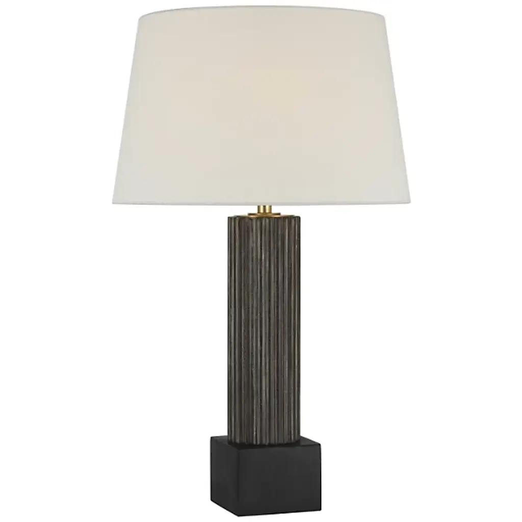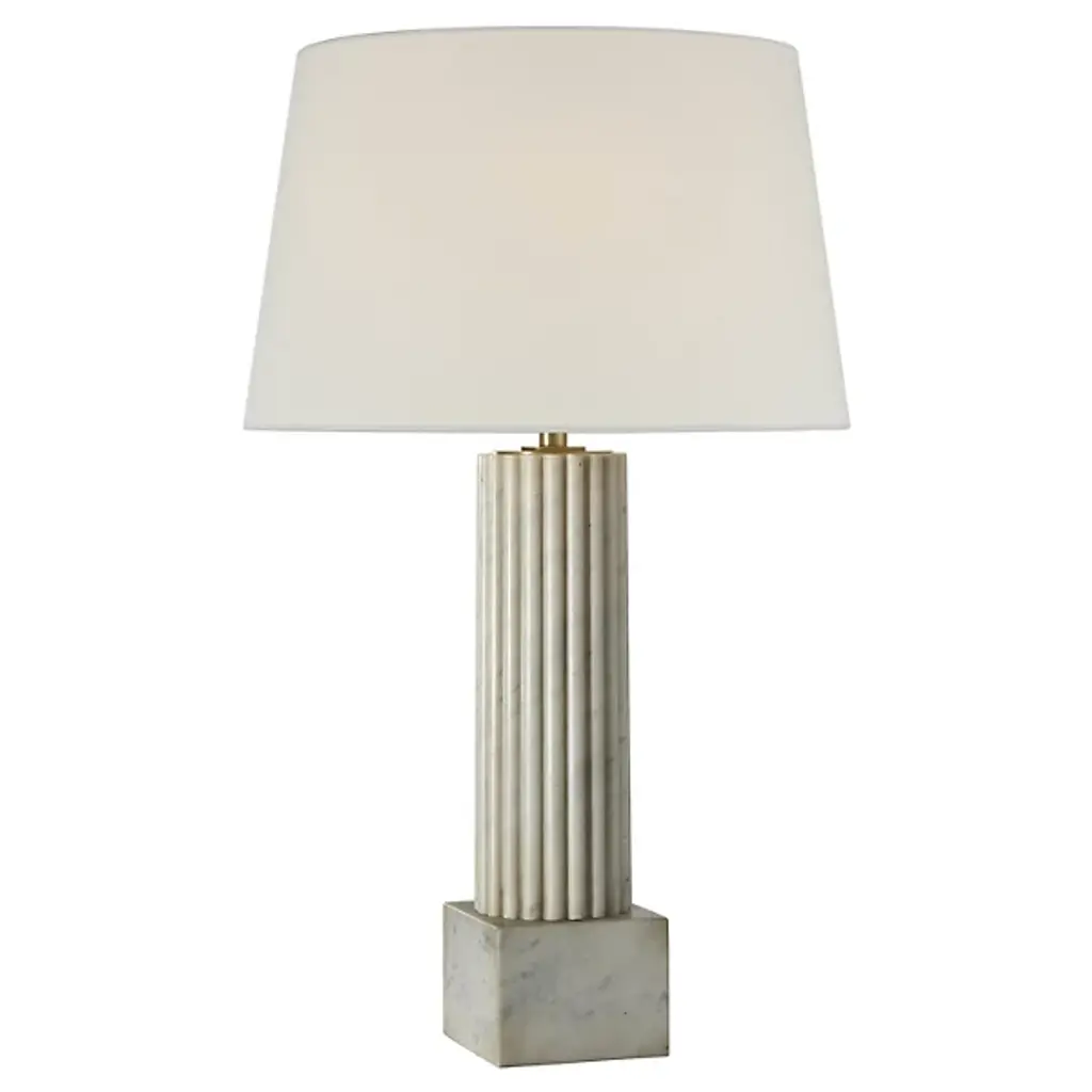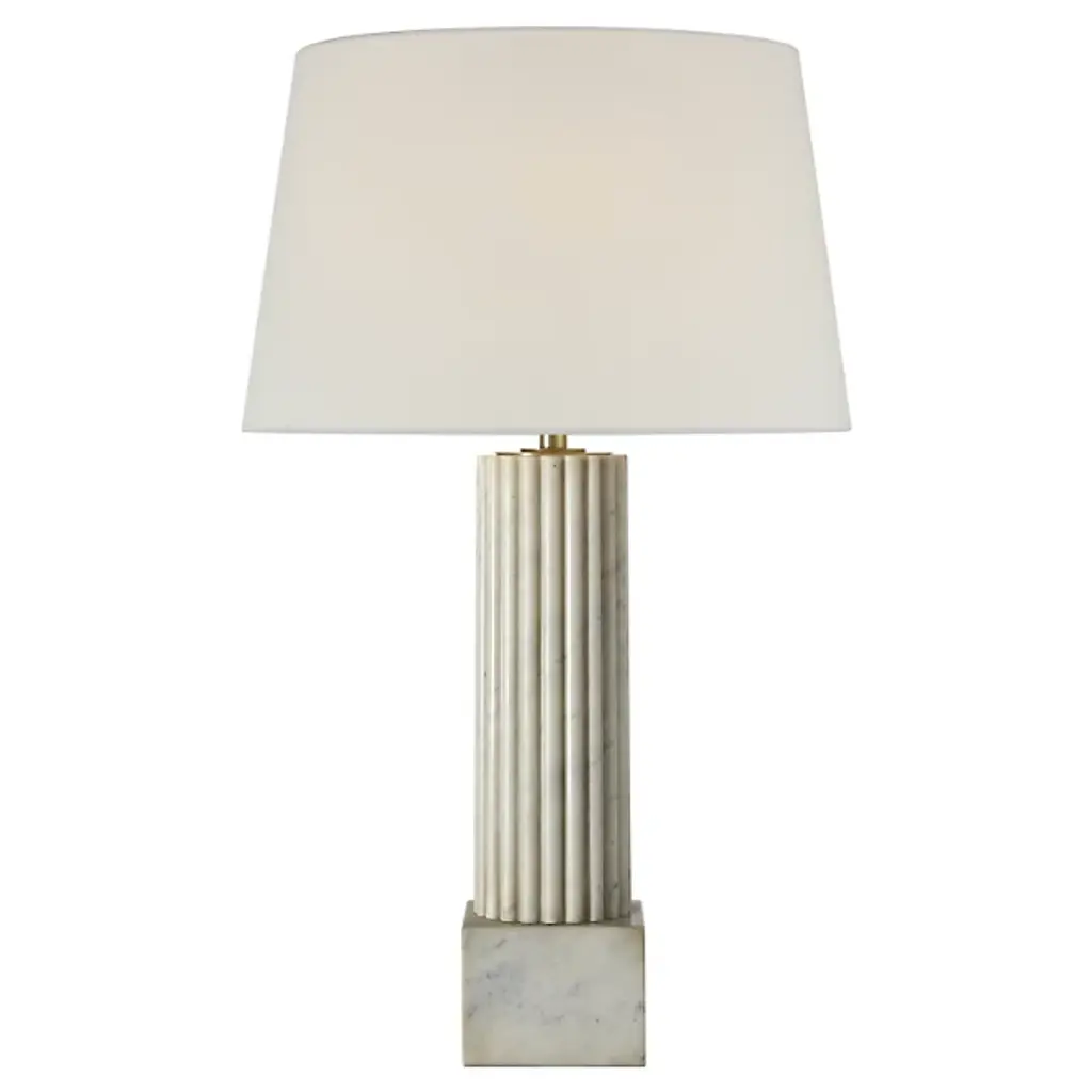 The Reeve Table Lamp from Visual Comfort Signature brings classical column architecture into intimate spaces. Design duo Chapman & Myers crafted this marble and brass creation with fluted detailing that catches light and creates subtle shadow play throughout the day. The solid base anchors the lamp with a weight that feels generous yet refined. Its proportions draw inspiration from ancient Greek temples while feeling decidedly current. The lamp transitions effortlessly between traditional and modern settings. Perfect for nightstands, living room side tables, or entryways, this lamp bridges historical references with practical illumination.