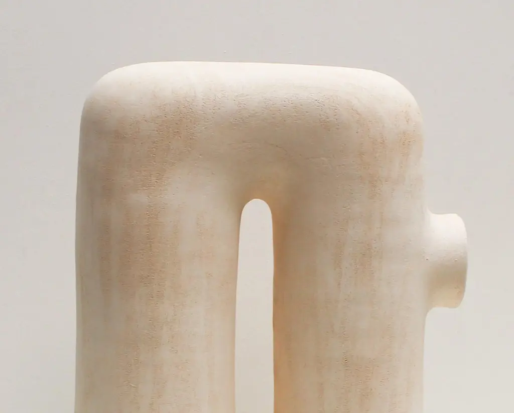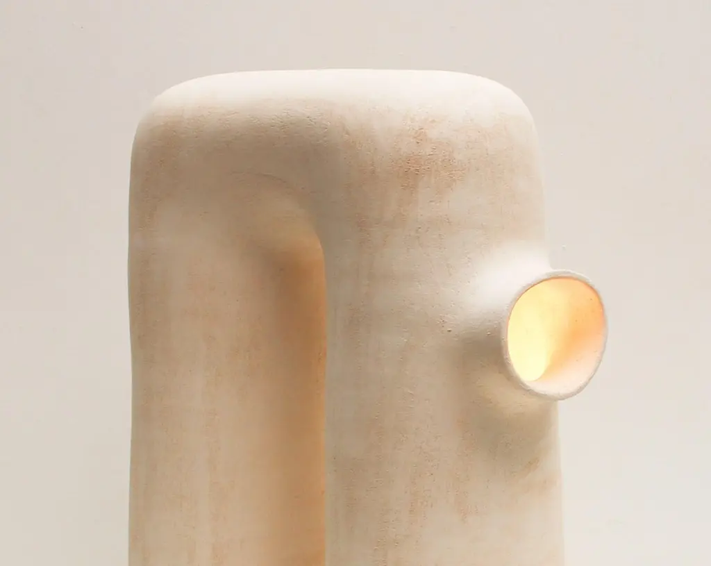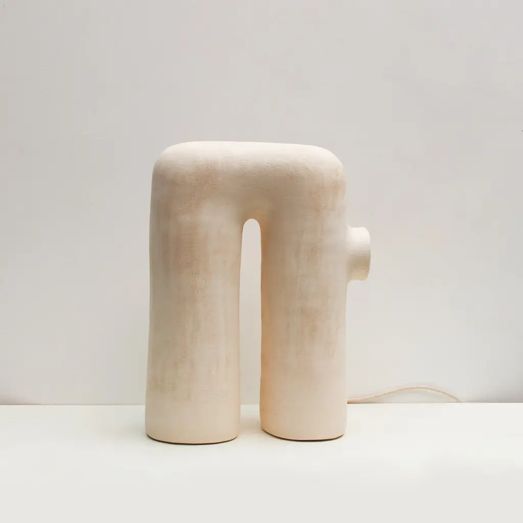 Refuge #14 stoneware lamp by Elisa UbertiLimited Edition of 4 numbered pieces.Dimensions: H 50 cm.Materials: white stoneware.This product is handmade, dimensions may vary.After fifteen years in fashion, Elisa Uberti decides to take the time to work with these hands and to give birth to new projects.Designer and artist, in her Roubaix workshop she mainly works with sandstone, her favorite material, which she models to create sculptures, lamps or vases with curved and comforting shapes testifying to an ancestral manual gesture. His works form a particular microcosm, far from standardization, and testify to his artistic sensitivity. A refined universe with multiple inspirations such as mineral and organic nature, nomadism, architecture and the poetry of space linked by the same common thread, respect for passing time and a need for timelessness. His work, on the border between art and design, combines tradition and modernity. She constantly seeks the difficult balance between the rigor of technical constraints and the necessary freedom and spontaneity of the gesture.All our lamps can be wired according to each country. If sold to the USA it will be wired for the USA for instance.