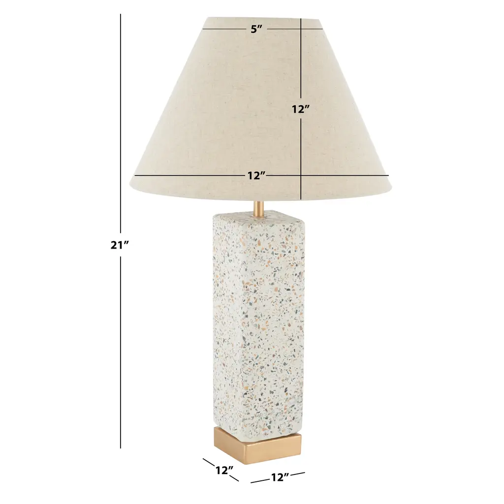 The tapered, geometric body of this unique table lamp is designed to reflect light throughout, making it a perfect addition to any space. The base is hand-crafted of cement and is topped with a linen shade to help illuminate memories for years to come.•Handmade of grey cement•100% Off-white Linen Drum Shade•Brass Cylinder FinialThe handcrafted nature of cement creates products with character and individuality. The inherent variations in tone or texture, are preserved, to create pieces rich in detail and natural beauty. These unique imperfections and variations are what define our products, with each piece having its own personality. •Lamp Dimensions: 19.5"H x 9"W x 9"D•Shade Dimensions: 11.5"H x 16.5"W x 16.5"D•1 bulb required; Bulb Not Included•150 Max Wattage; 120 Volts•E26 Bulb Base Type •8 Ft Clear Cord•3-way SwitchCare Instructions: Wipe clean using a soft, dry cloth or static duster. Avoid using harsh or abrasive cleaners as they can damage product. Do not exceed specified wattage.