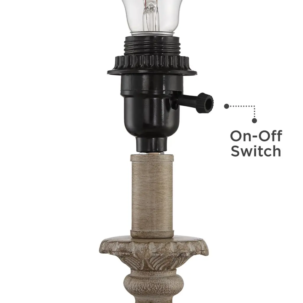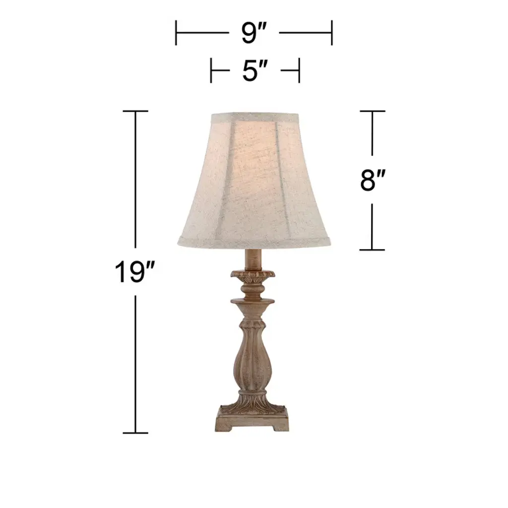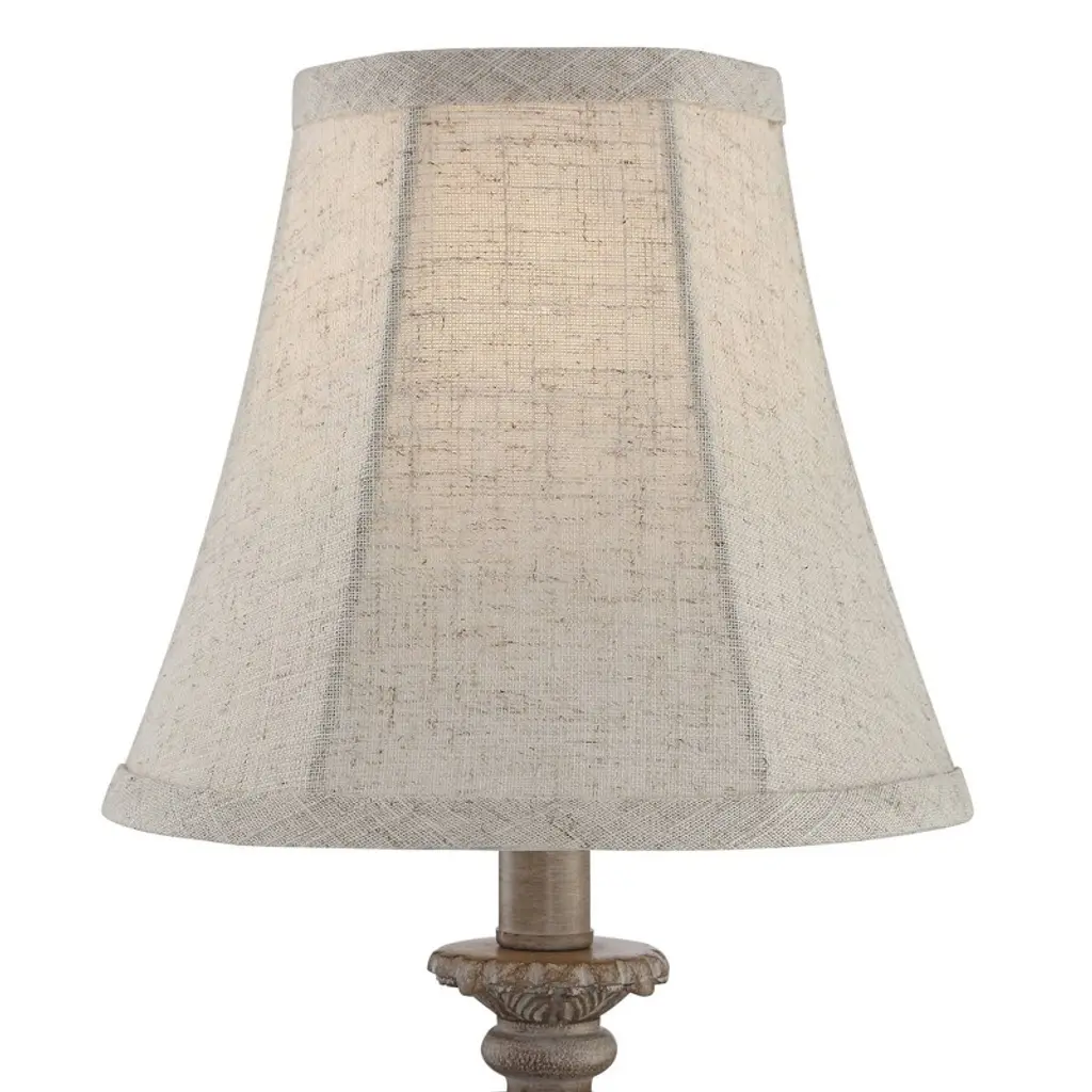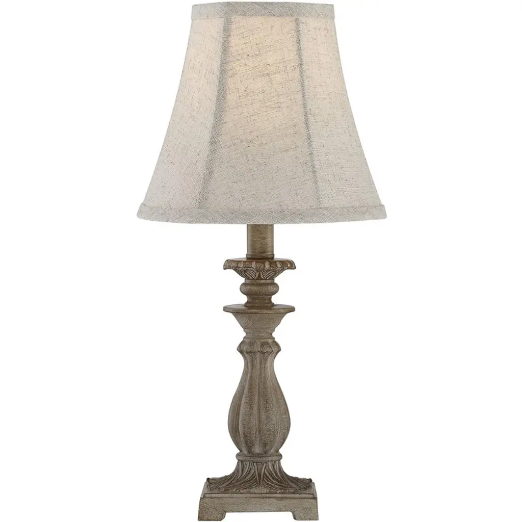 From Regency Hill, these traditional accent table lamps come in a convenient set of two. Each lamp has an elegant candlestick inspired frame, with worn carvings for a more elaborate design. A beige finish adds a classic neutral look that blends into any setting. Off-white bell shades on top are the perfect finishing touch to this beautifully old-fashioned design.