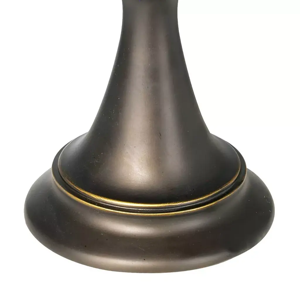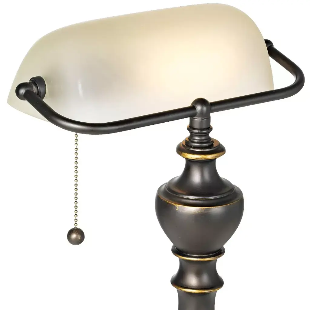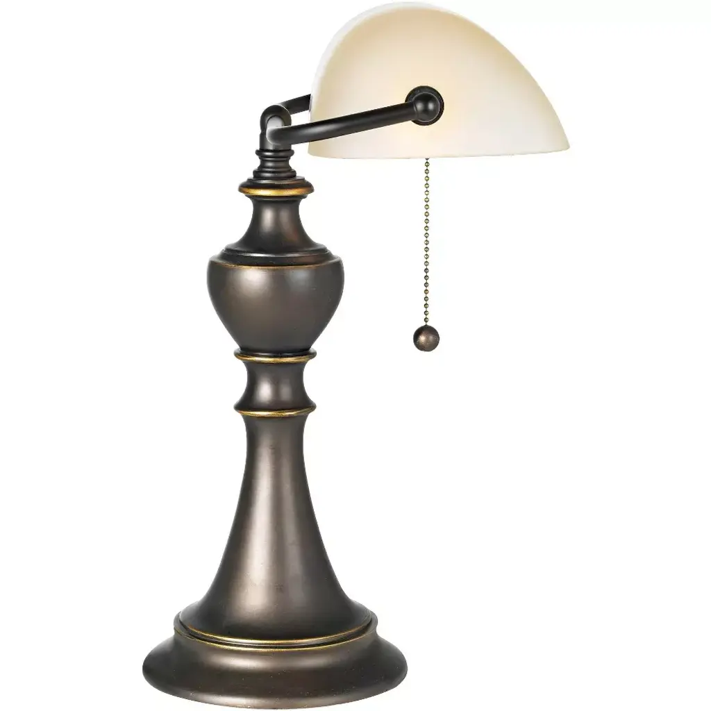 A classic look for any desk, office or reading area, this lamp has a graceful, eye-pleasing profile. It features an antique bronze finish base and champagne alabaster glass. A single on-off pull chain gives you easy lighting control. The design is ideal for use as a reading lamp or for other tasks.