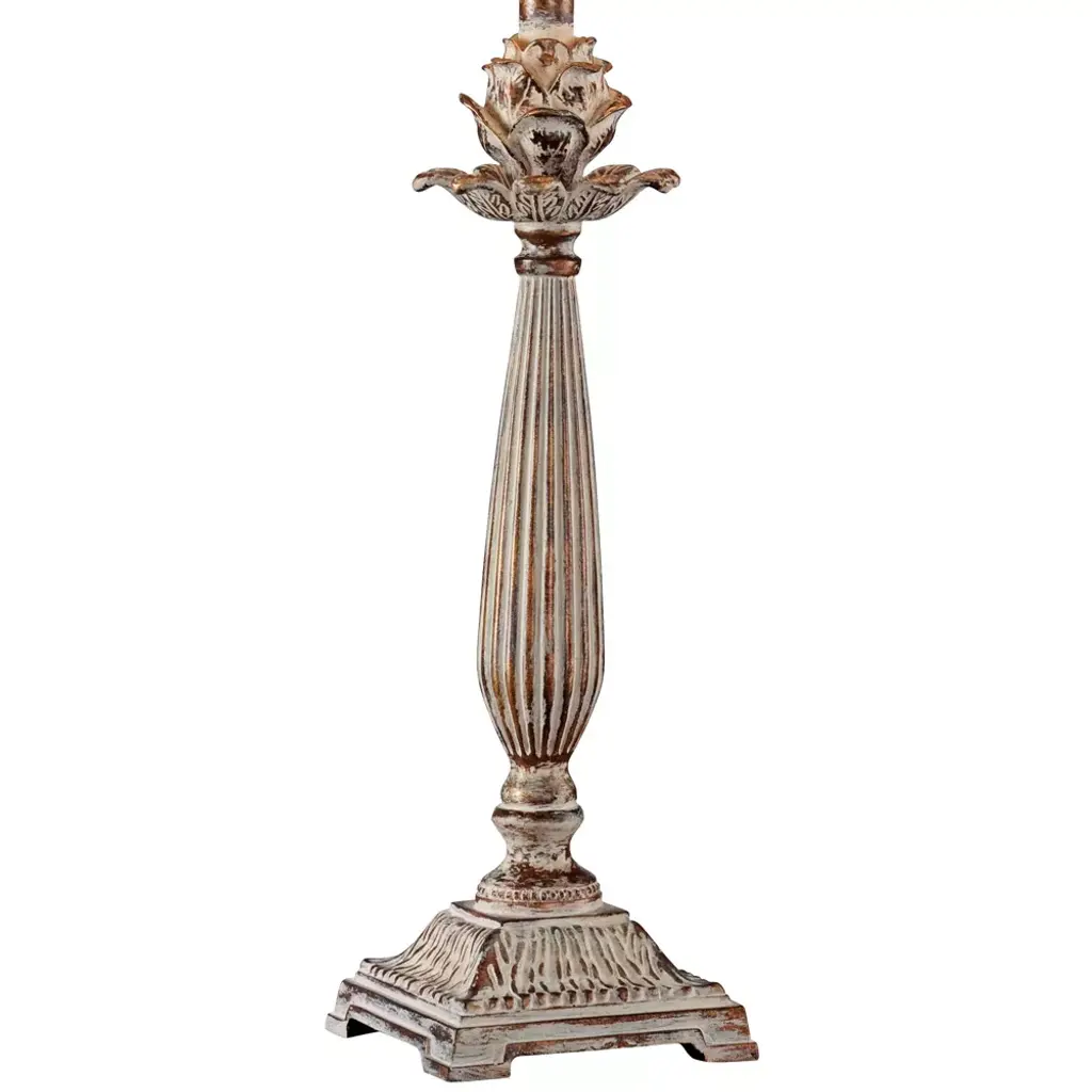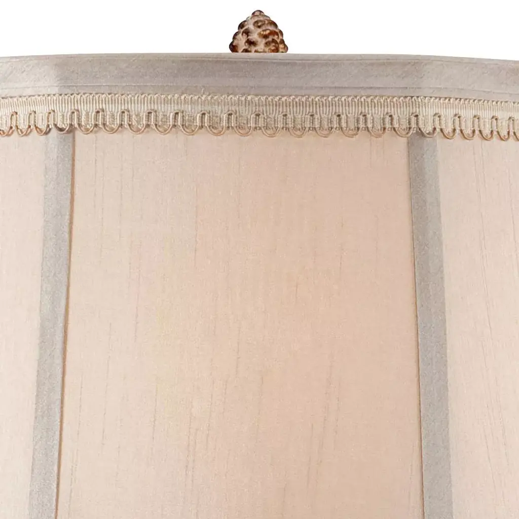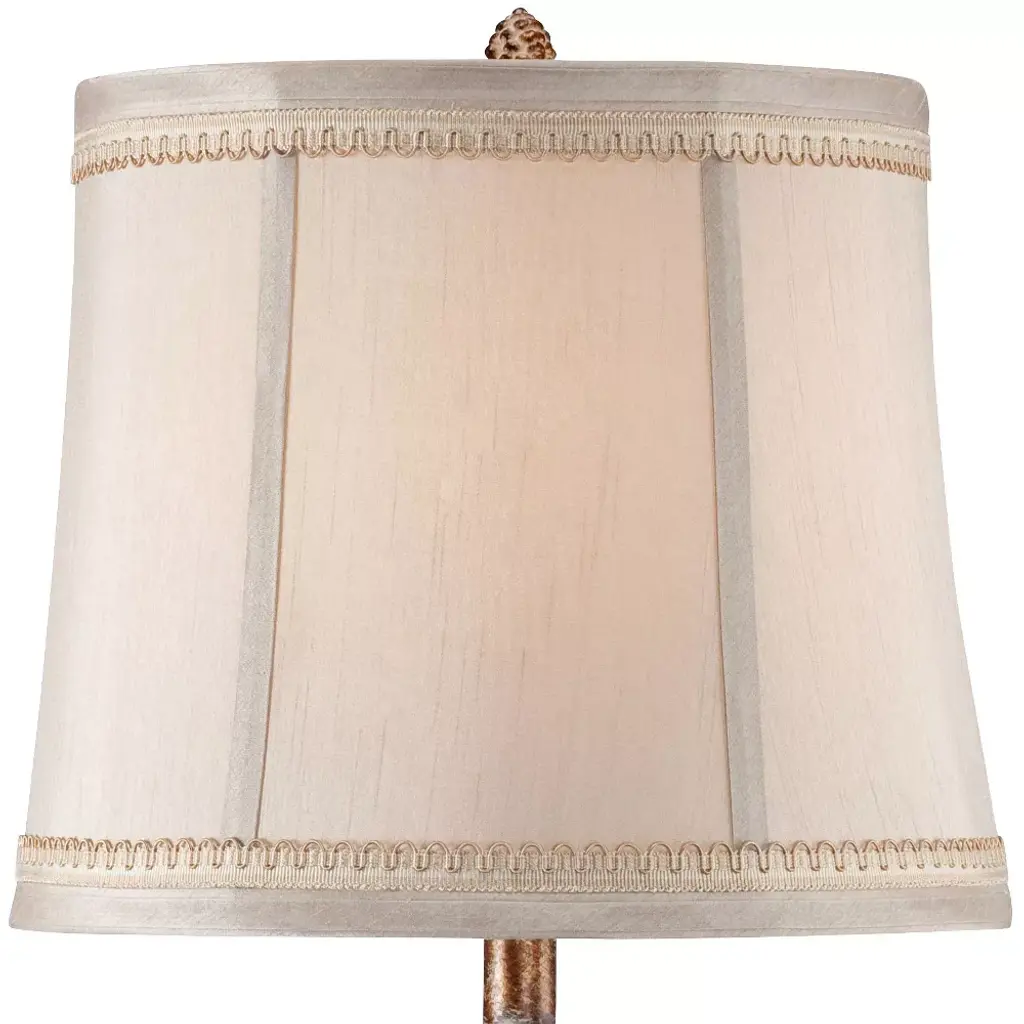 A noble artichoke font will catch your eye in this set of two traditional table lamps design. Weathered bronze finish adorns the sculpted, fluted column base, font and square stand. The soft beige fabric shade has top and bottom self-trim as well as accent embroidery. This set of two artichoke font table lamps offers an exquisite design.
