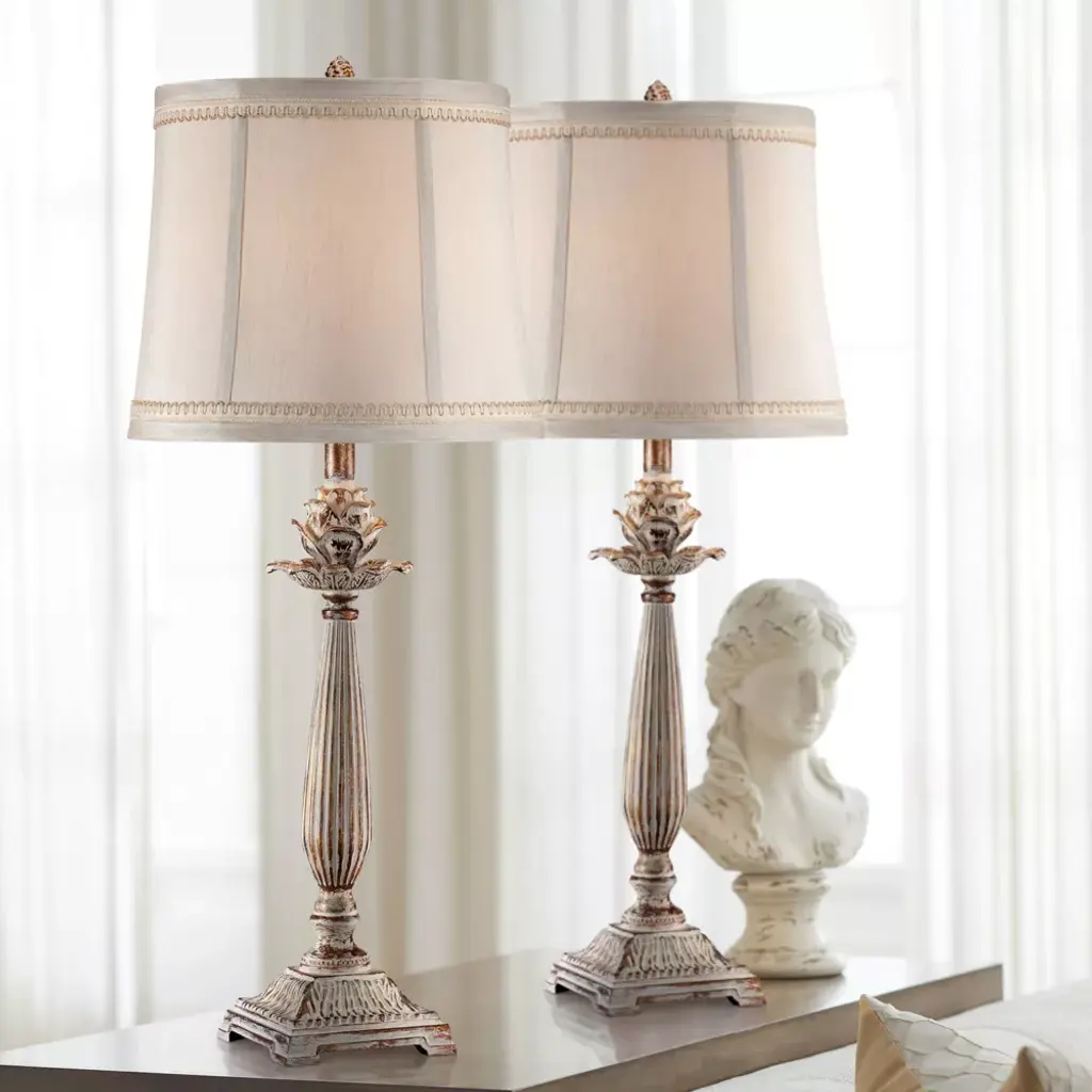Regency Hill Shabby Chic Table Lamps 28" Tall Set Of 2 Antique White Washed Petite Artichoke Font Beige Fabric Bell Shade For Living Room