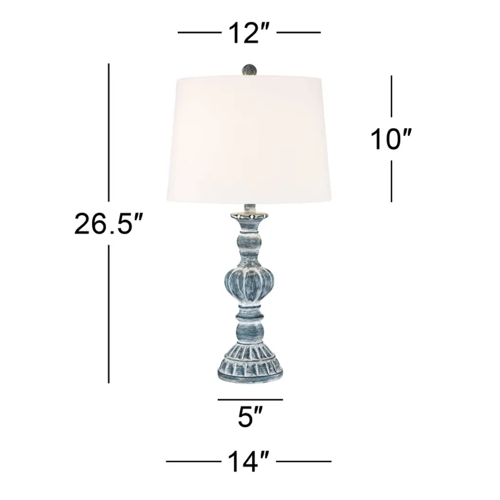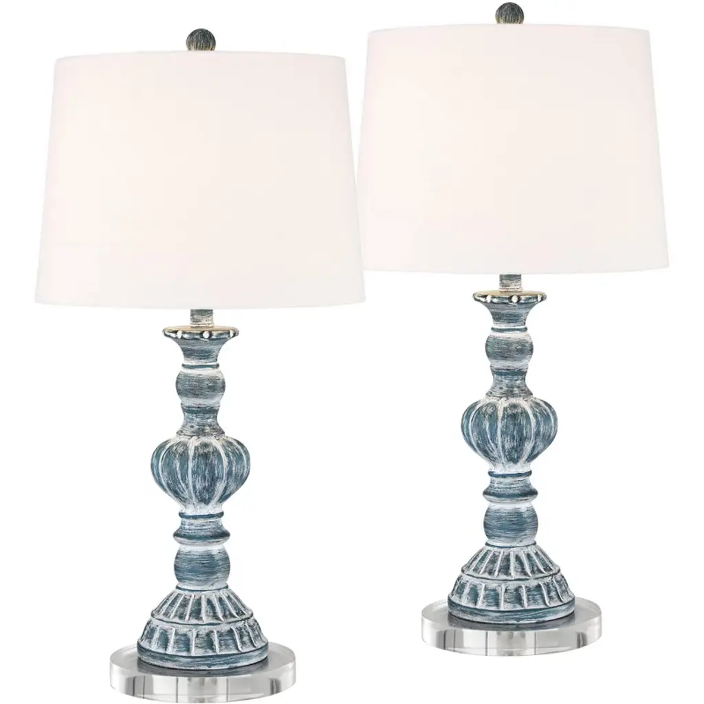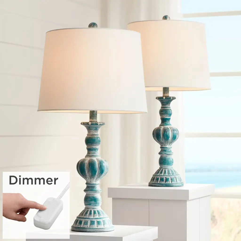 Traditional shape gets a modern makeover with the pop of color on this set of two table lamps from Regency Hill. Constructed of polyresin, the vintage-inspired silhouette features a blue wash finish over its intricate shapes and defined lines. Radiate warmth throughout any space with a flip of the on-off switches. This lamp set comes with two tabletop dimmers, one for each lamp, which allows you to control the level of lighting. Simply insert the lamp plug into the dimmer outlet, and then slide the switch on the control to dim or brighten the lighting. Dimmers are compatible with halogen and incandescent bulbs, and most dimmable CFL and LED bulb designs.