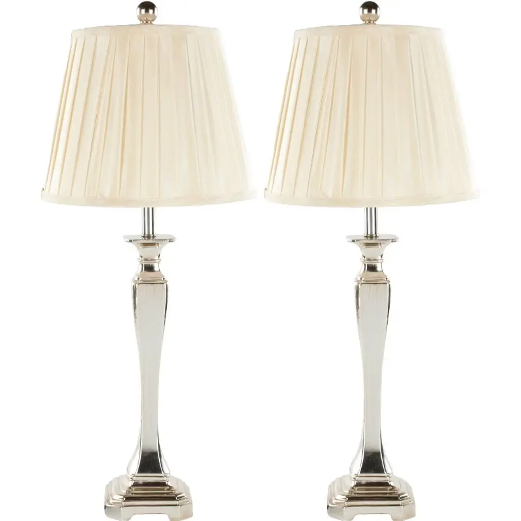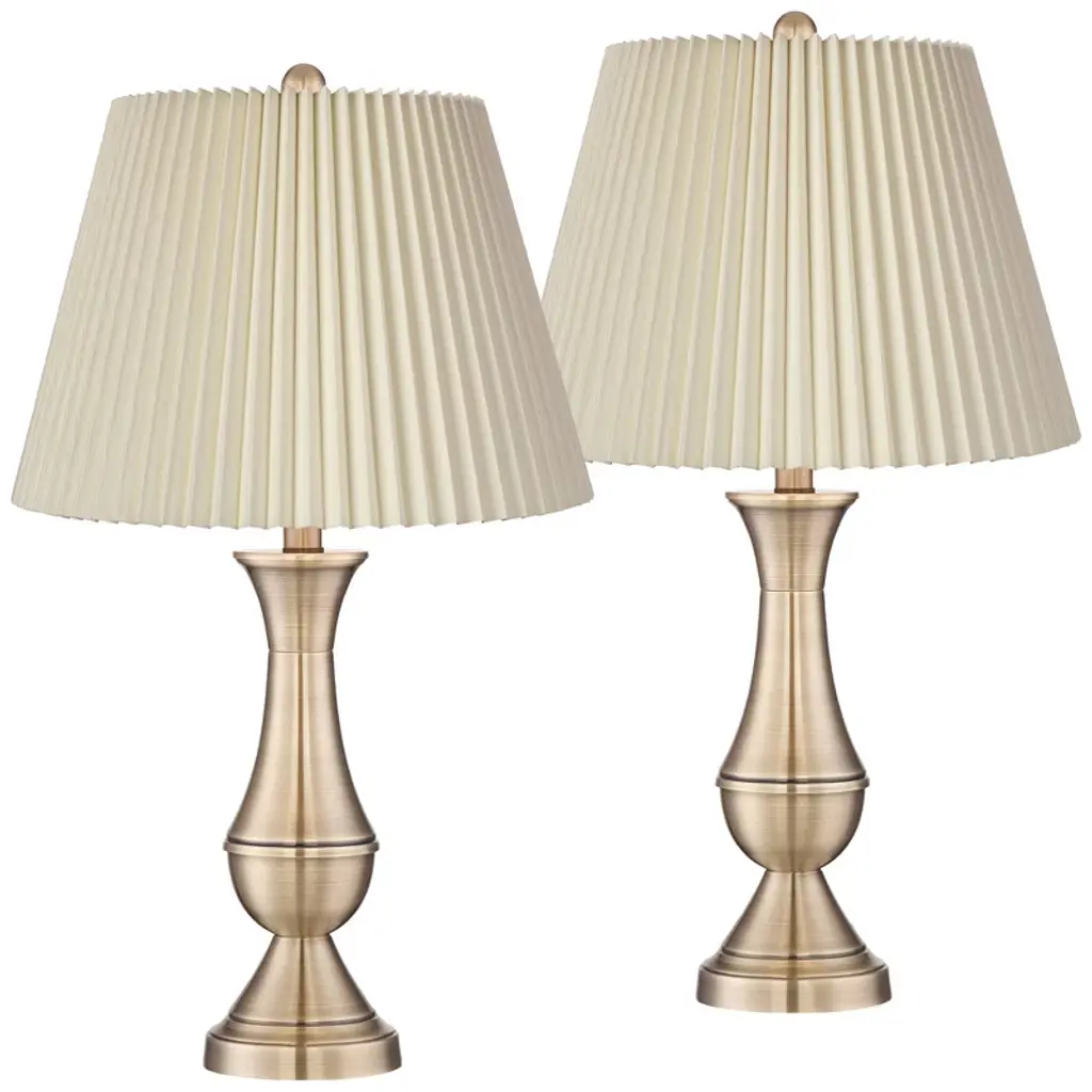 Traditional shape gets a modern makeover with the pop of color on this set of two country cottage table lamps from Regency Hill. Constructed of polyresin, the vintage-inspired silhouette features a blue wash finish over its intricate shapes and defined lines. Shirred, oyster drum shades are a dimensional touch. Radiate warmth throughout any space with a flip of the on-off switches. Each lamp also comes with a bonus shade in a white fabric that you can use if you wish.