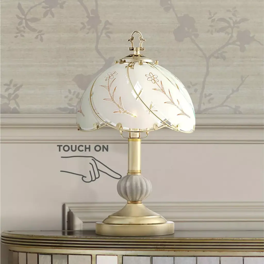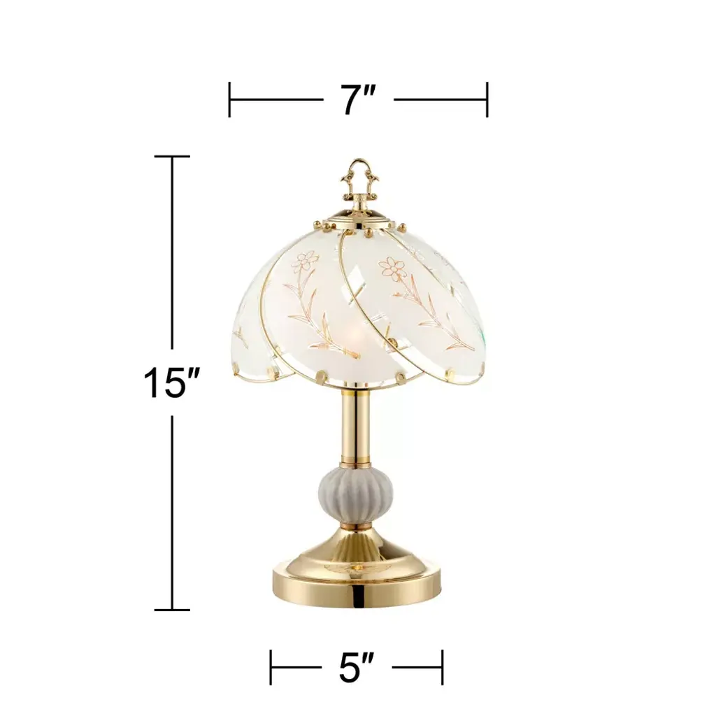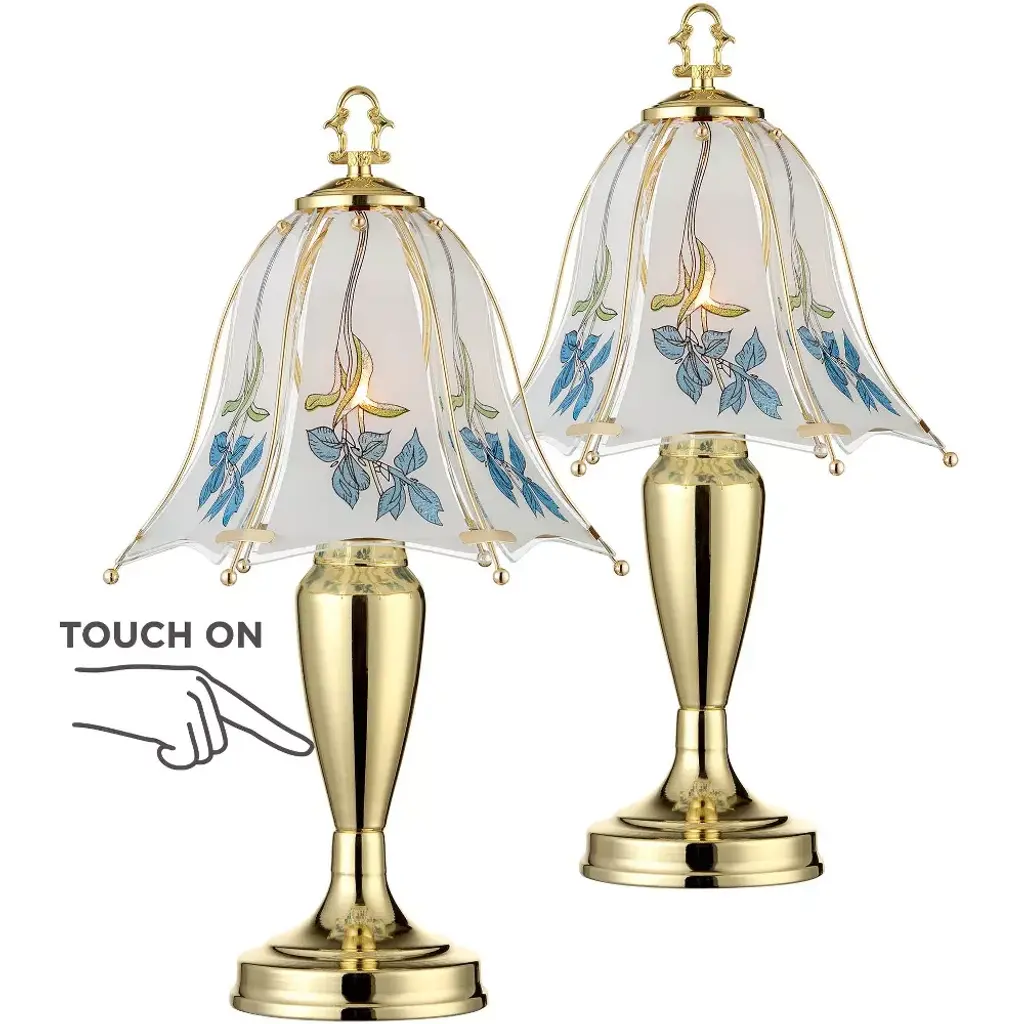 This set of two charming, romantic accent table lamps in polished brass brings an extra layer of charm. Flower-motif etched shade and porcelain center accent. Unique design allows you simply to touch the base to turn on and off.