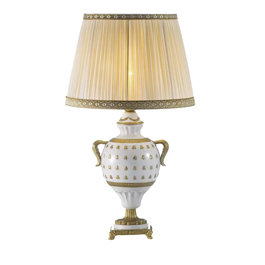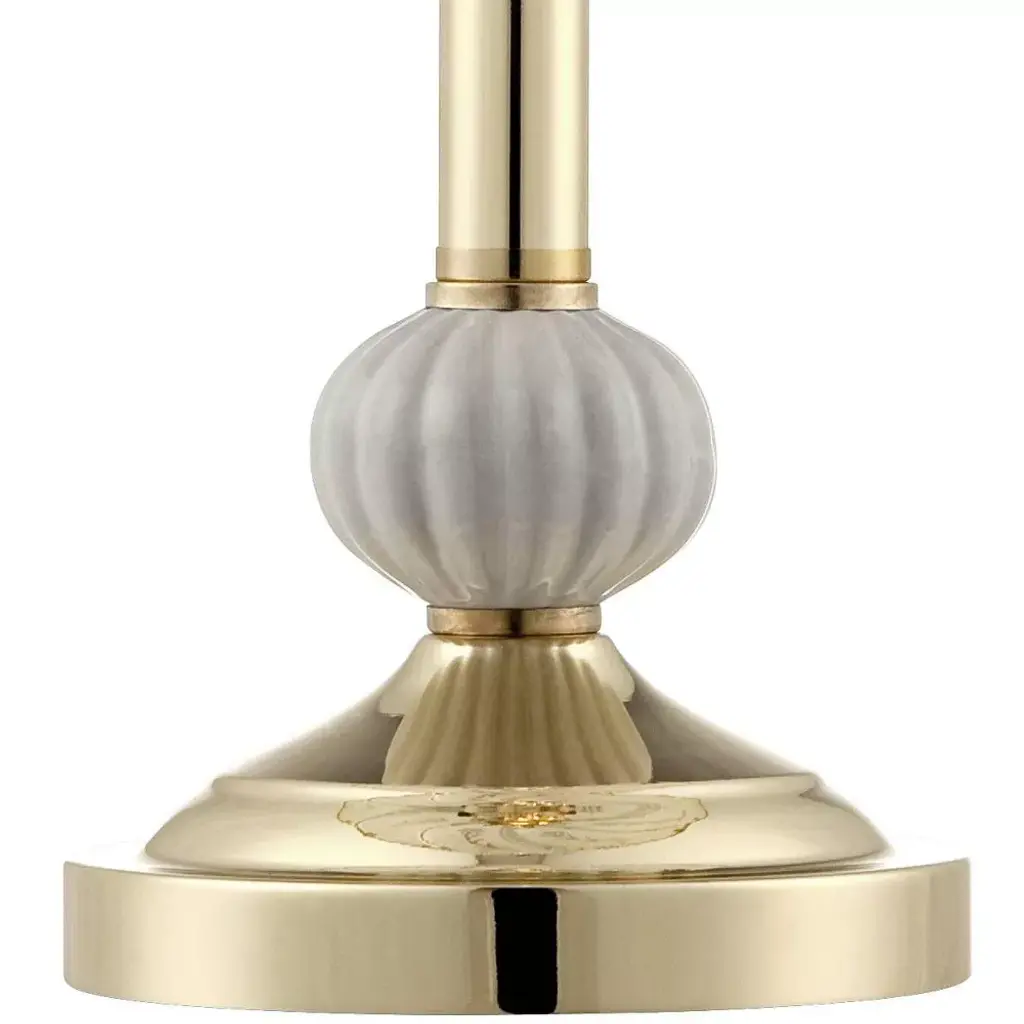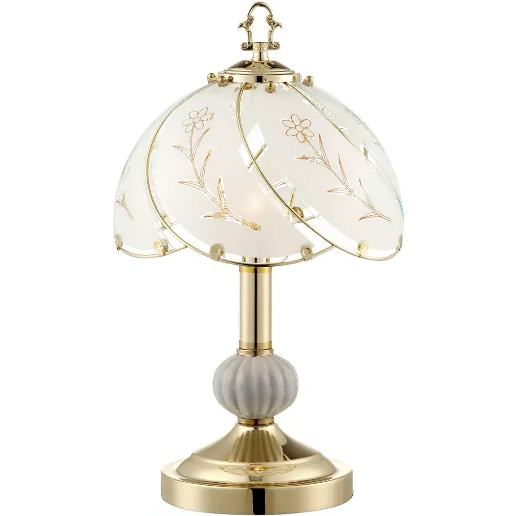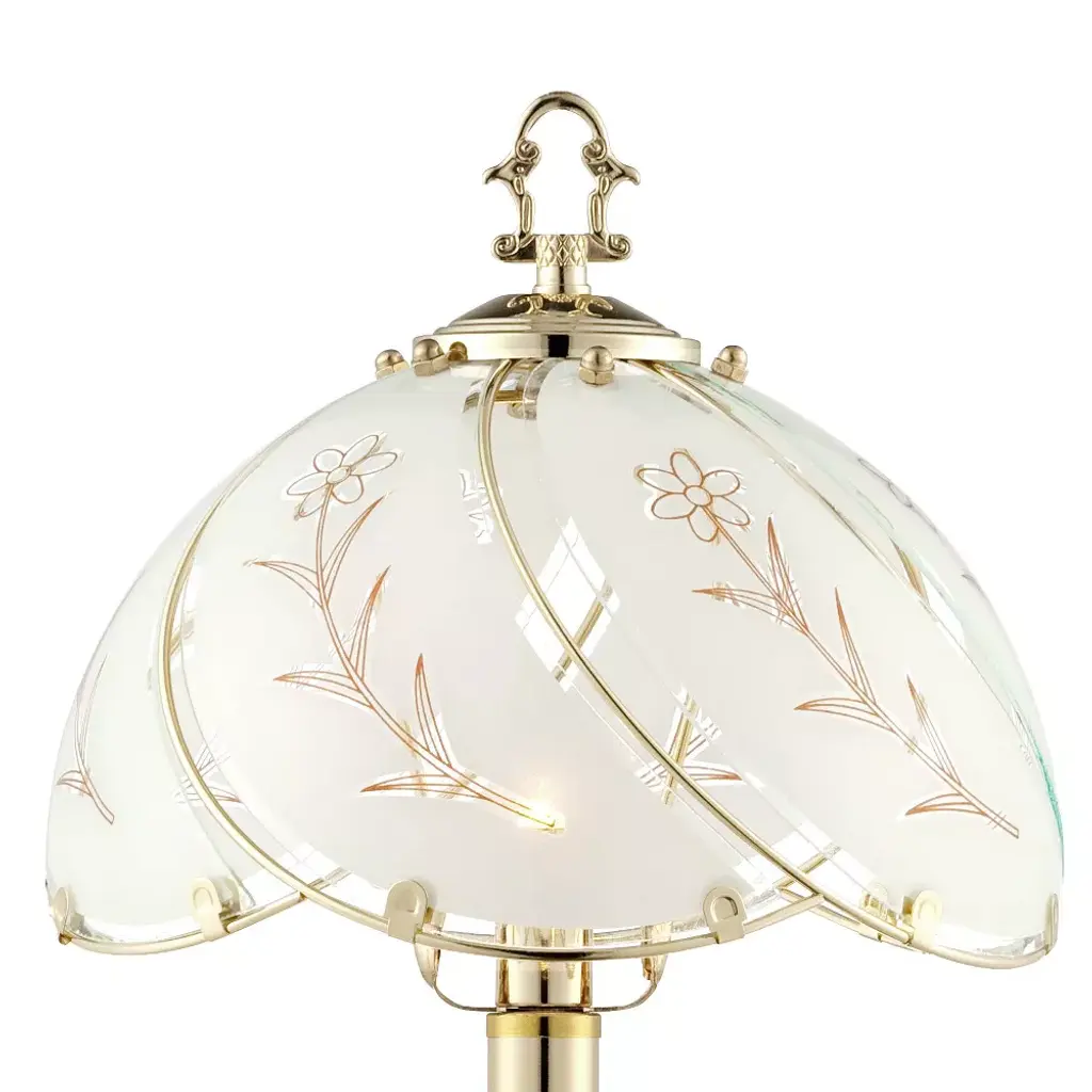 This set of two charming, romantic accent table lamps in polished brass brings an extra layer of charm. Flower-motif etched shade and porcelain center accent. Unique design allows you simply to touch the base to turn on and off.