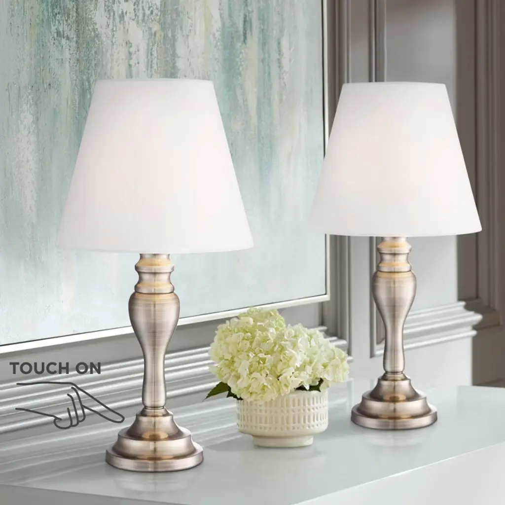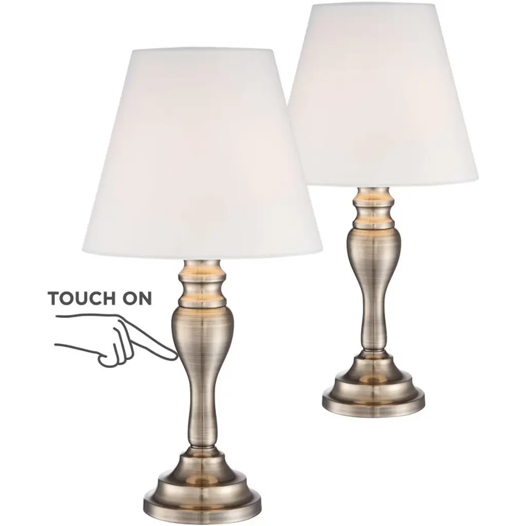 This classic touch lamp set will illuminate any living room or bedroom in style. From the Regency Hill brand of lighting, the lamps have a touch operation feature; simply touch anywhere on the base to turn them on and off. The matching lamps have a traditional candlestick profile, metal base in a brass finish. Each is topped with a bell-shaped lamp shade.